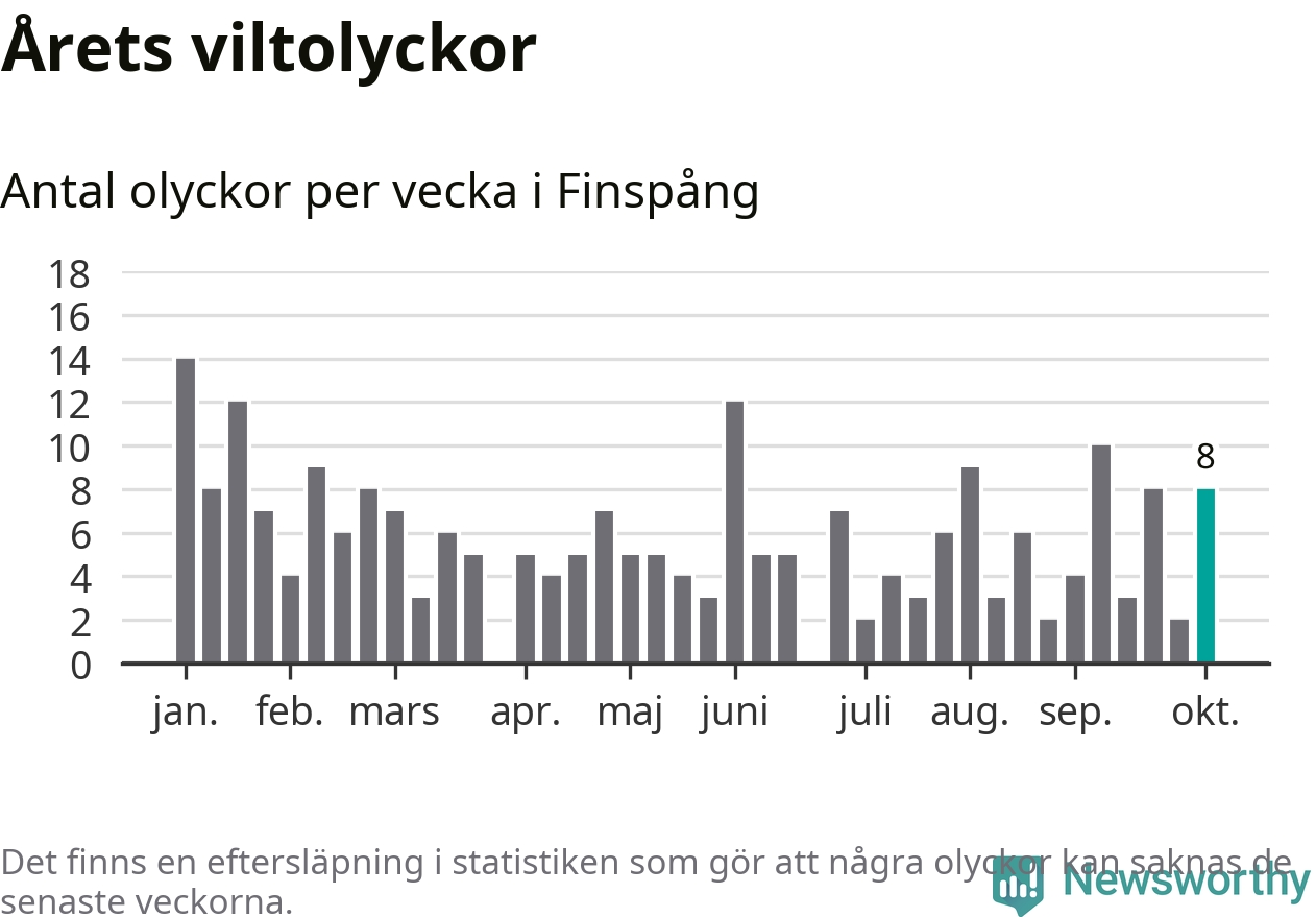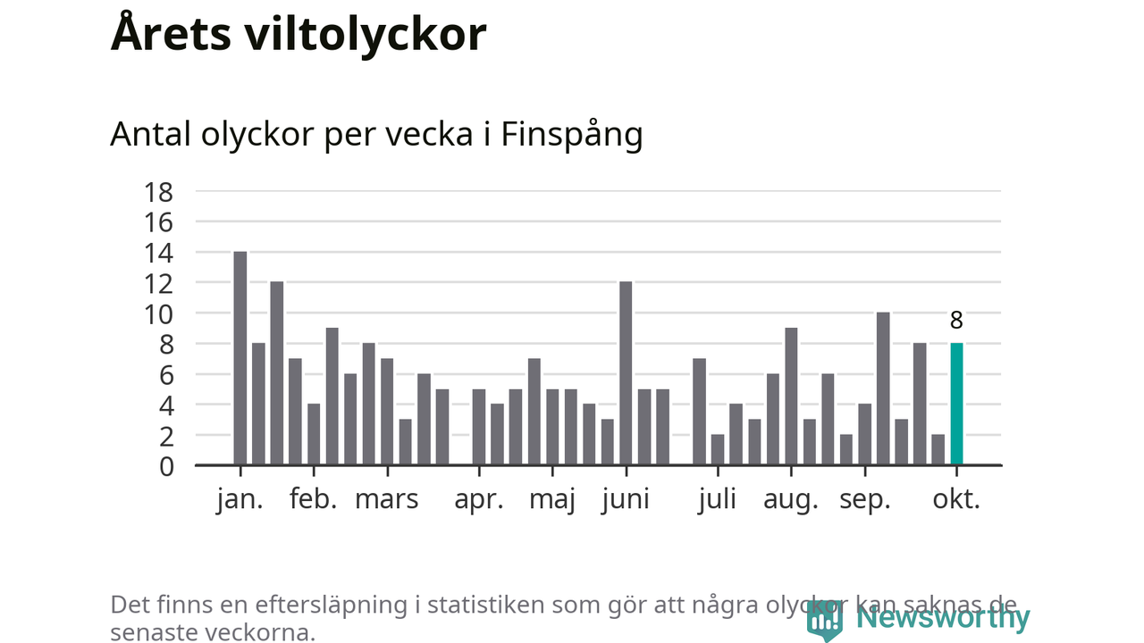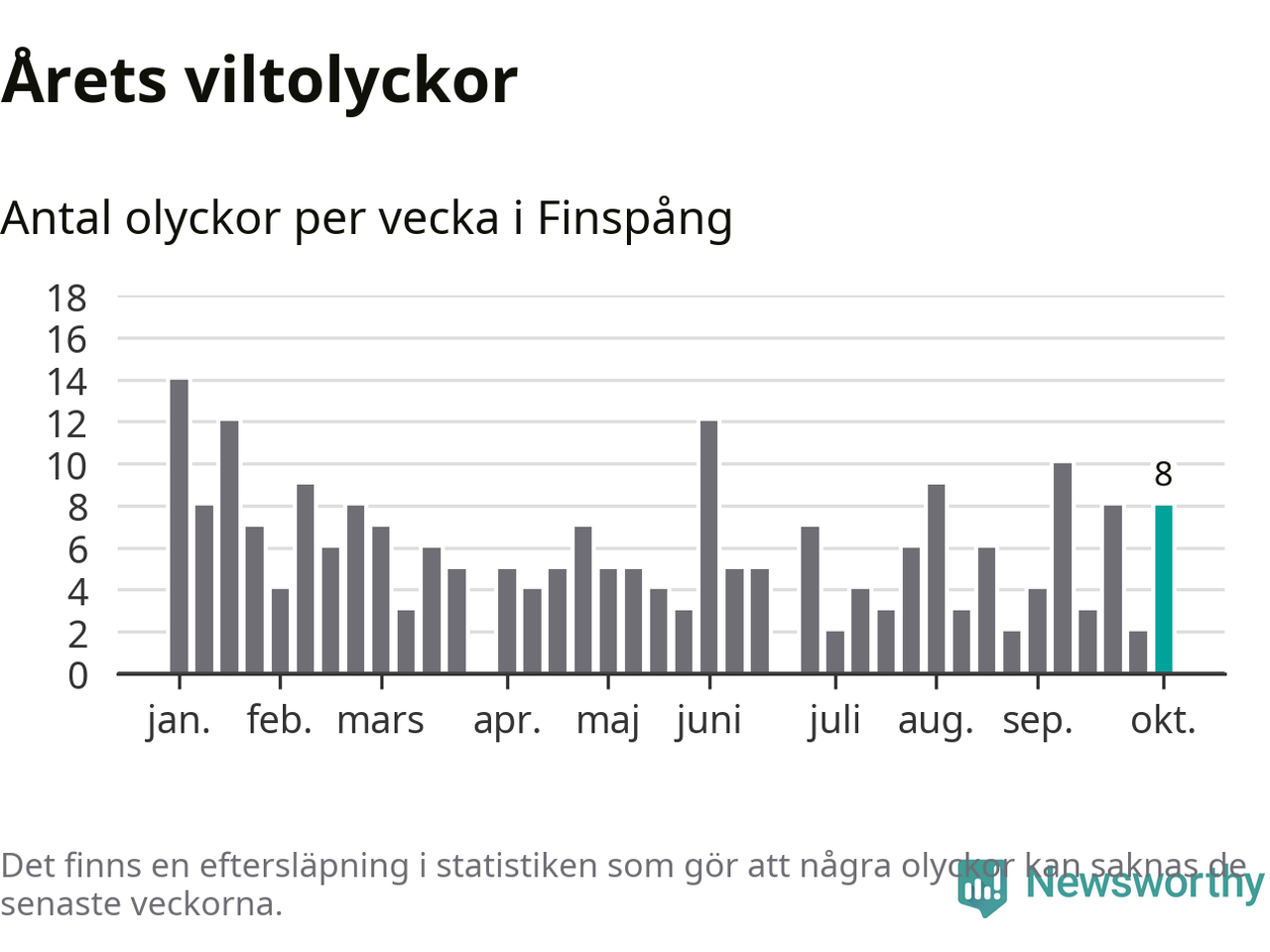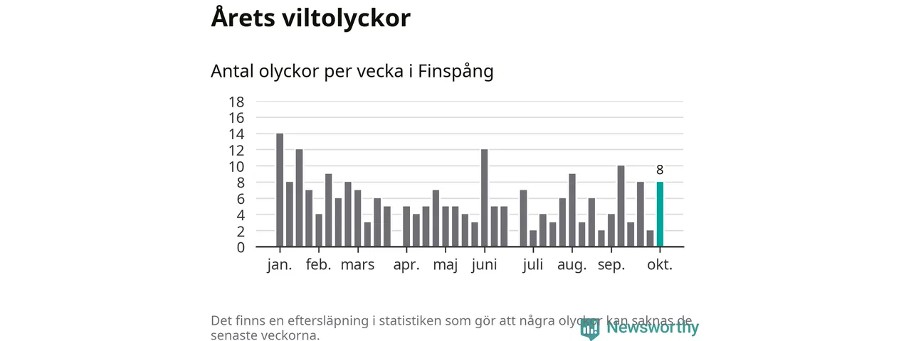 Hittills har åtta viltolyckor rapporterats in i Finspångs kommun från vecka 41. Se listan här.
