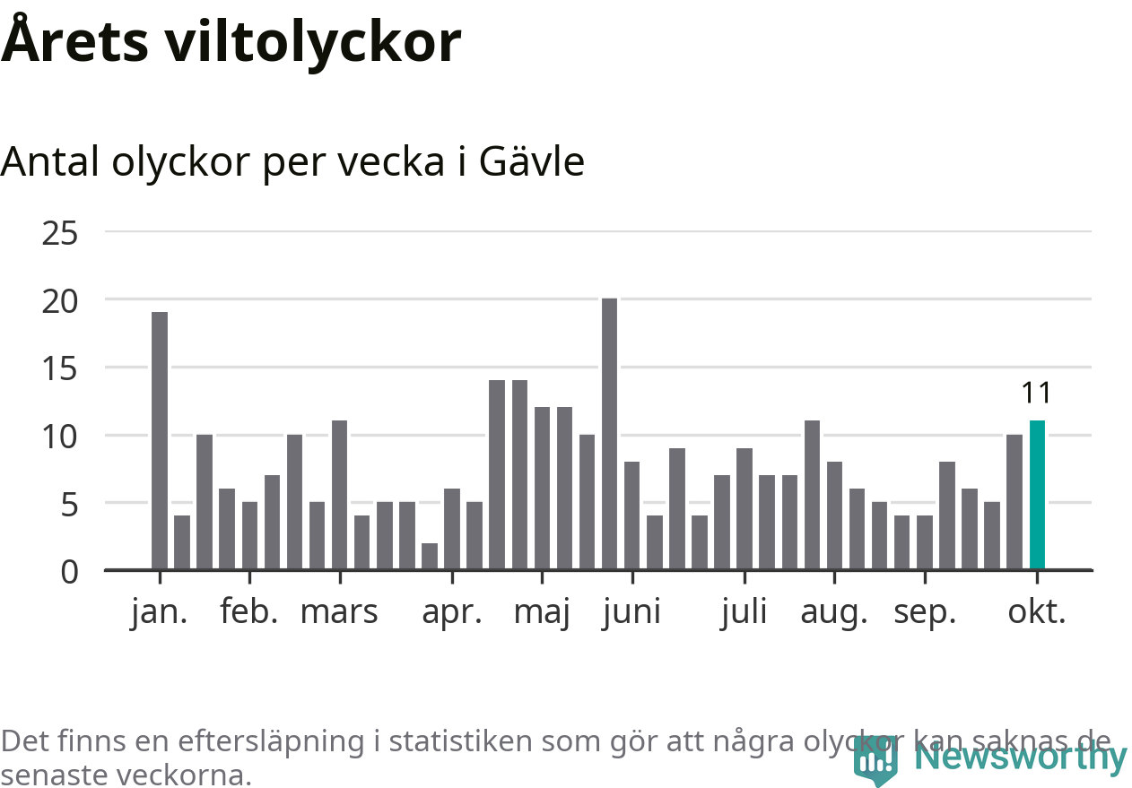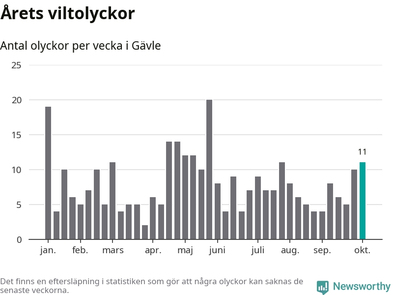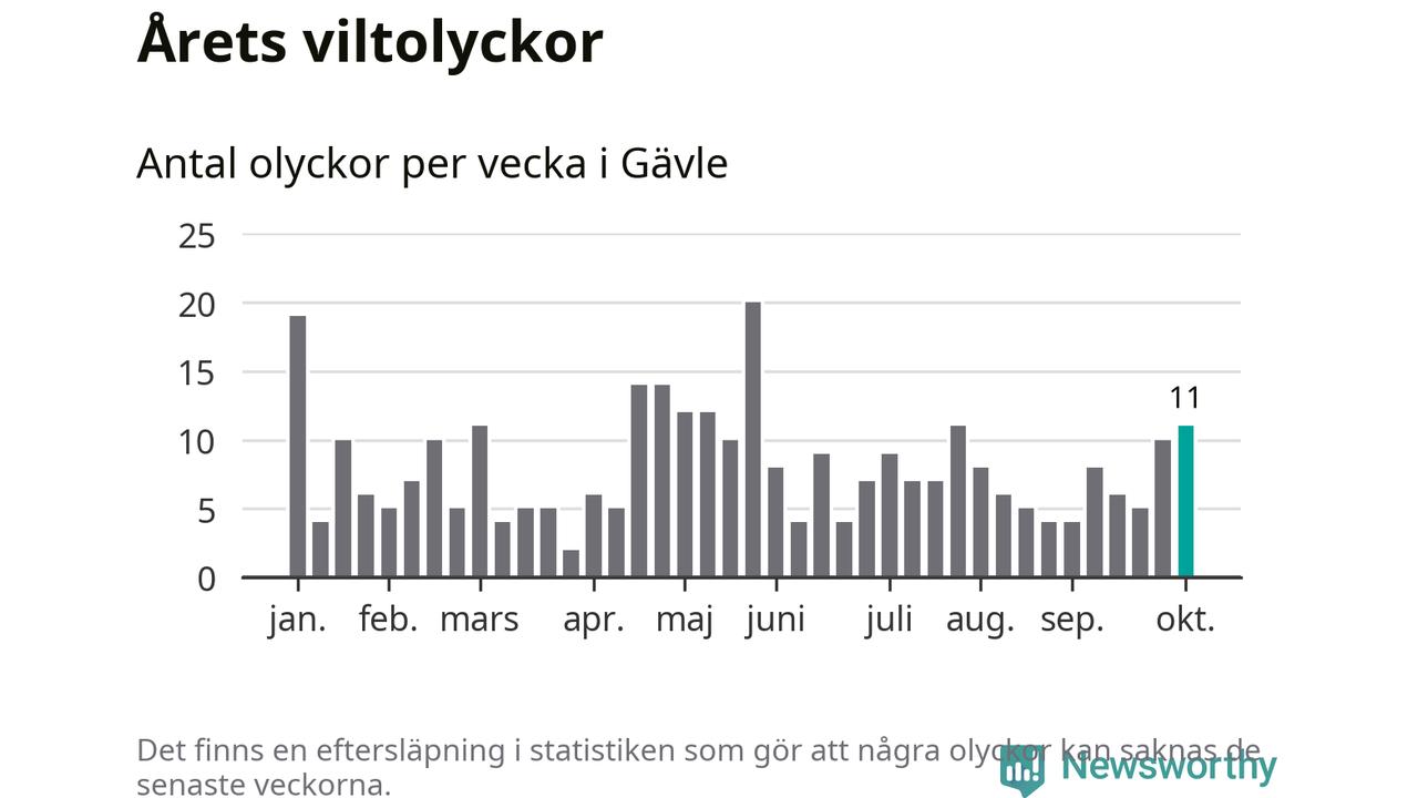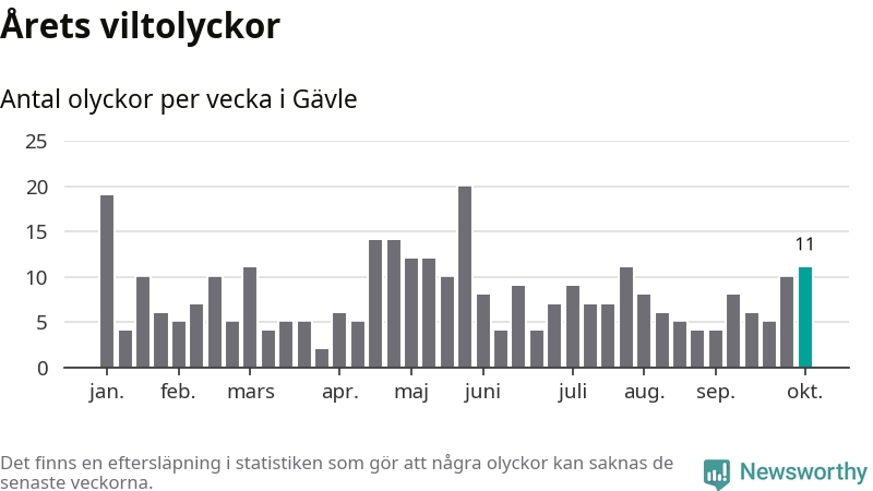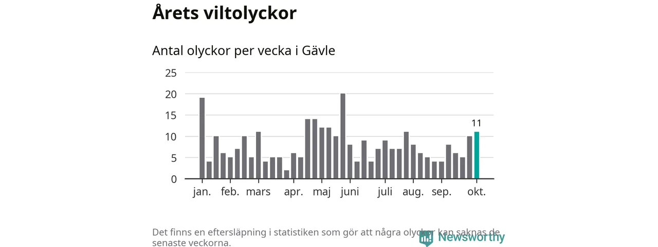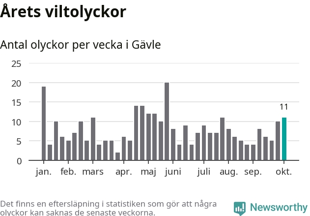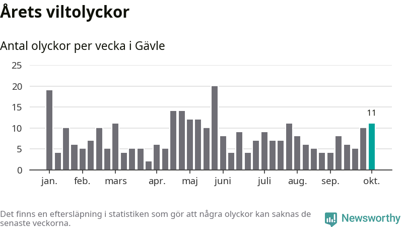Hittills har elva viltolyckor rapporterats in i Gävle kommun från vecka 41. Se listan här.