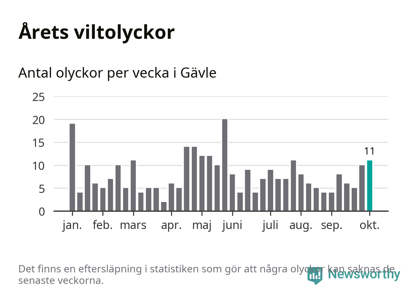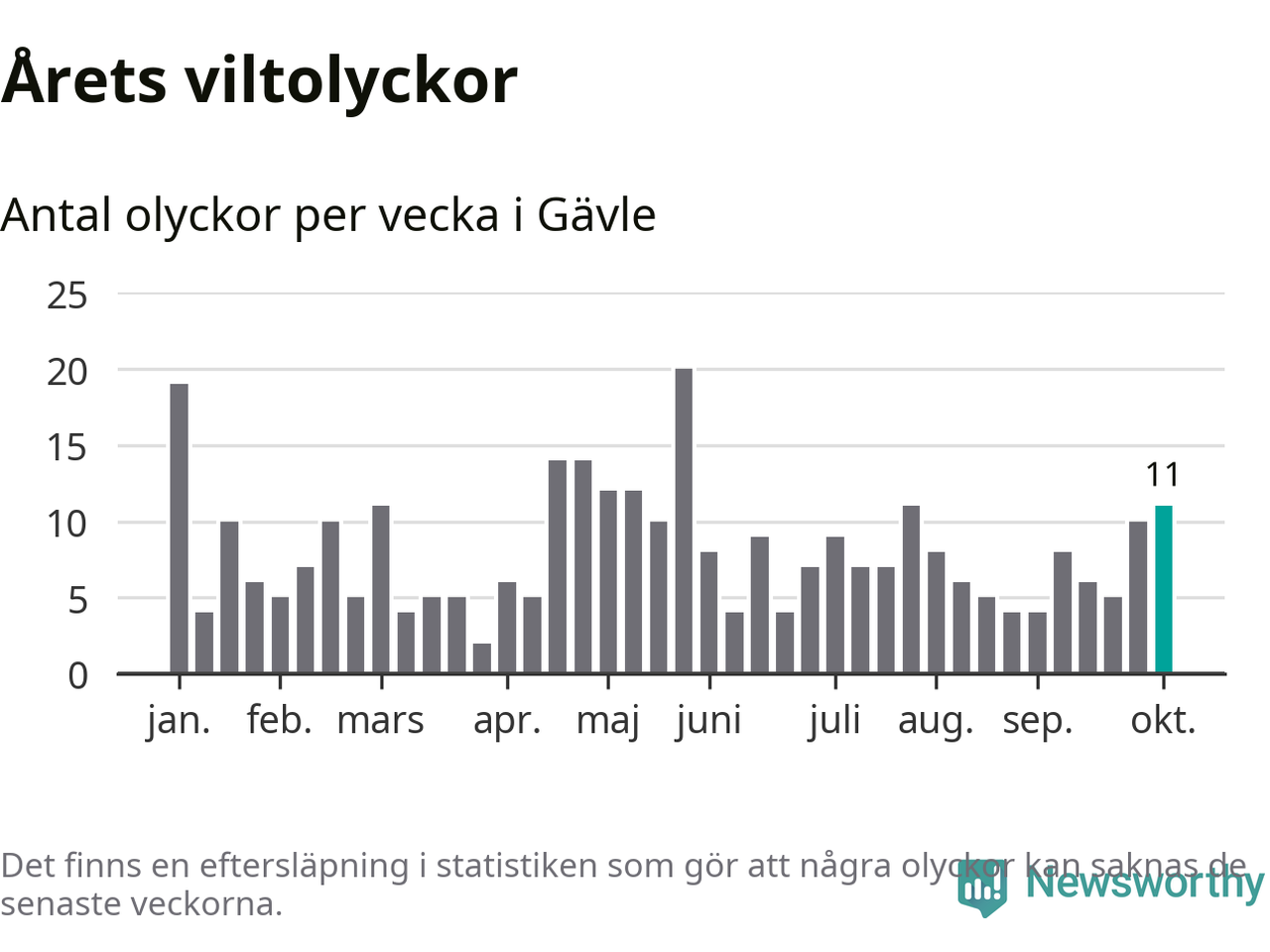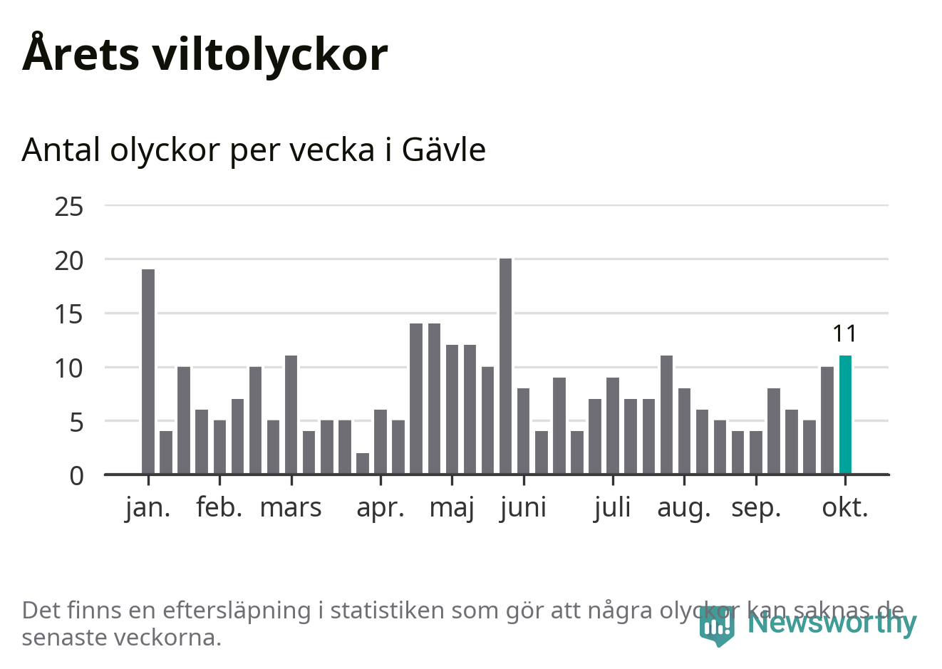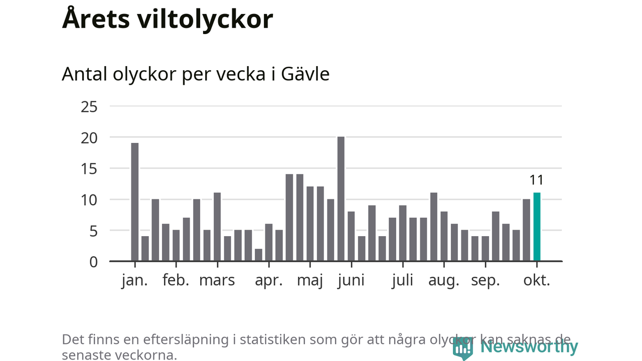 Totalt det här året har det inträffat 331 viltolyckor i kommunen. Det är mer än genomsnittet för motsvarande period (omkring 283) de senaste tio åren.