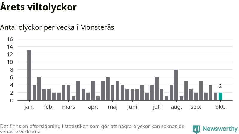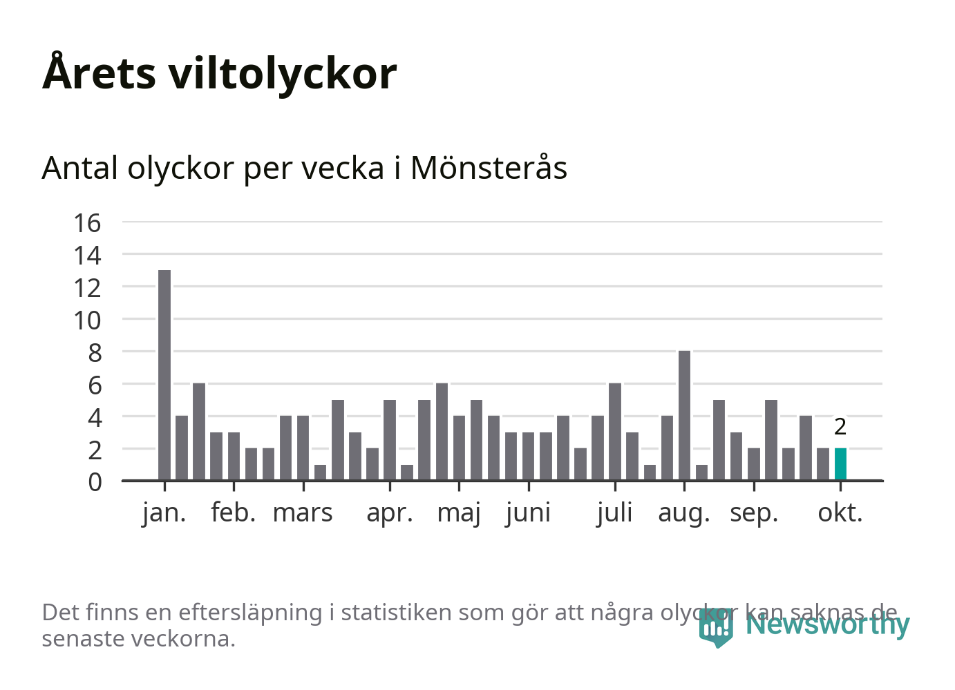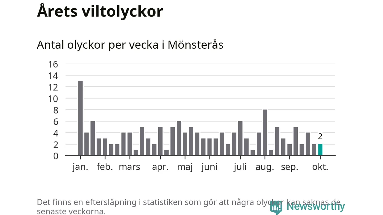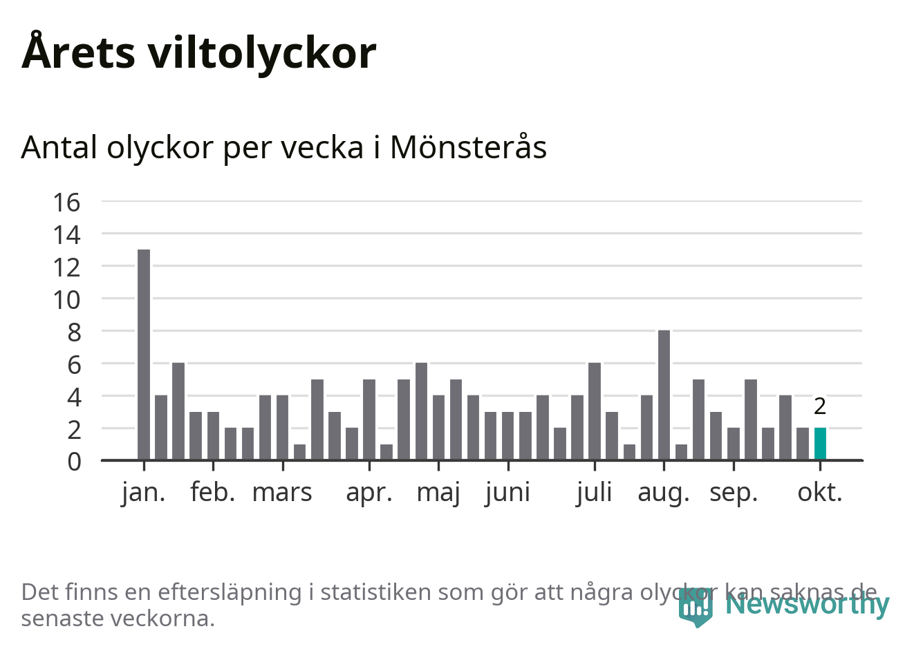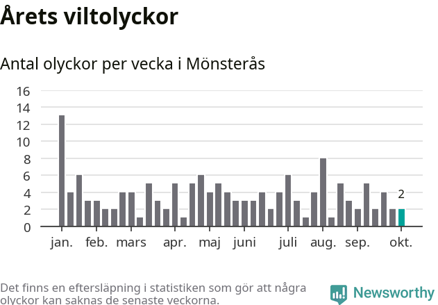 Hittills har två viltolyckor rapporterats in i Mönsterås kommun från vecka 41. Se listan här.