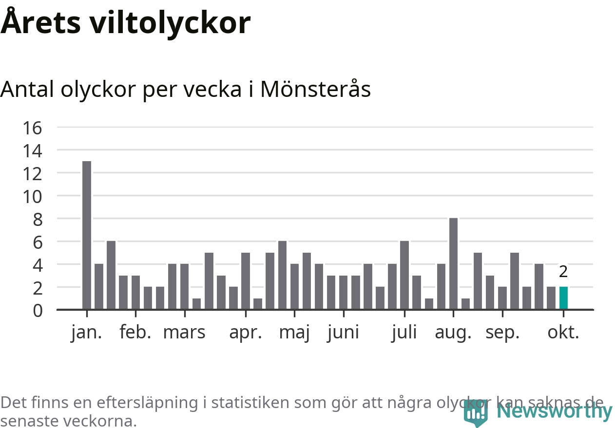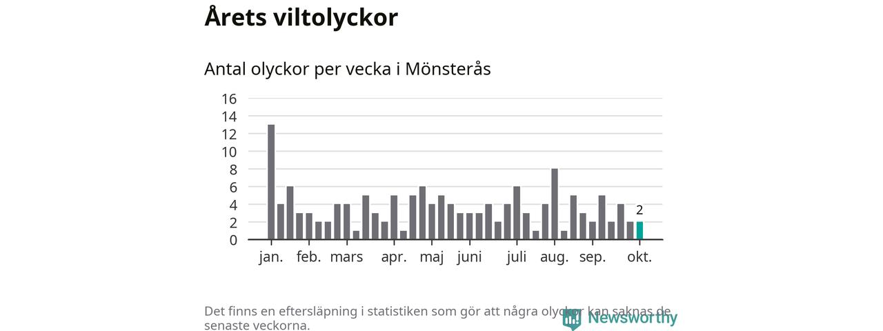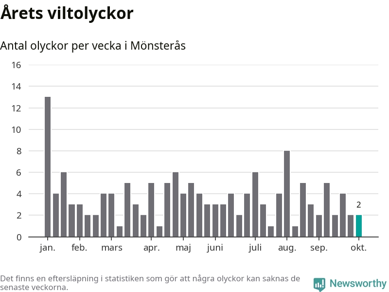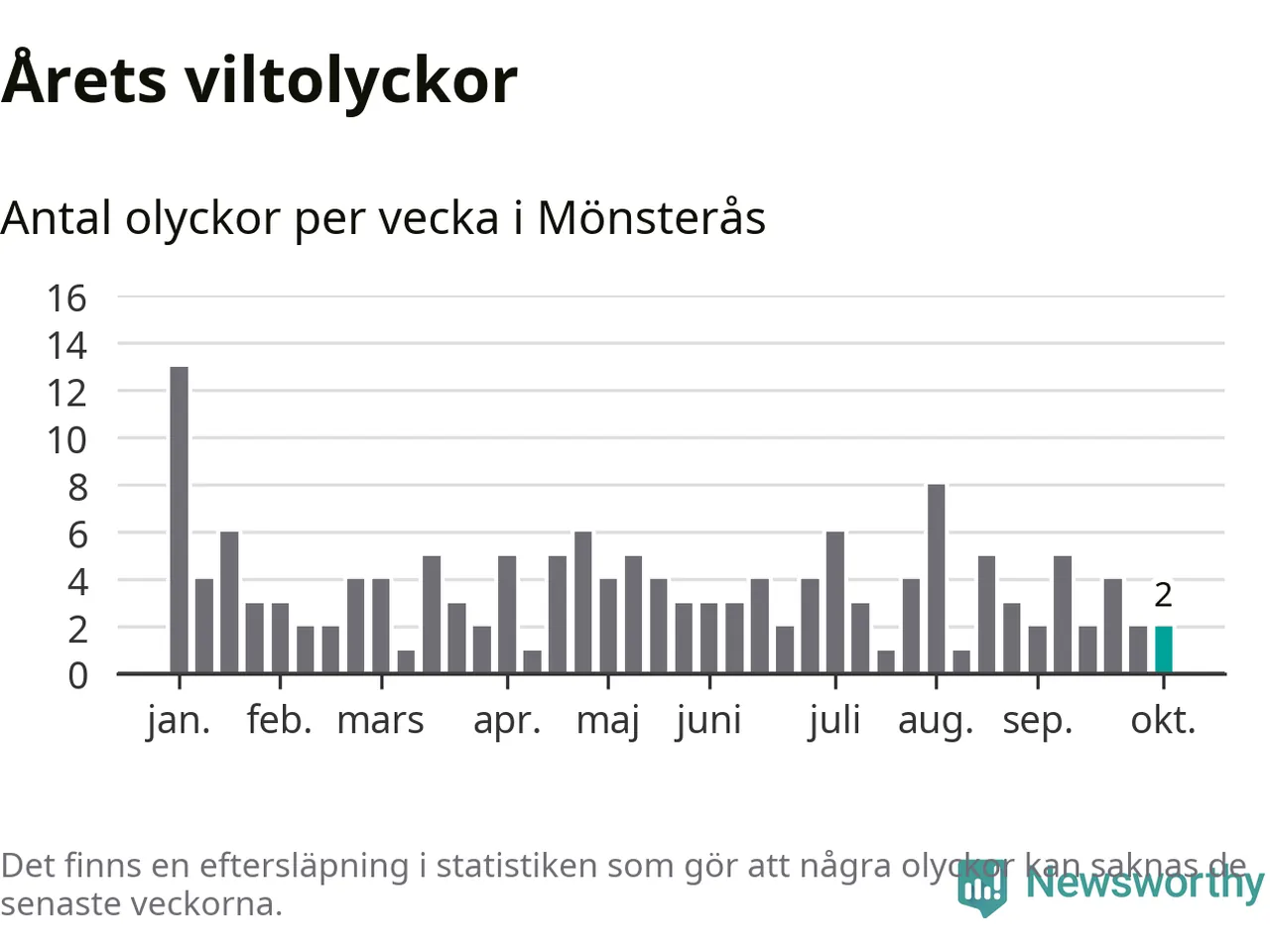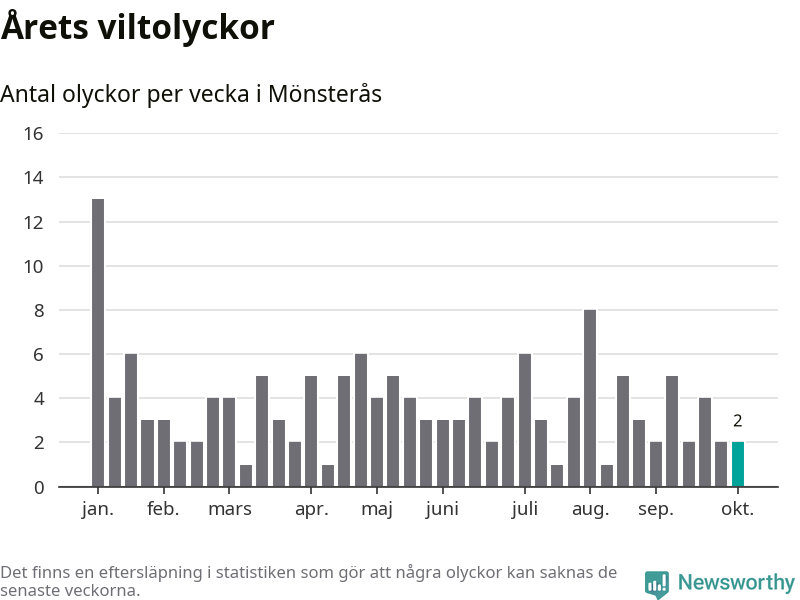 Hittills har två viltolyckor rapporterats in i Mönsterås kommun från vecka 41. Se listan här.