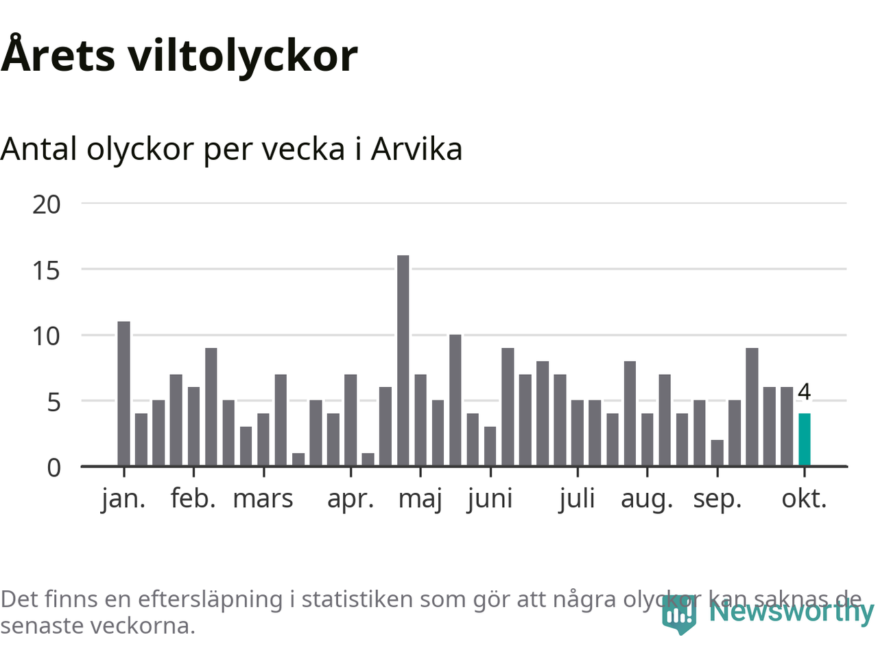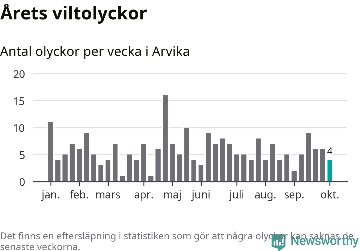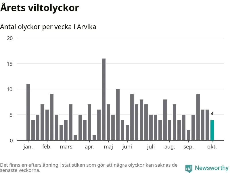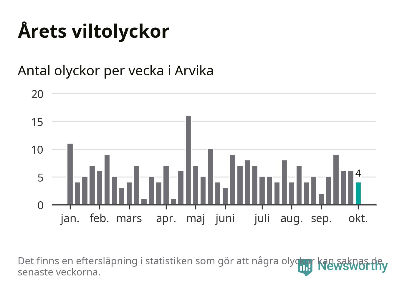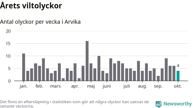 Hittills har fyra viltolyckor rapporterats in i Arvika kommun från vecka 41. Se listan här.