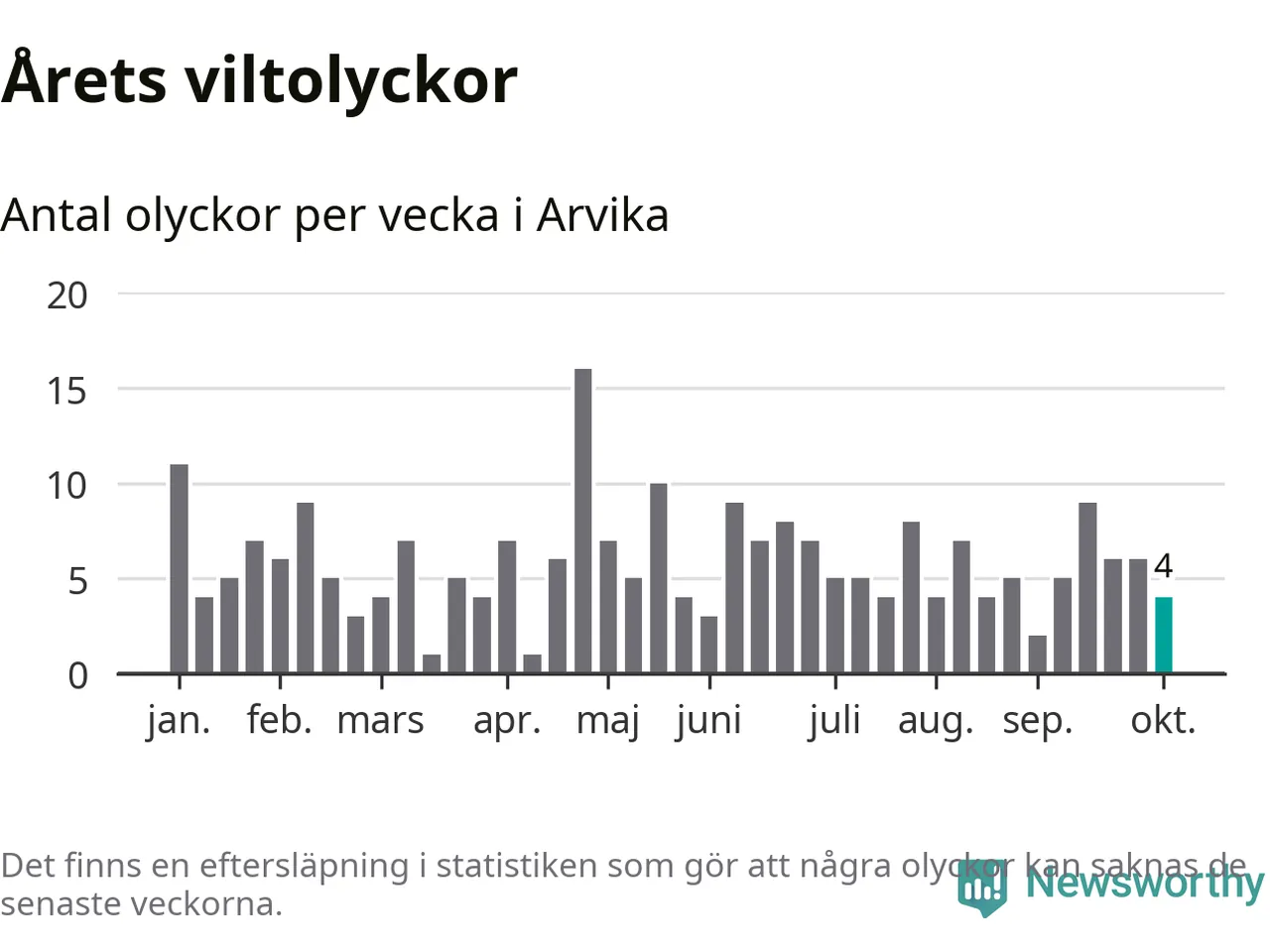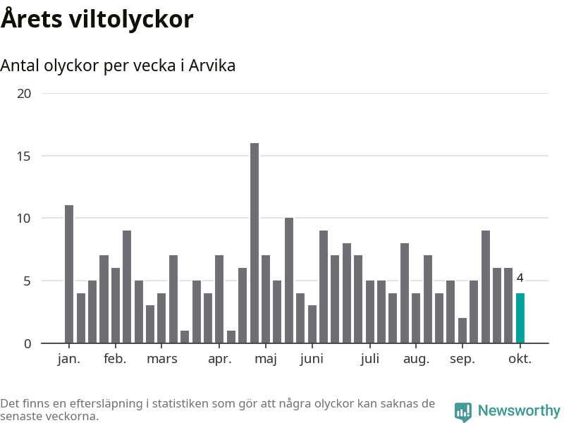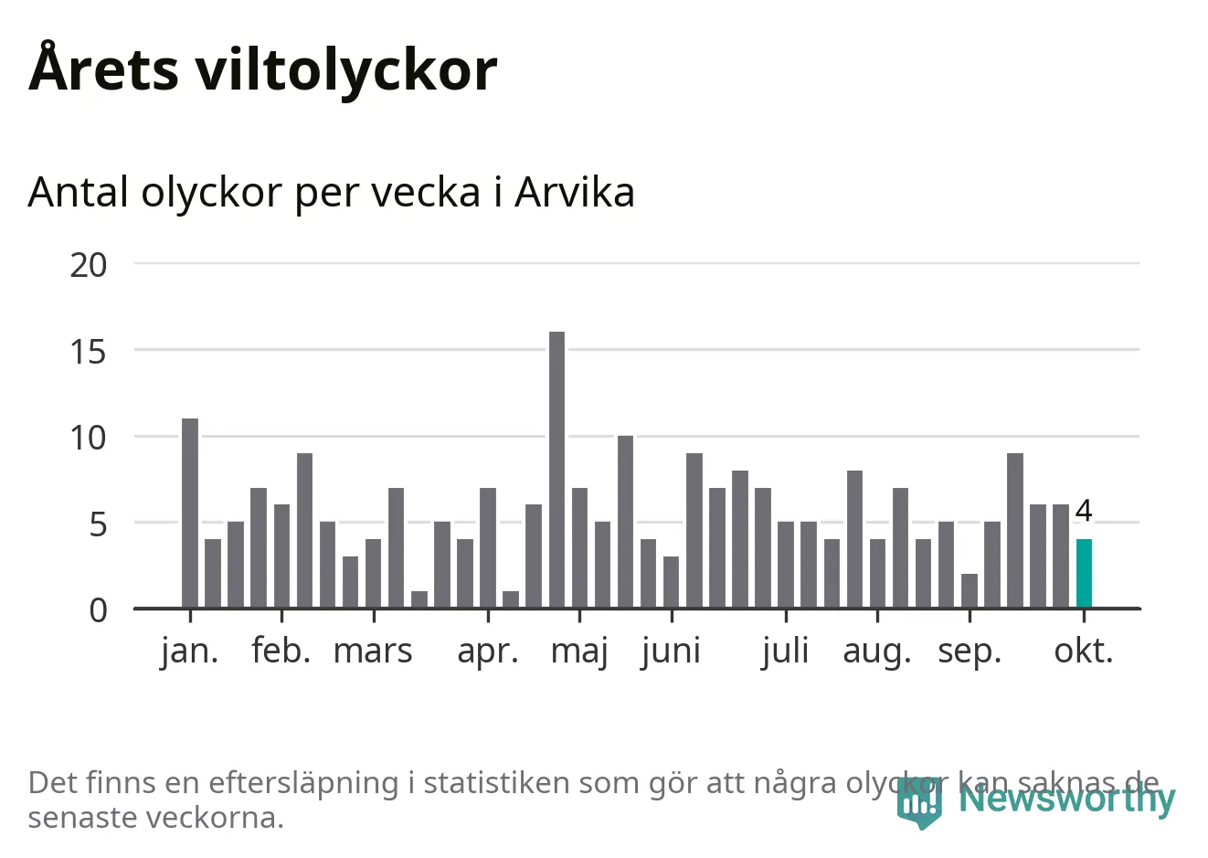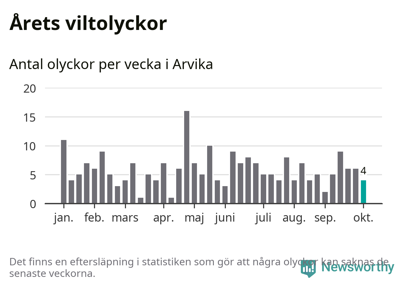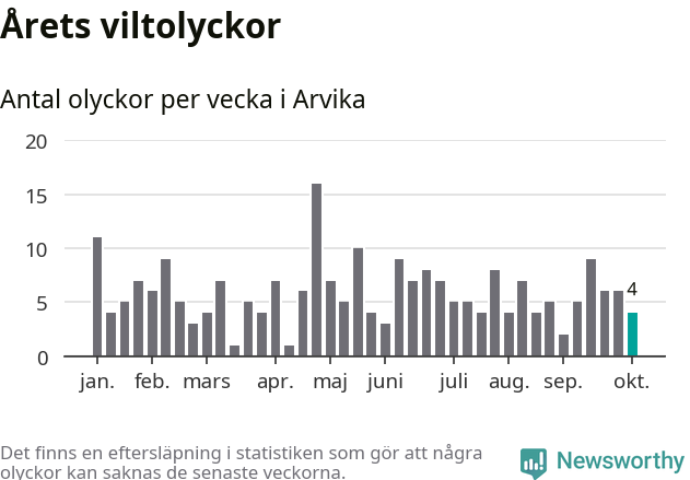 Totalt det här året har det inträffat 242 viltolyckor i kommunen. Det är en normal nivå i förhållande till hur det har sett ut under de senaste tio åren – genomsnittet för motsvarande period är 231.