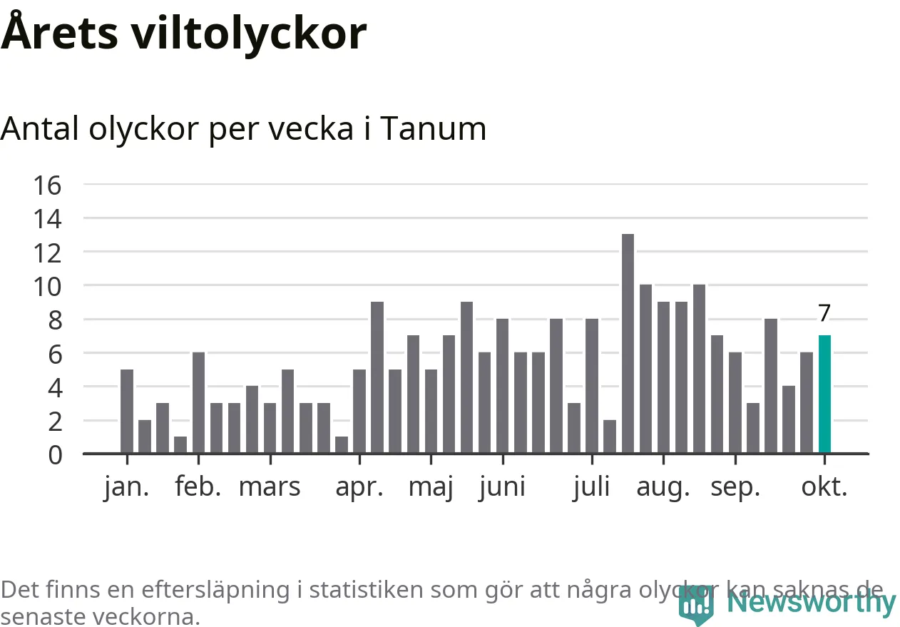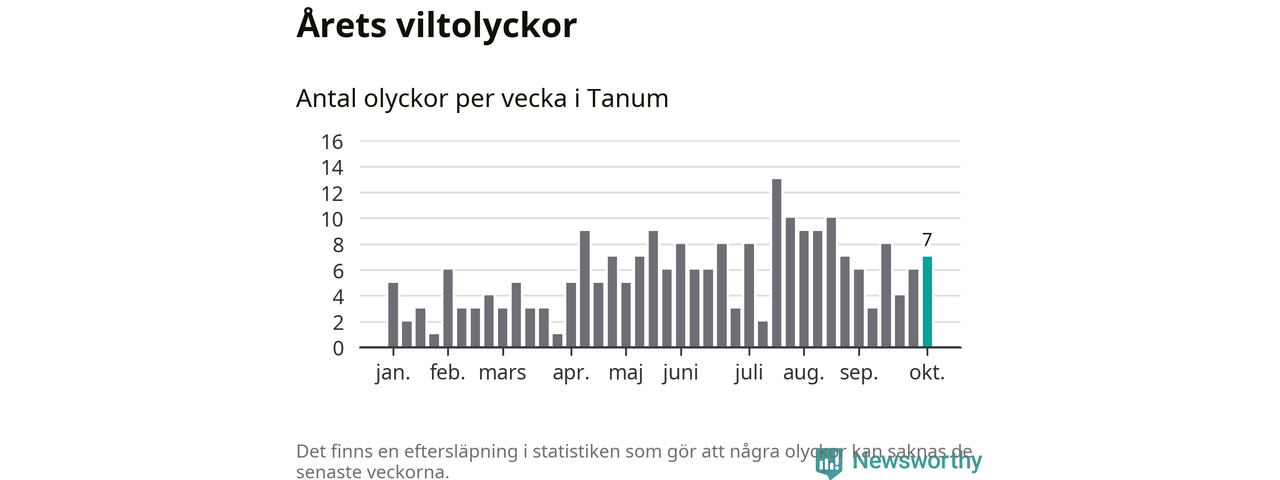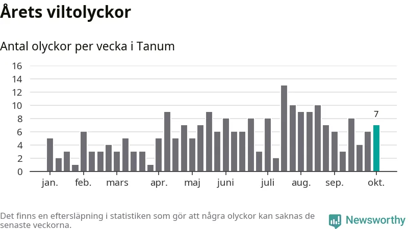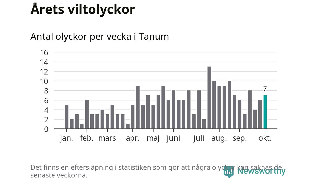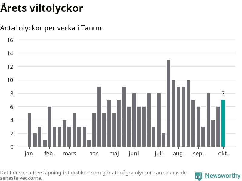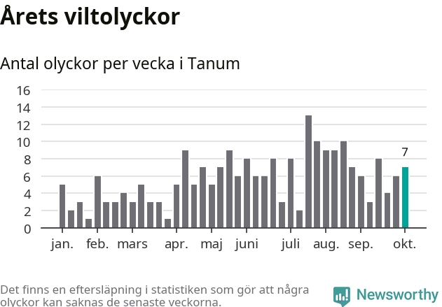 Hittills har sju viltolyckor rapporterats in i Tanums kommun från vecka 41. Se listan här.