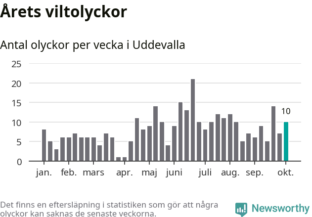 Hittills har tio viltolyckor rapporterats in i Uddevalla kommun från vecka 41. Se listan här.
