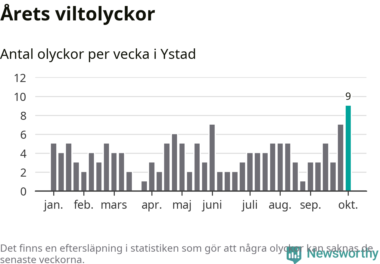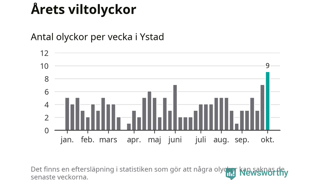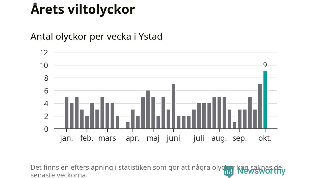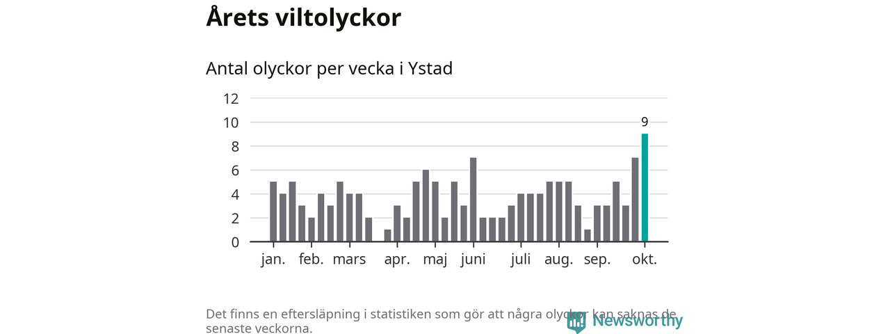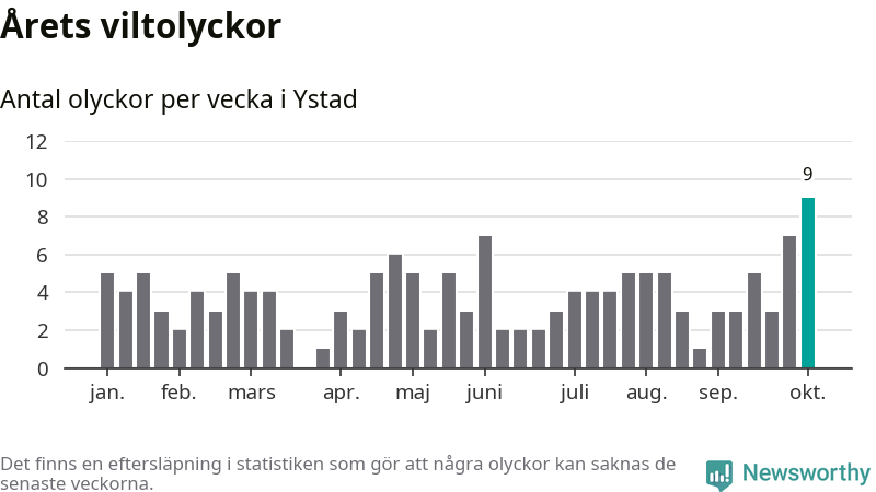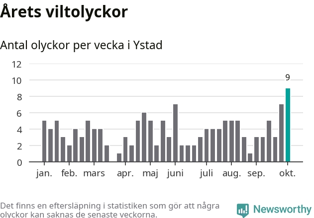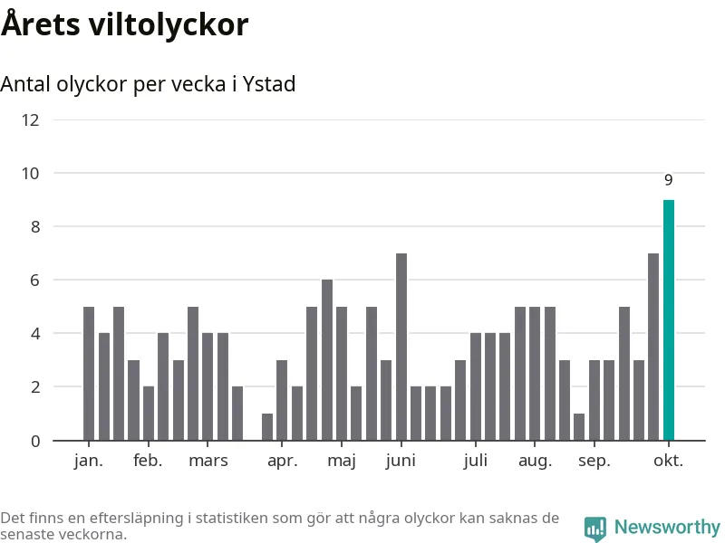 Under vecka 41 rapporterades nio viltolyckor in i Ystads kommun. Det är det största antalet på en enskild vecka hittills i år.