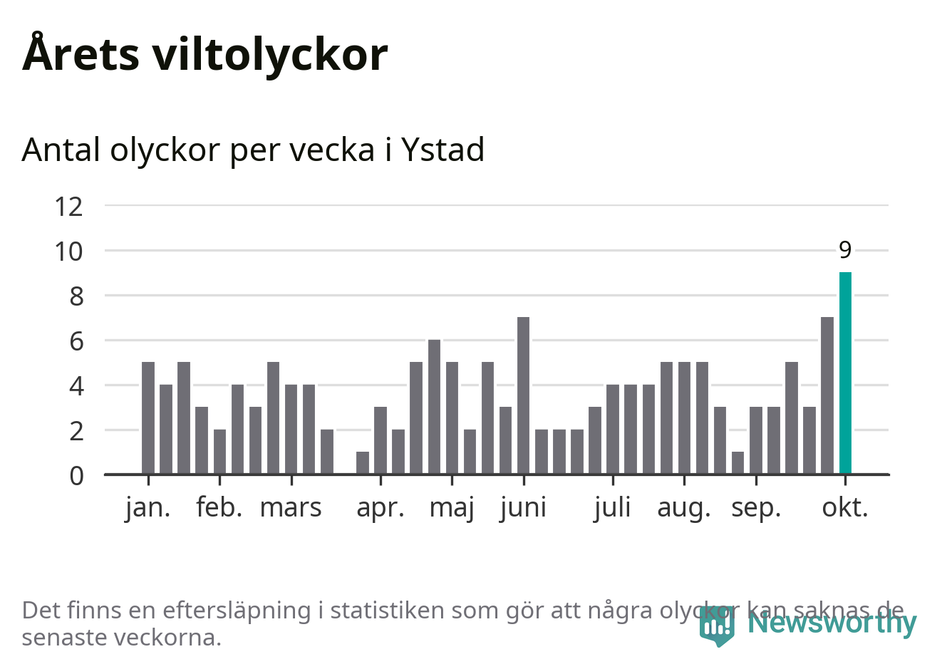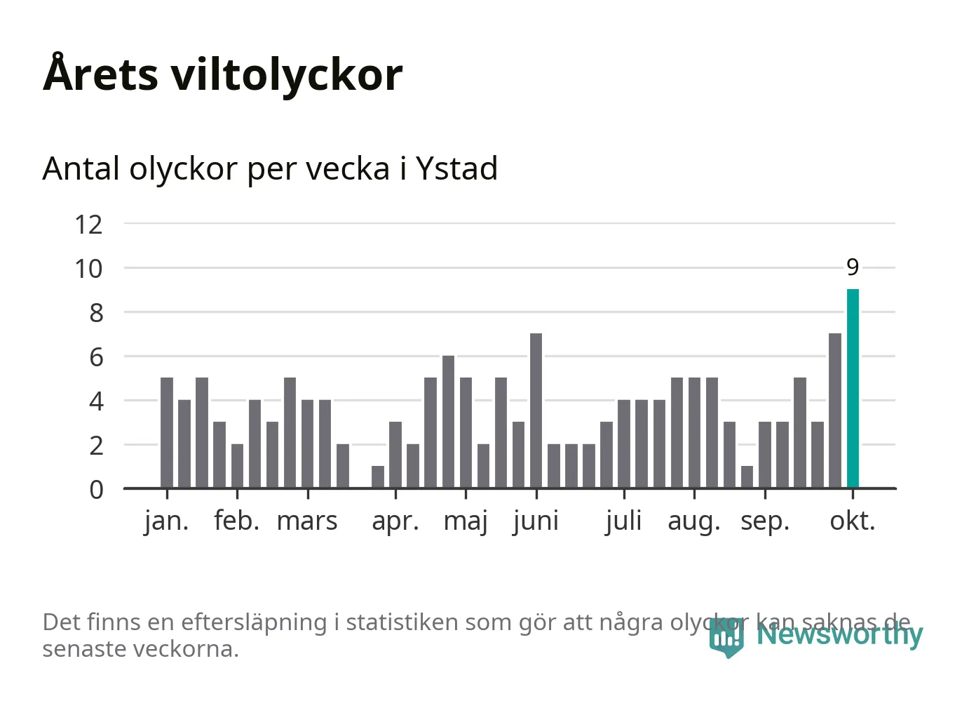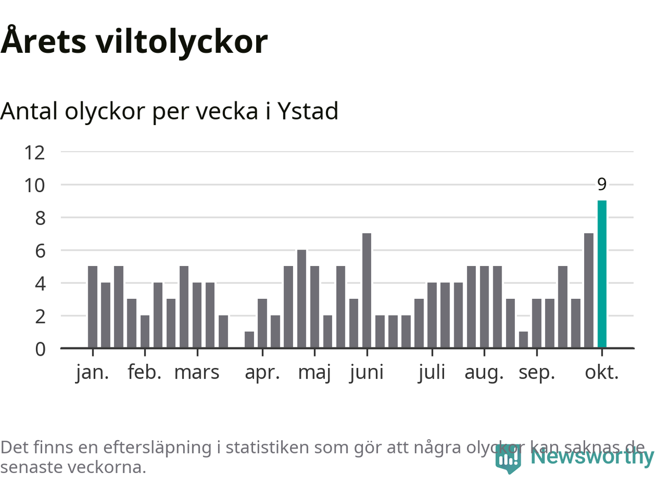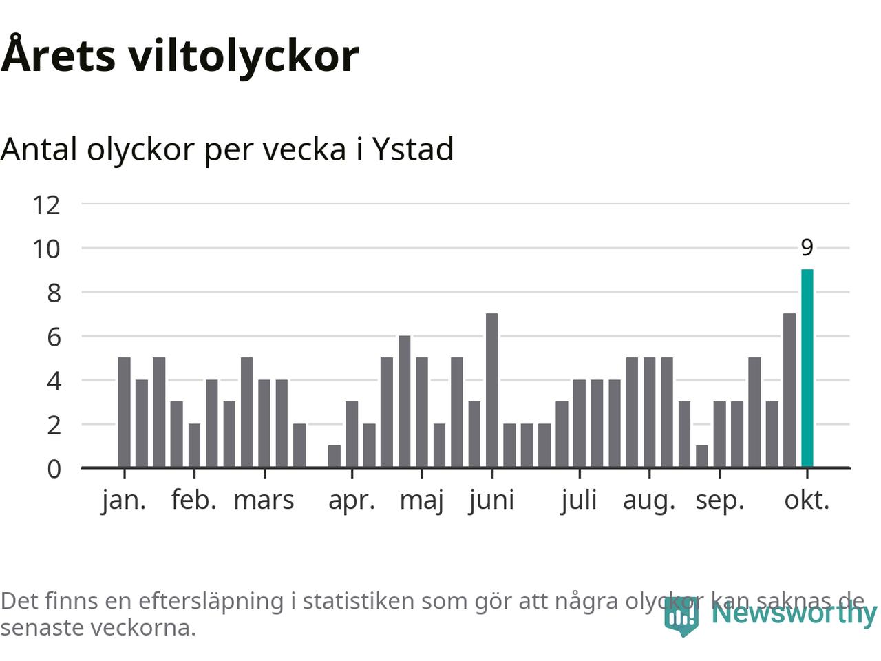Under vecka 41 rapporterades nio viltolyckor in i Ystads kommun. Det är det största antalet på en enskild vecka hittills i år.