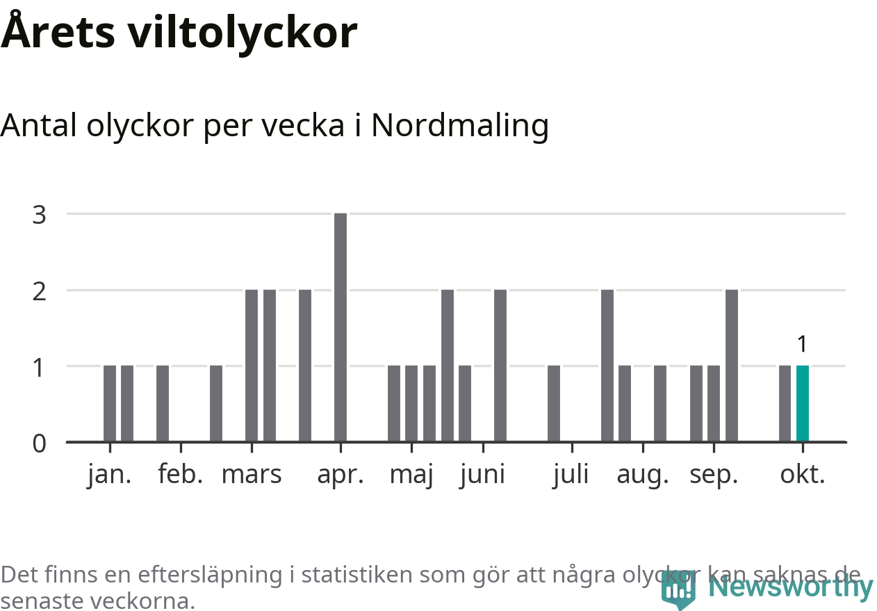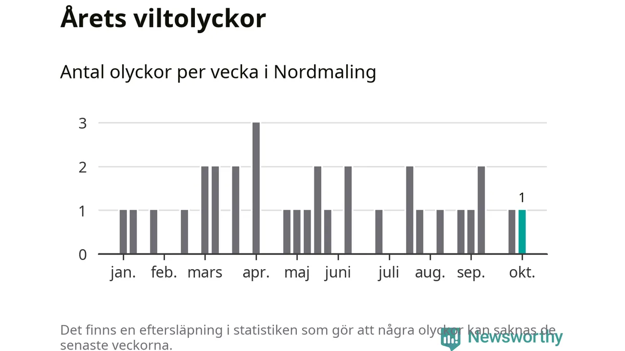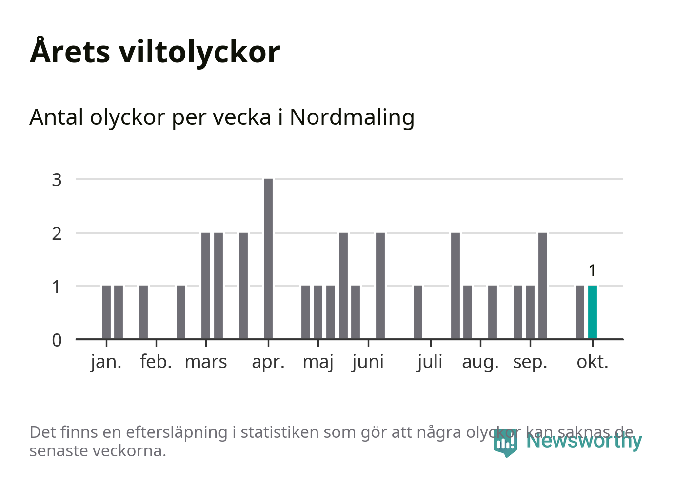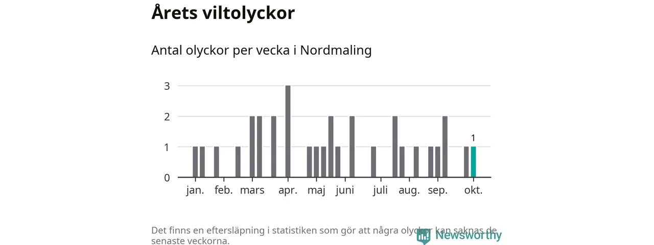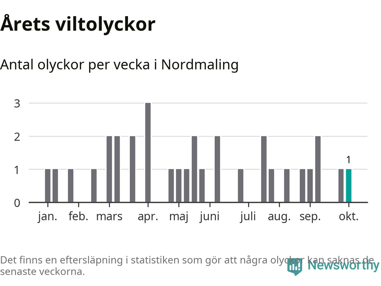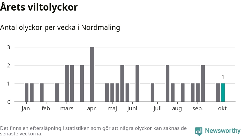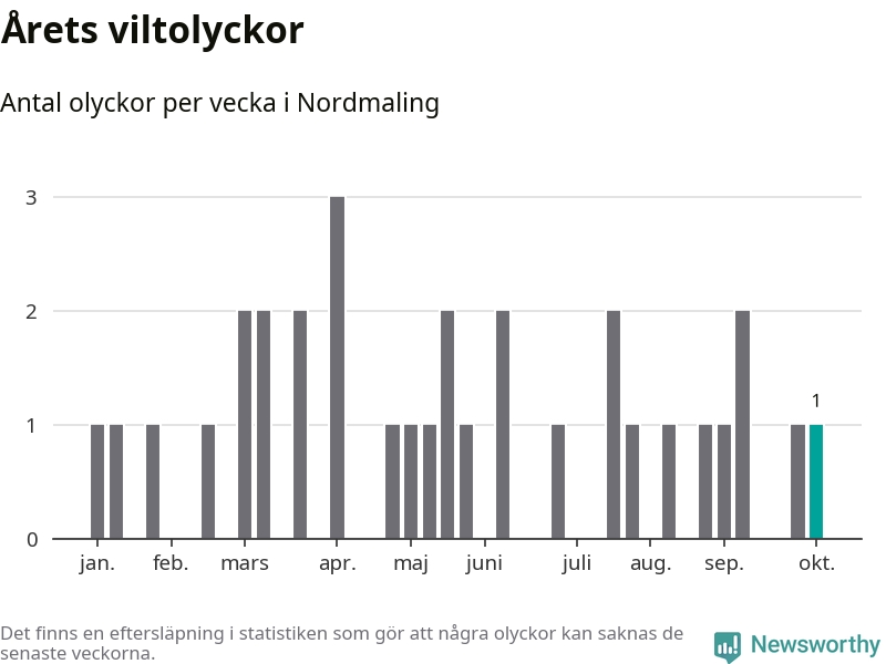 Från förra veckan (vecka 41) har hittills en viltolycka rapporterats in i Nordmalings kommun.