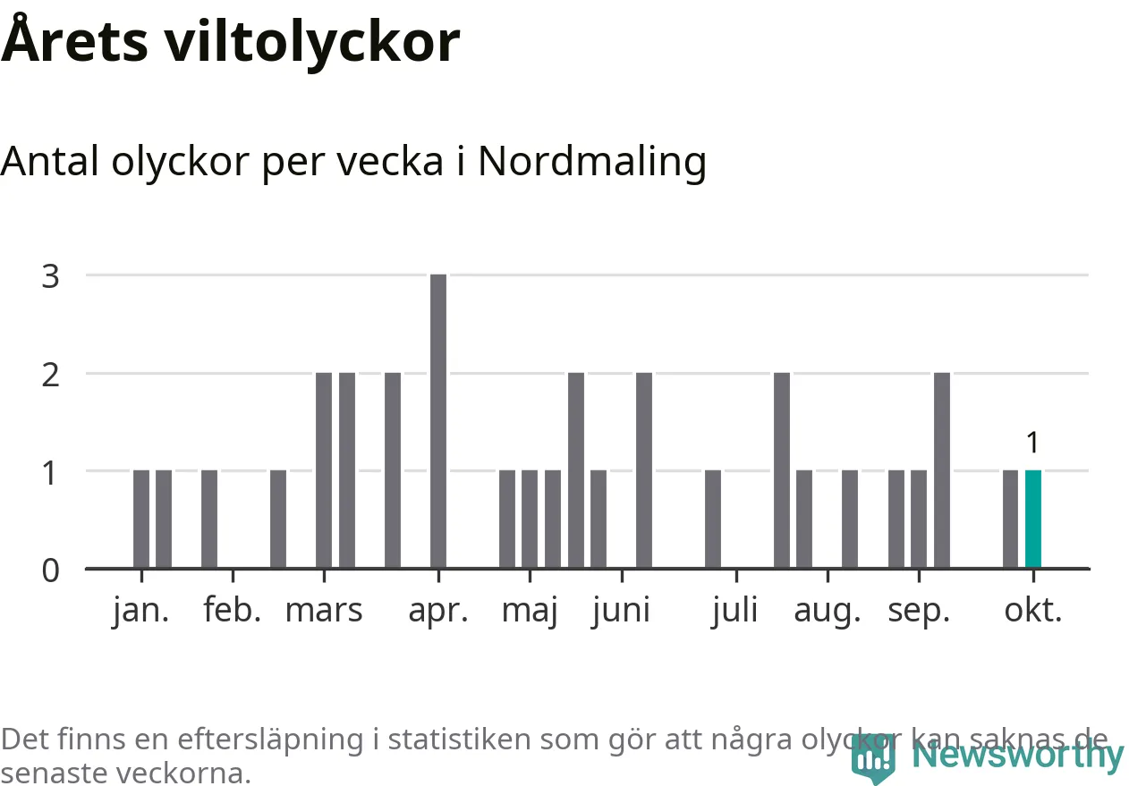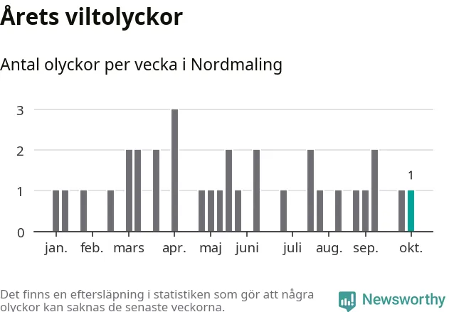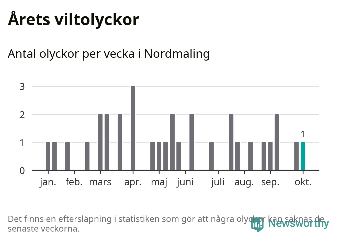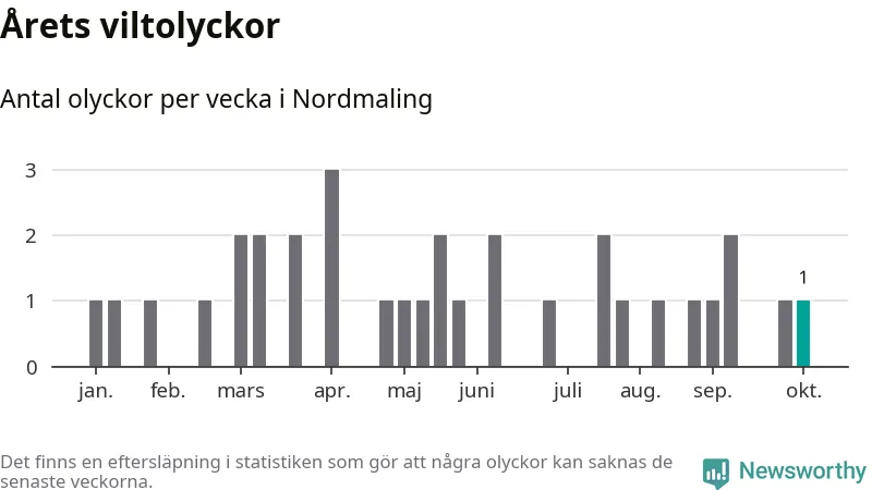 Viltolyckorna är som flest under vår och höst, men vilken typ av vilt varierar med årstiden. Så här års är det vanligast med rådjursolyckor i Nordmaling, sett till de senaste tio årens statistik. I statistiken ingår inte olyckor med ren, som här räknas som tamdjur.