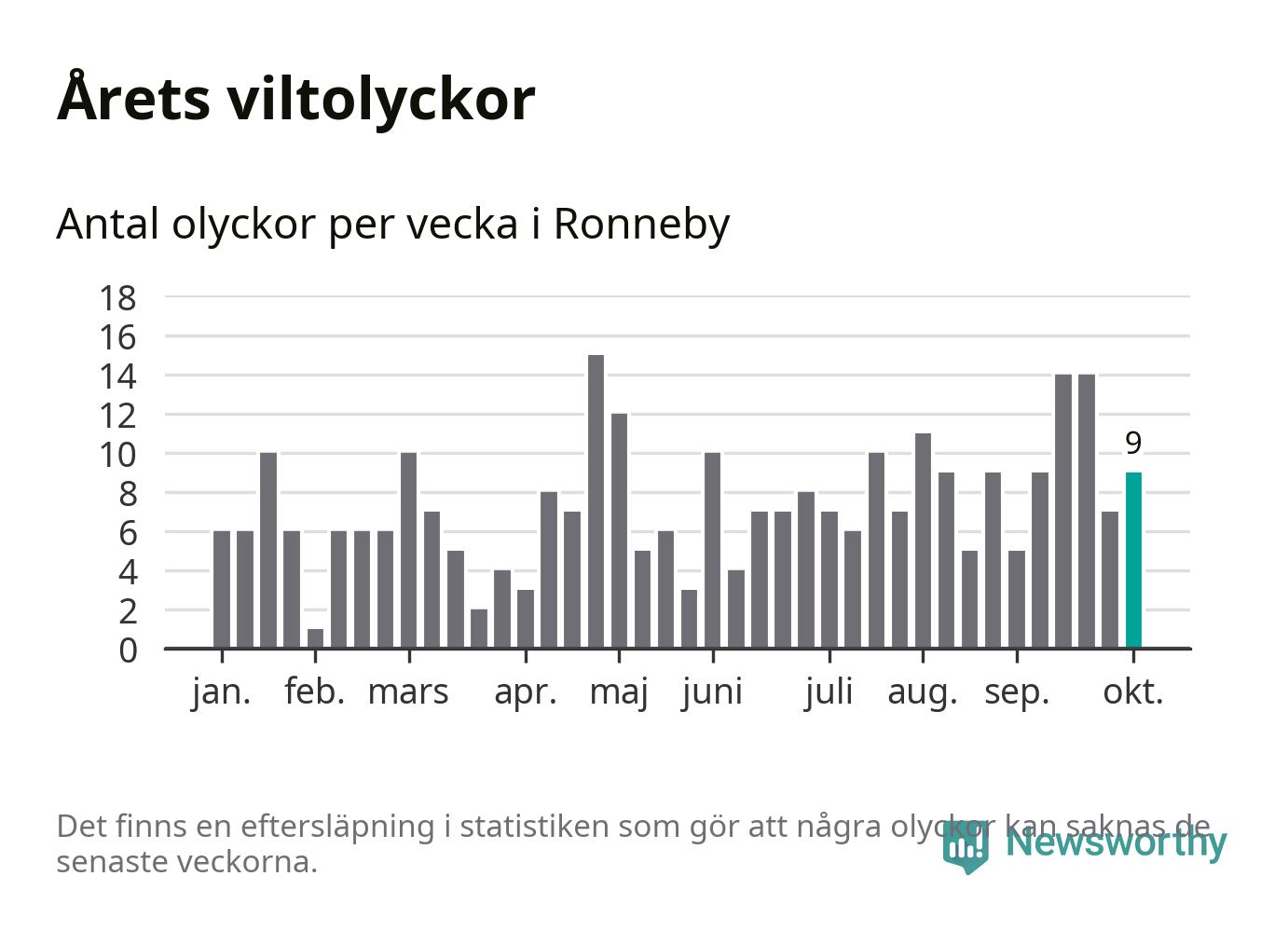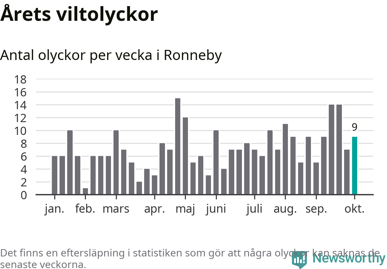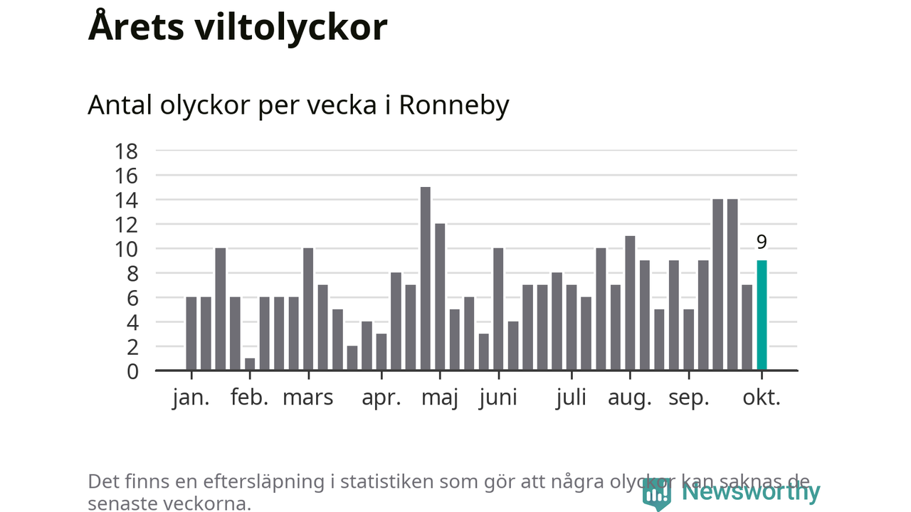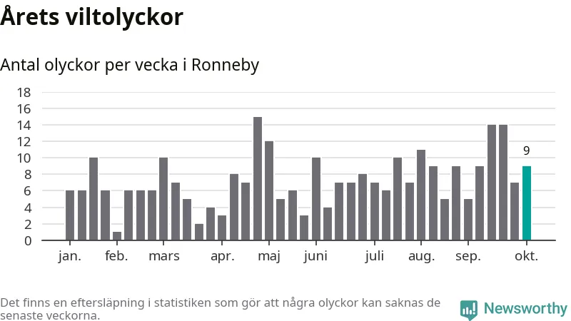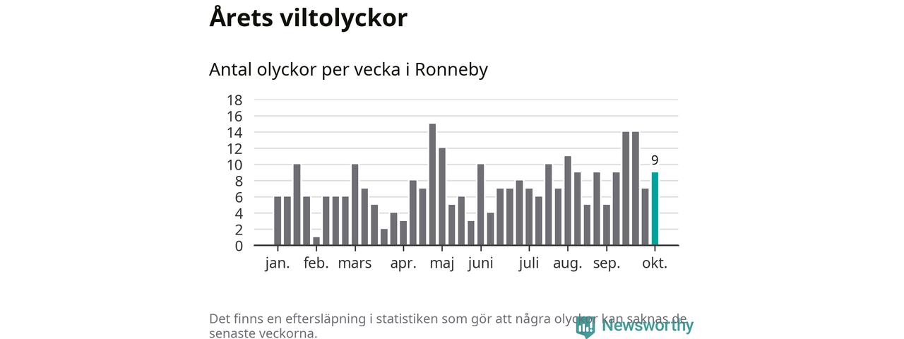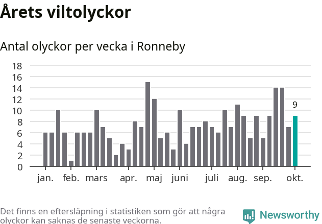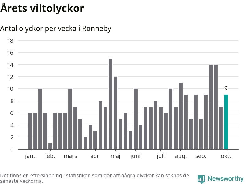 Hittills har nio viltolyckor rapporterats in i Ronneby kommun från vecka 41. Se listan här.