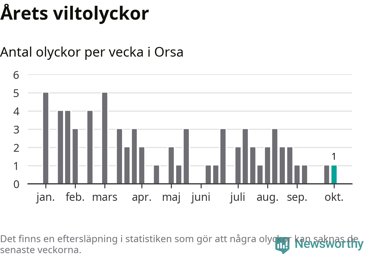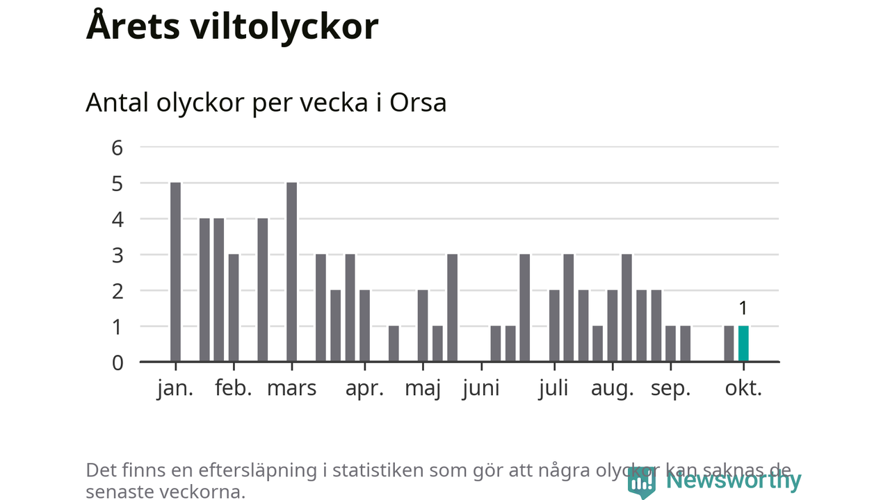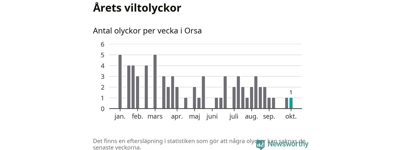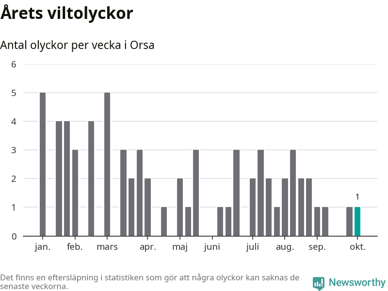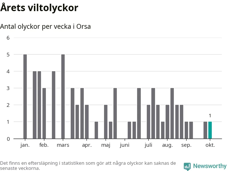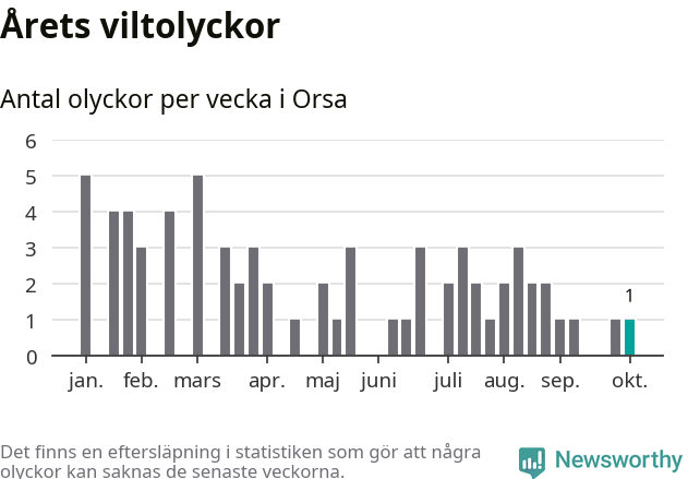 Från förra veckan (vecka 41) har hittills en viltolycka rapporterats in i Orsa kommun.