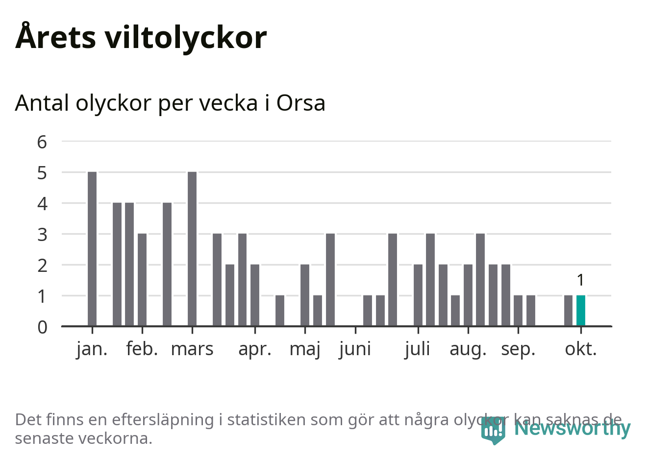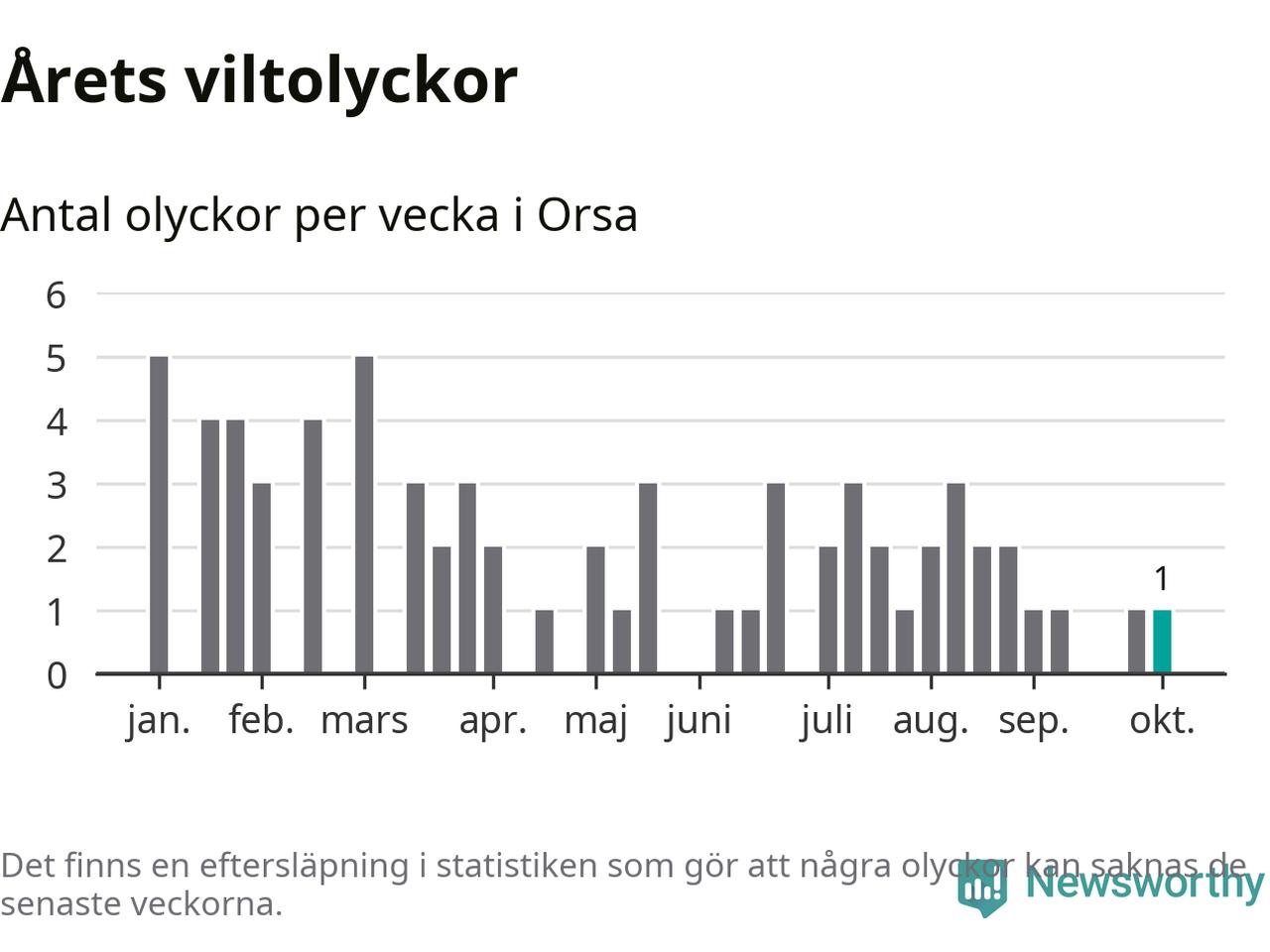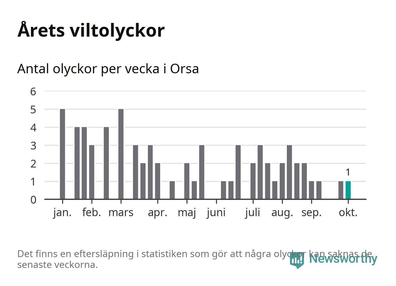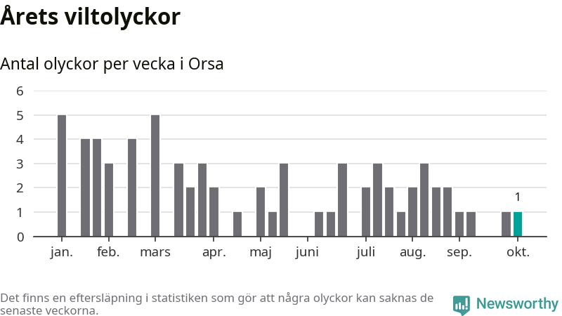Från förra veckan (vecka 41) har hittills en viltolycka rapporterats in i Orsa kommun.