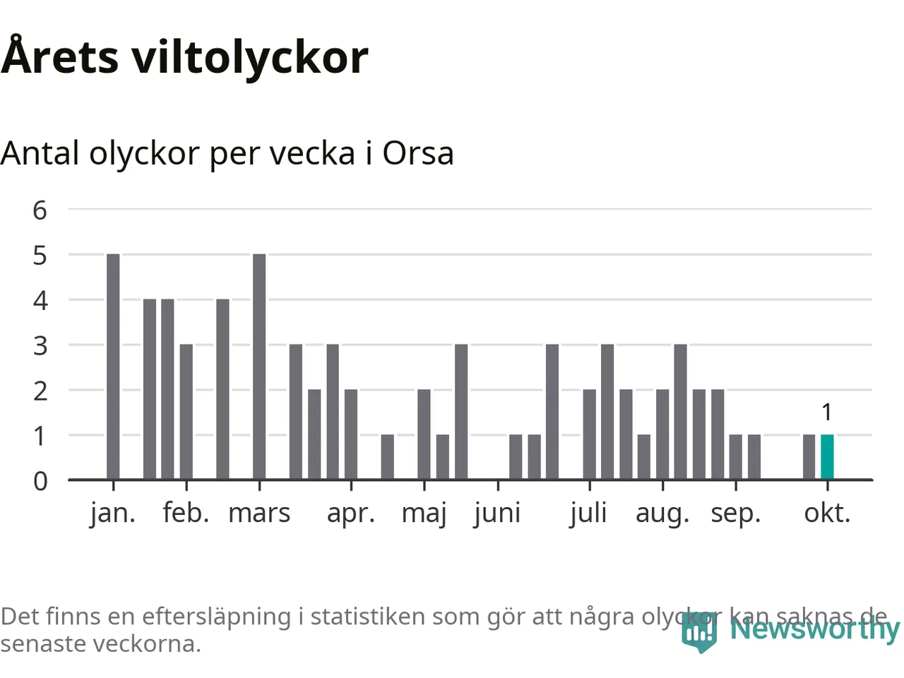 Totalt det här året har det inträffat 70 viltolyckor i kommunen. Det är en normal nivå i förhållande till hur det har sett ut under de senaste tio åren – genomsnittet för motsvarande period är 65.