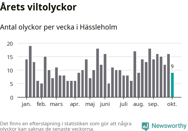 Hittills har nio viltolyckor rapporterats in i Hässleholms kommun från vecka 41. Se listan här.