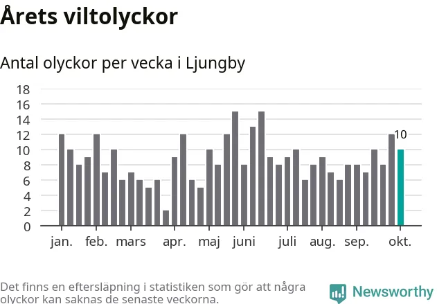 Totalt det här året har det inträffat 353 viltolyckor i kommunen. Det är en normal nivå i förhållande till hur det har sett ut under de senaste tio åren – genomsnittet för motsvarande period är 348.