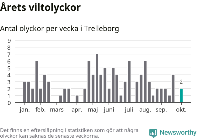 Hittills har två viltolyckor rapporterats in i Trelleborgs kommun från vecka 41. Se listan här.