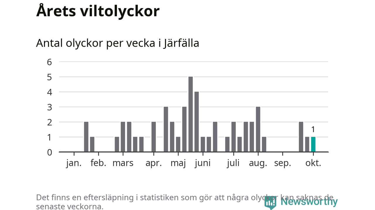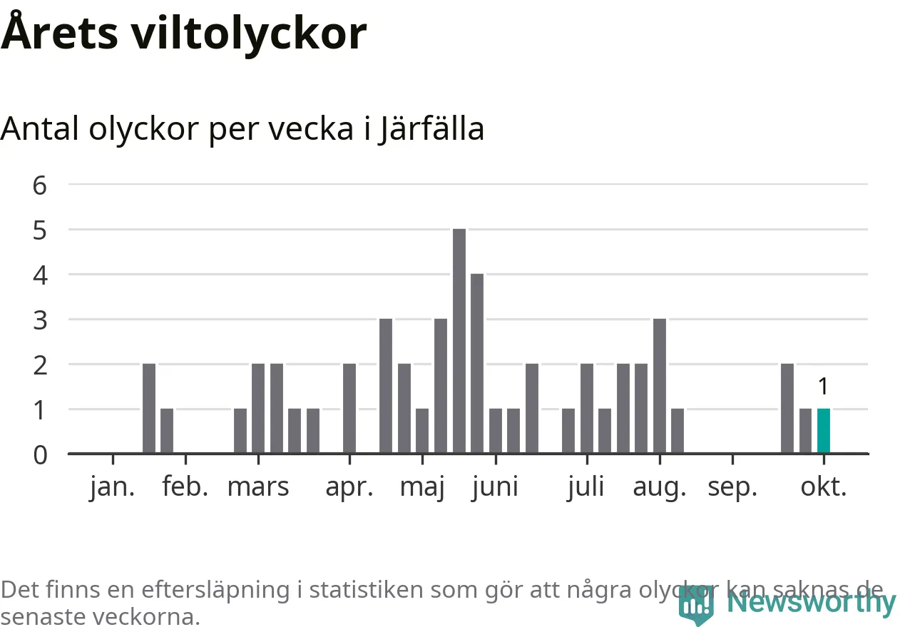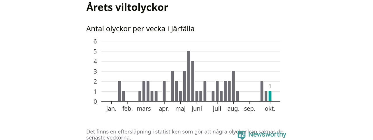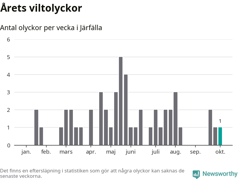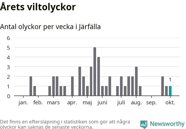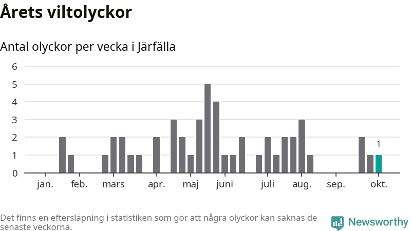 Från förra veckan (vecka 41) har hittills en viltolycka rapporterats in i Järfälla kommun.