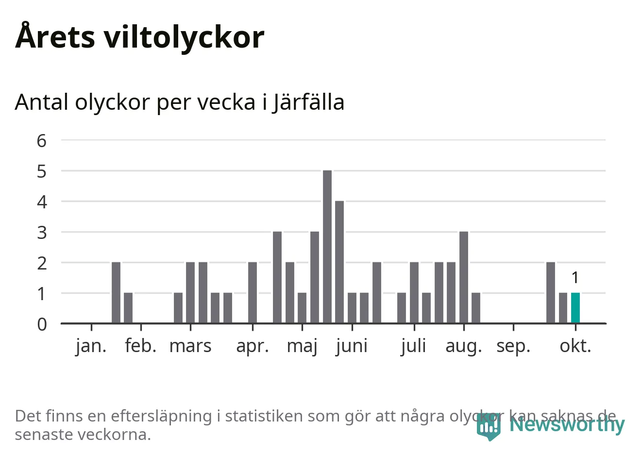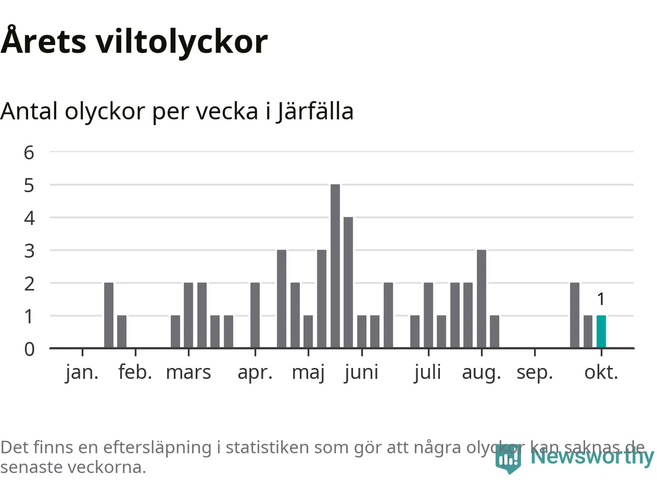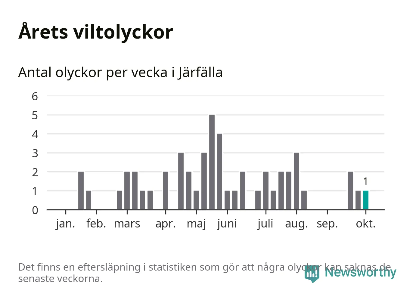 Från förra veckan (vecka 41) har hittills en viltolycka rapporterats in i Järfälla kommun.