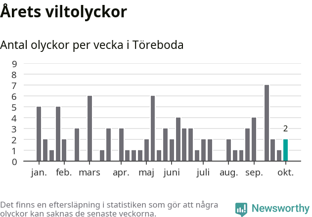 Hittills har två viltolyckor rapporterats in i Töreboda kommun från vecka 41. Se listan här.