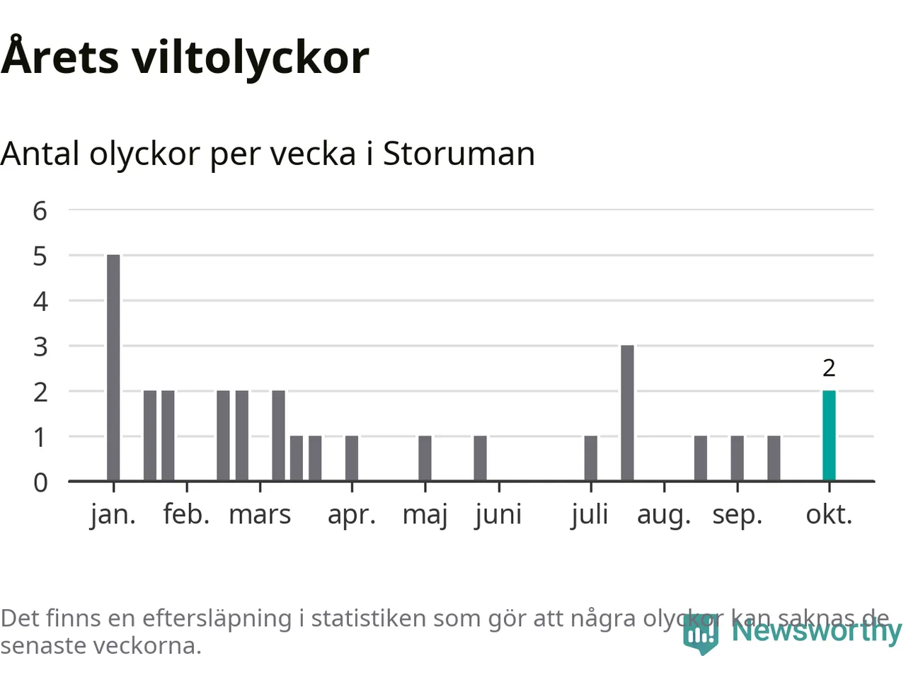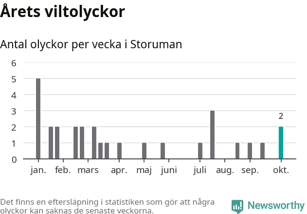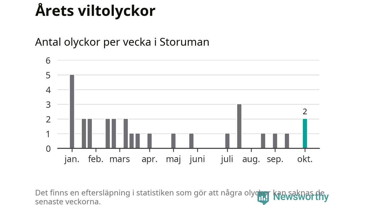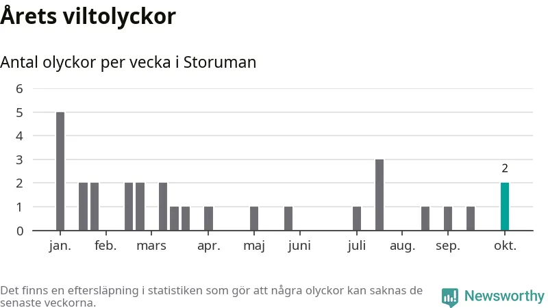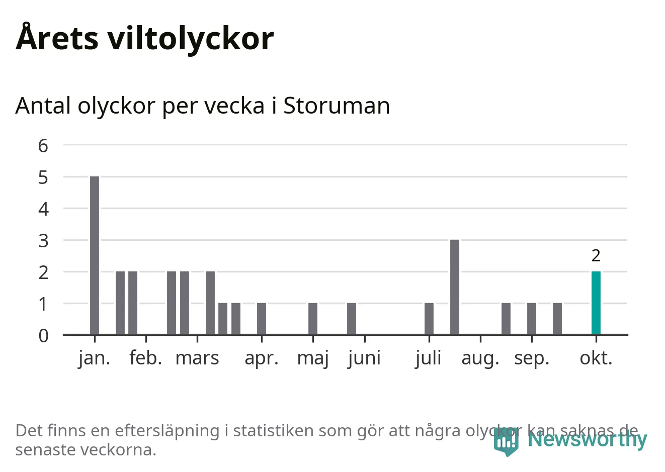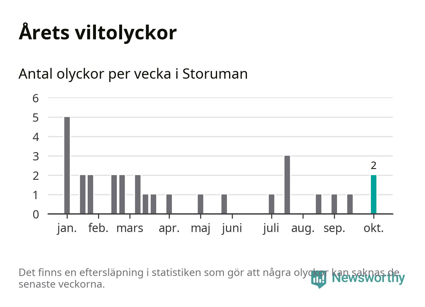 Hittills har två viltolyckor rapporterats in i Storumans kommun från vecka 41. Se listan här.