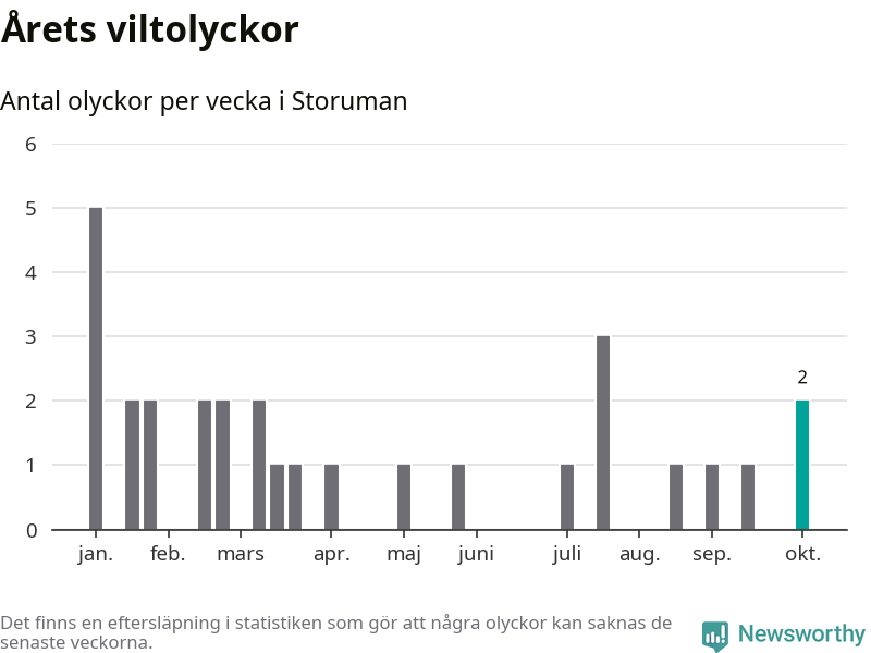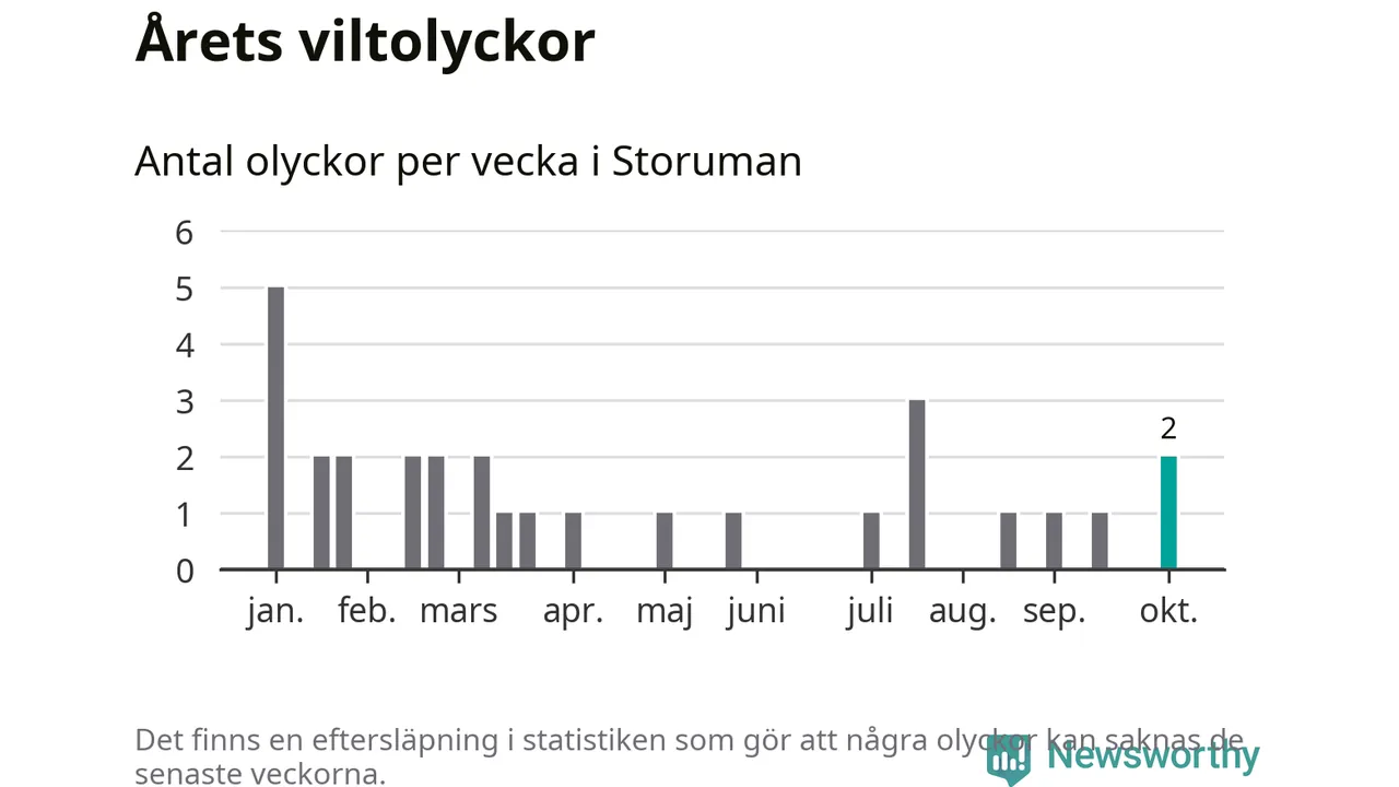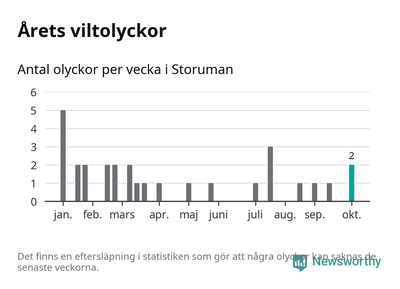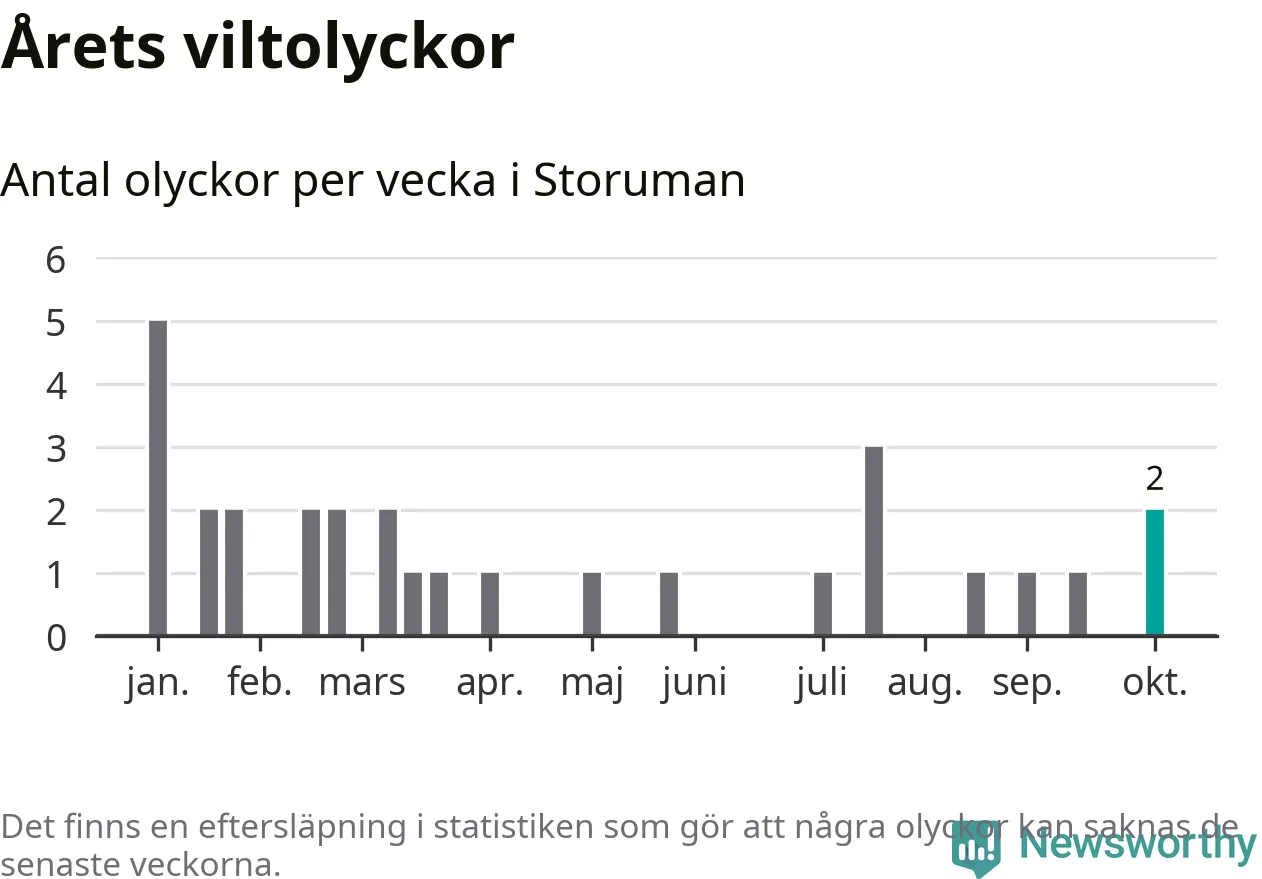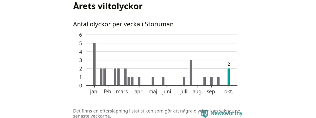 Hittills har två viltolyckor rapporterats in i Storumans kommun från vecka 41. Se listan här.