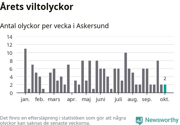 Hittills har två viltolyckor rapporterats in i Askersunds kommun från vecka 41. Se listan här.