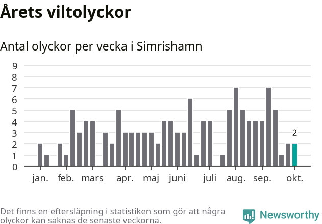 Hittills har två viltolyckor rapporterats in i Simrishamns kommun från vecka 41. Se listan här.