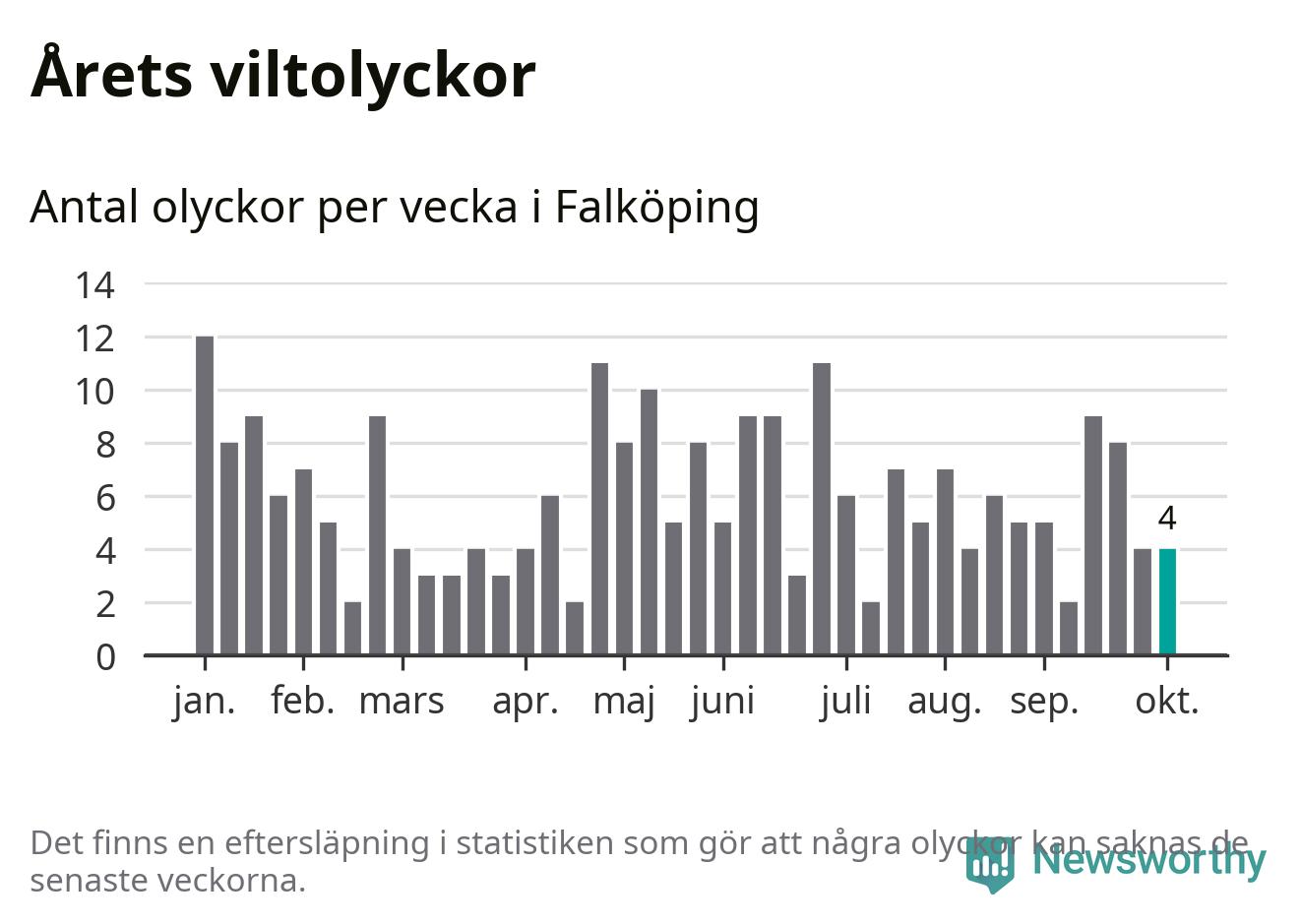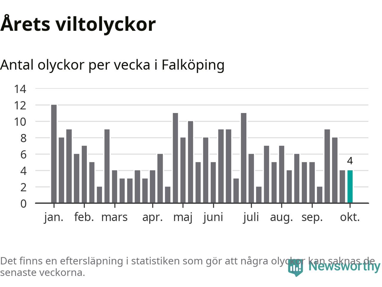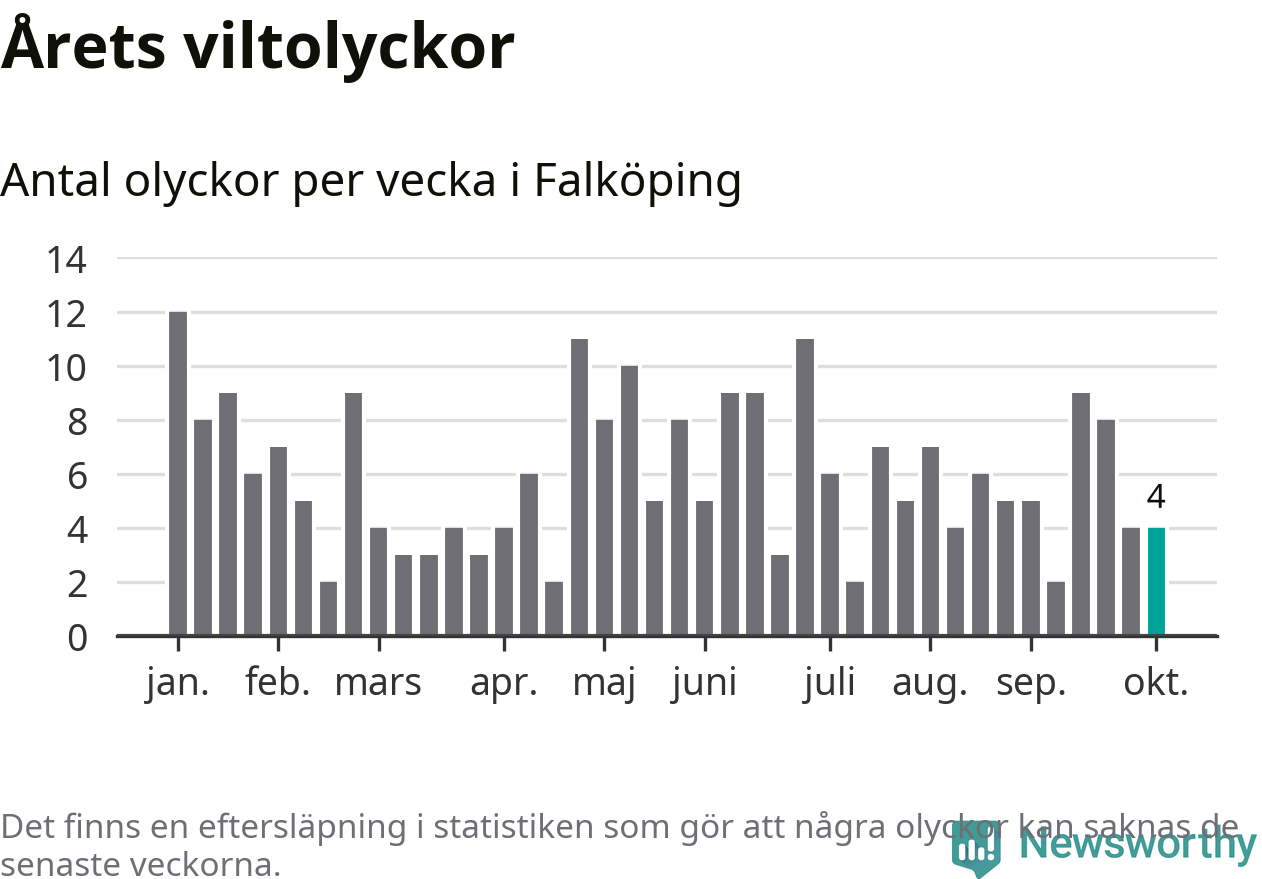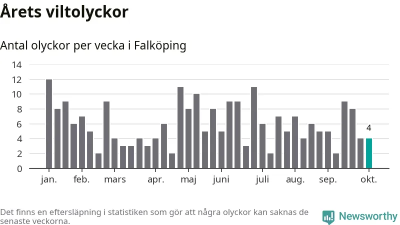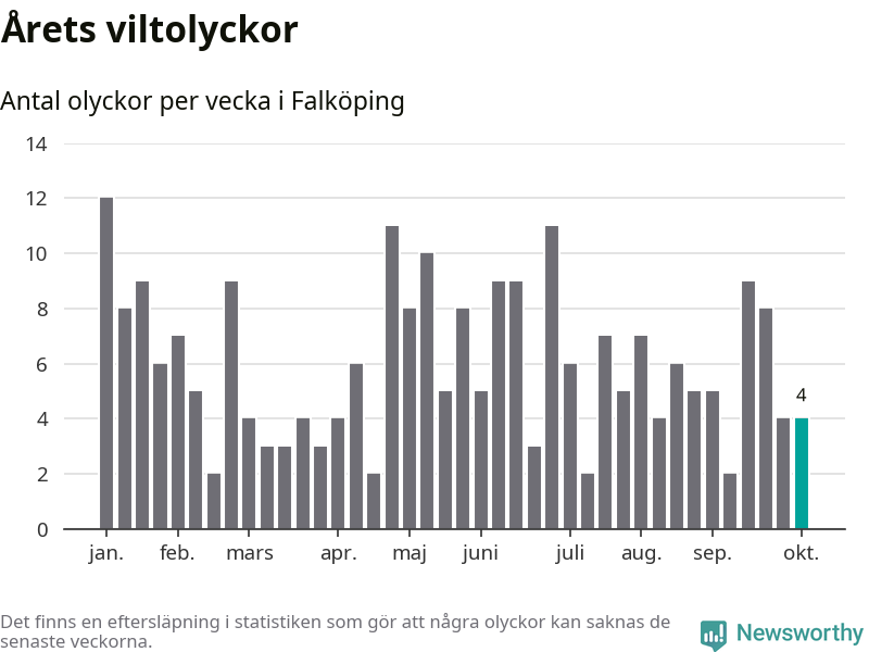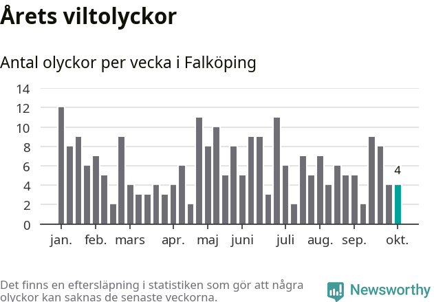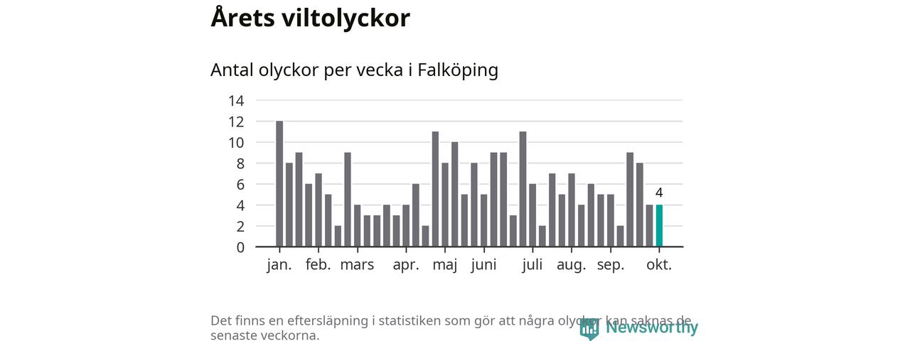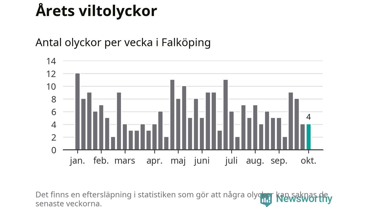 Hittills har fyra viltolyckor rapporterats in i Falköpings kommun från vecka 41. Se listan här.