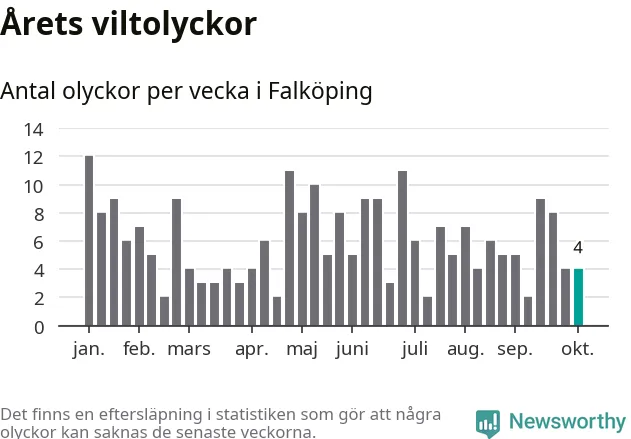 Totalt det här året har det inträffat 248 viltolyckor i kommunen. Det är en normal nivå i förhållande till hur det har sett ut under de senaste tio åren – genomsnittet för motsvarande period är 229.