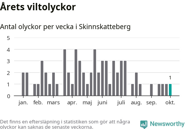 Från förra veckan (vecka 41) har hittills en viltolycka rapporterats in i Skinnskattebergs kommun.