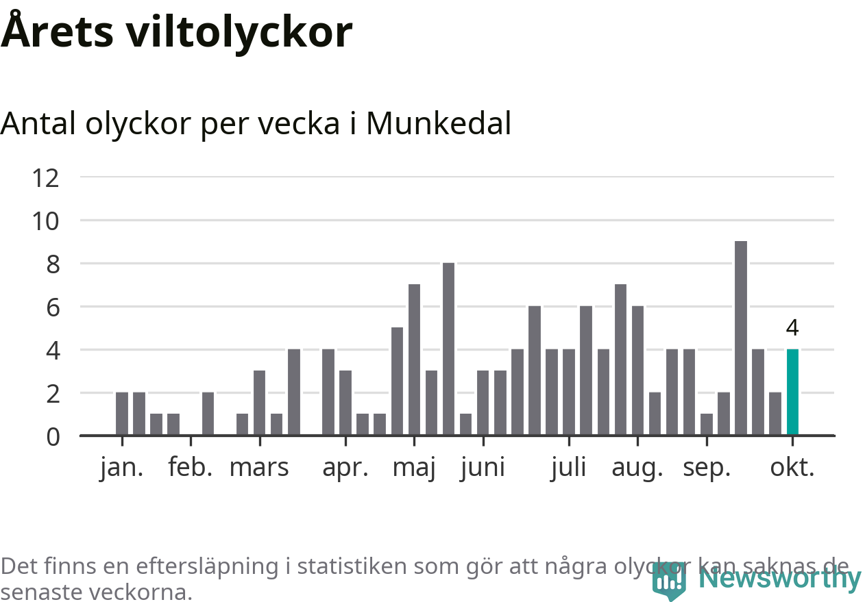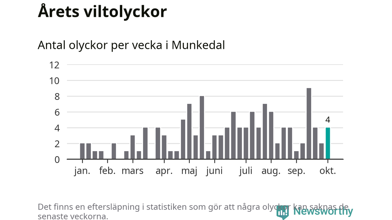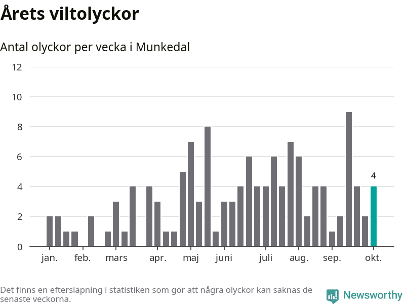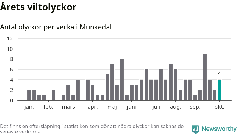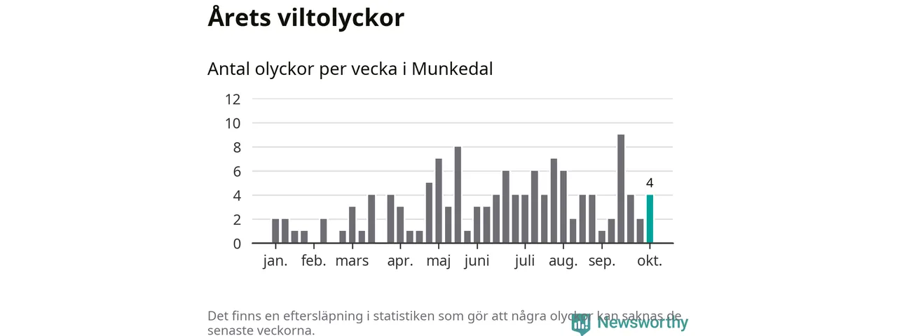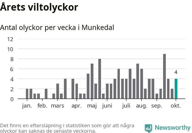 Hittills har fyra viltolyckor rapporterats in i Munkedals kommun från vecka 41. Se listan här.