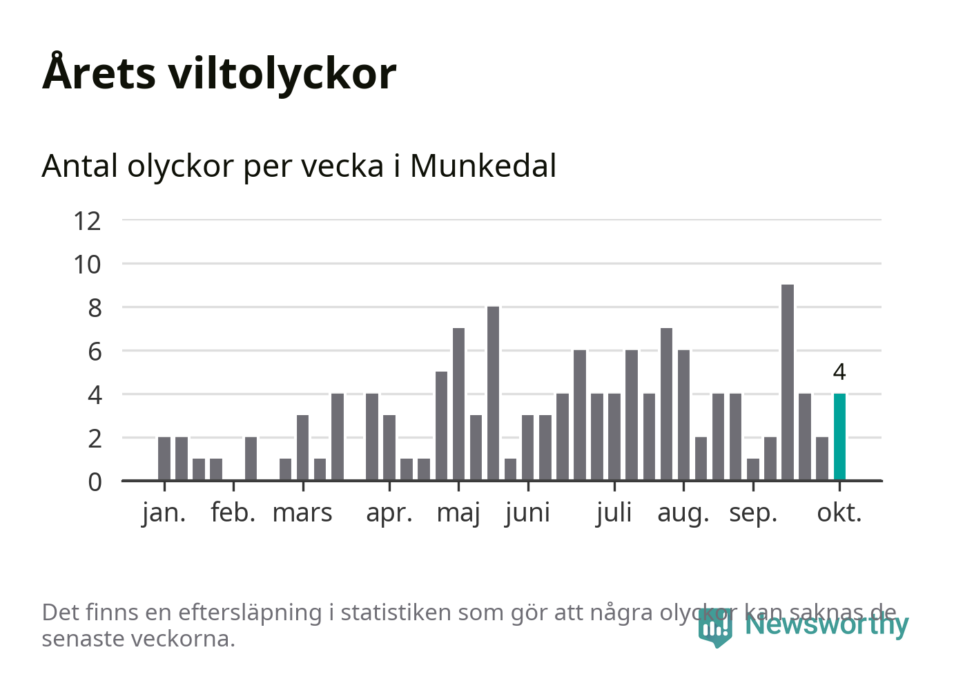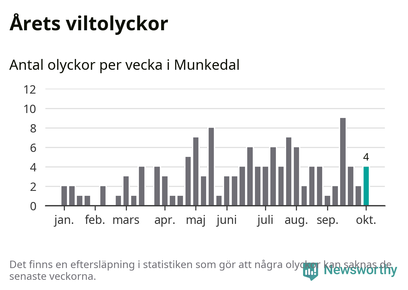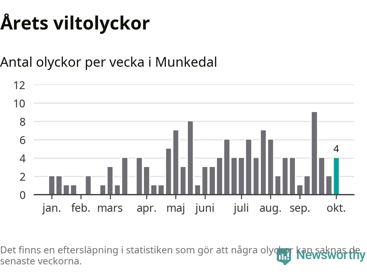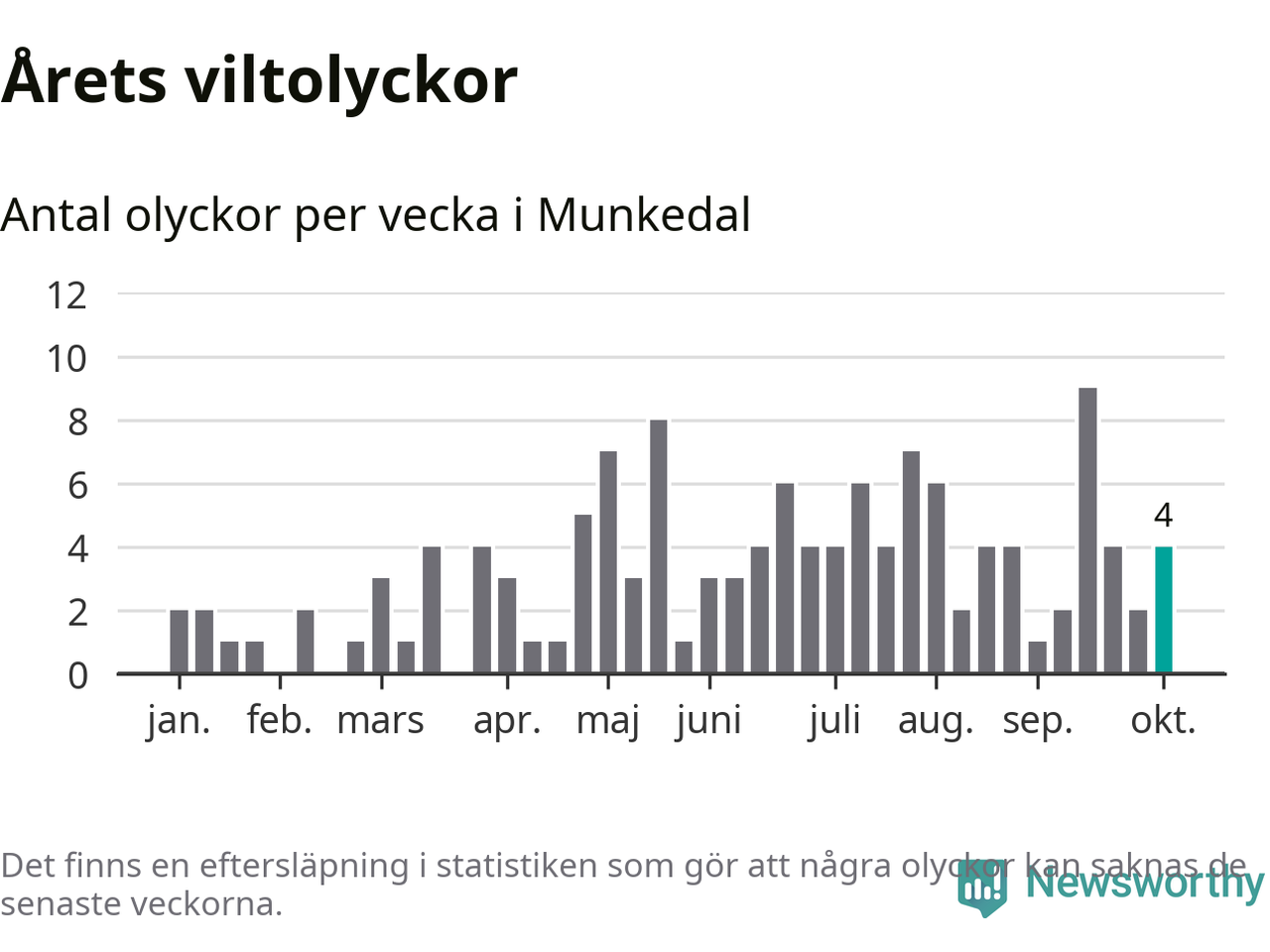 Hittills har fyra viltolyckor rapporterats in i Munkedals kommun från vecka 41. Se listan här.