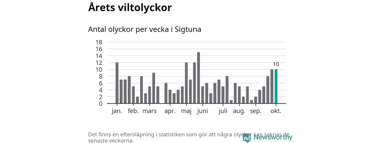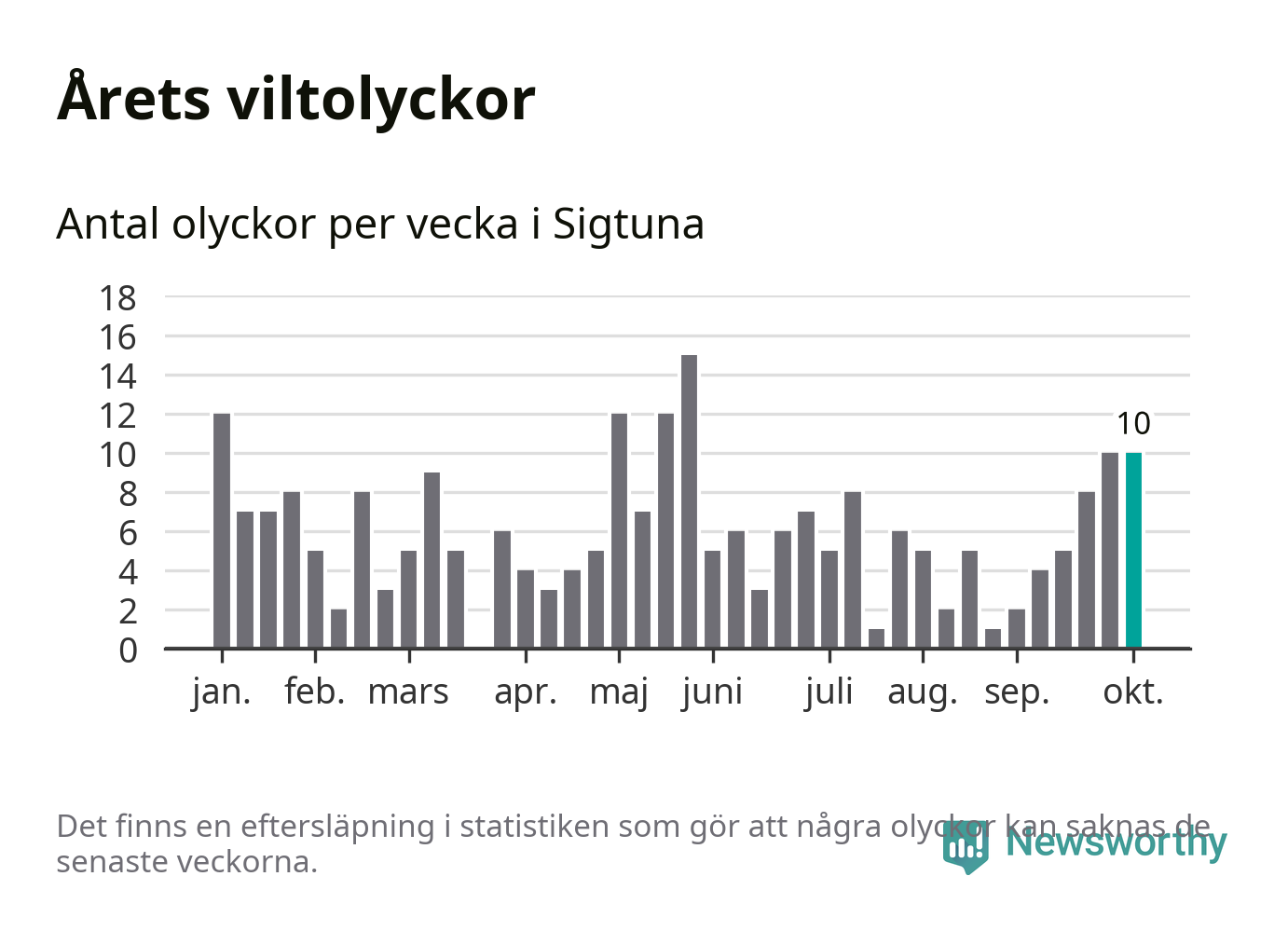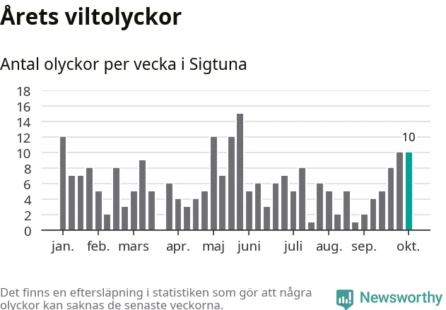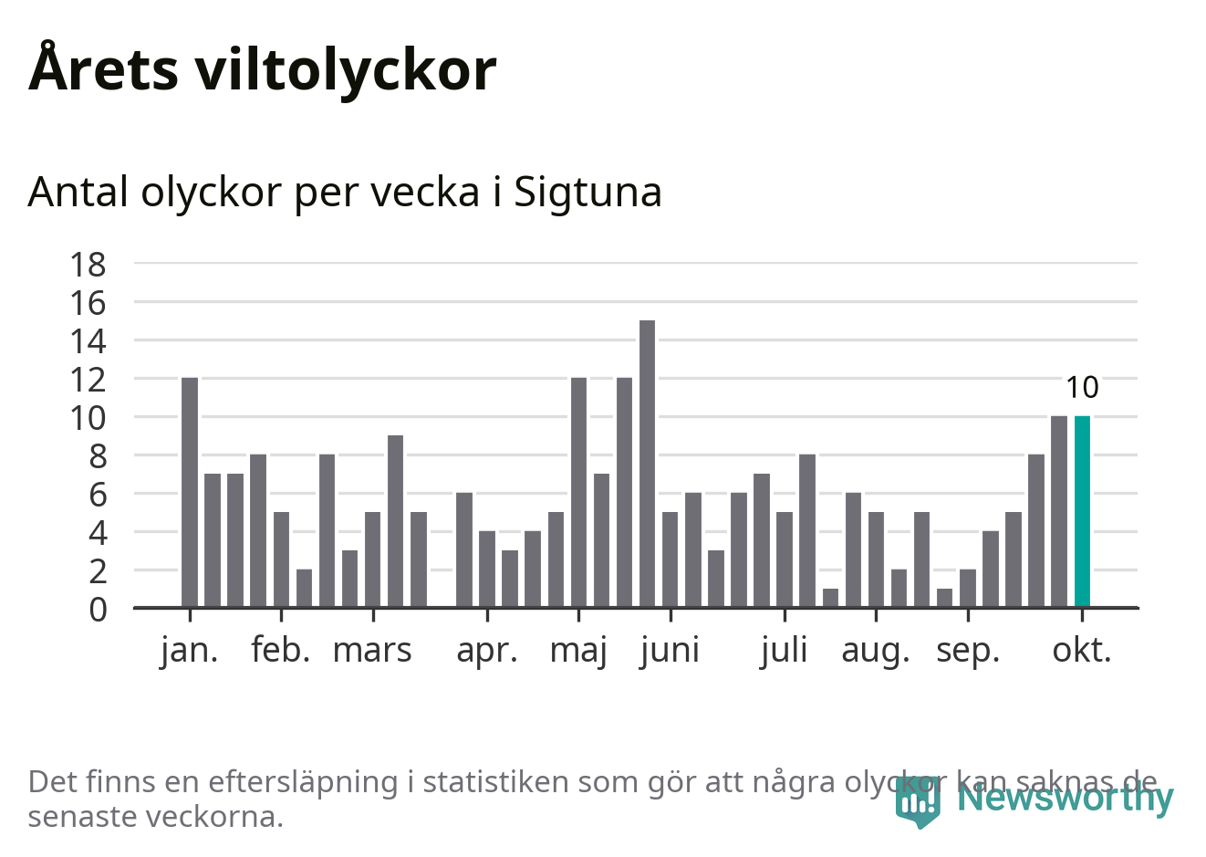 Hittills har tio viltolyckor rapporterats in i Sigtuna kommun från vecka 41. Se listan här.