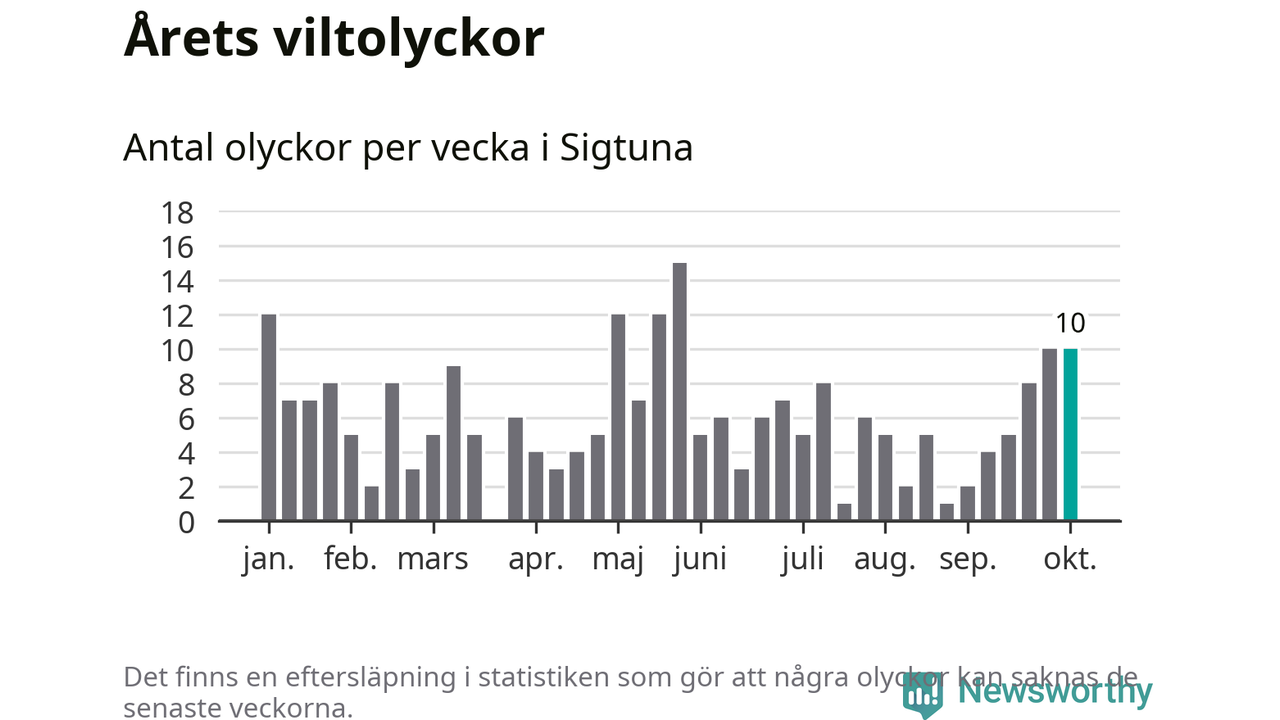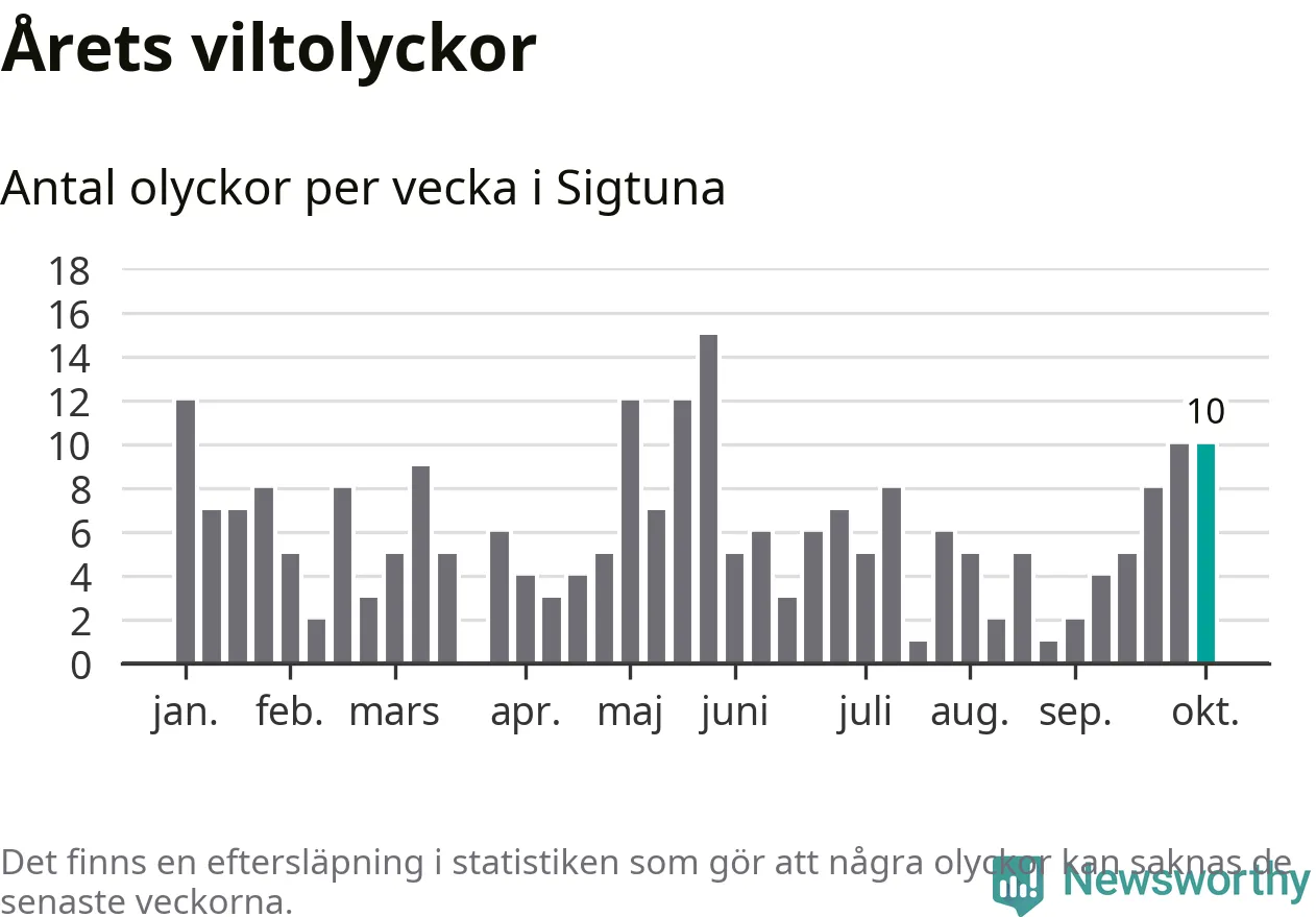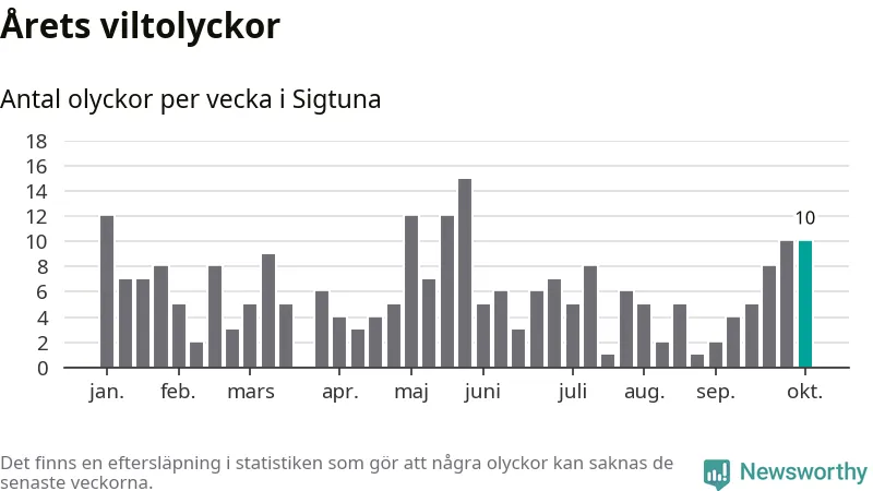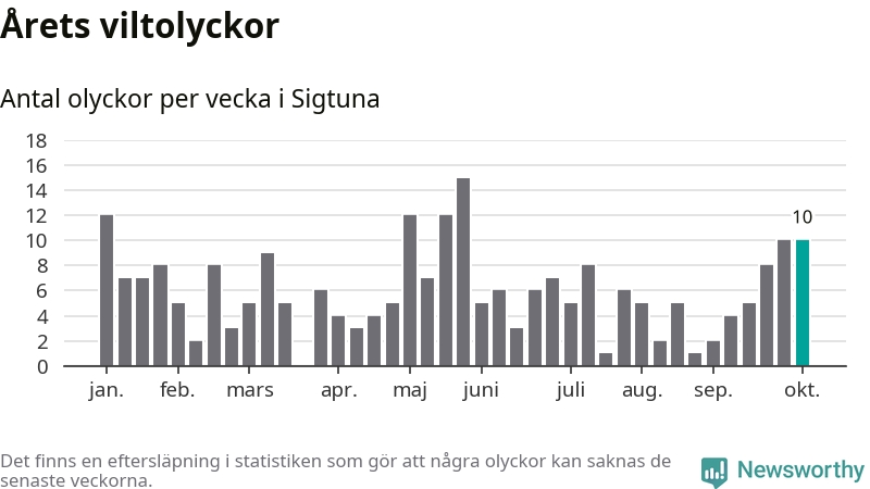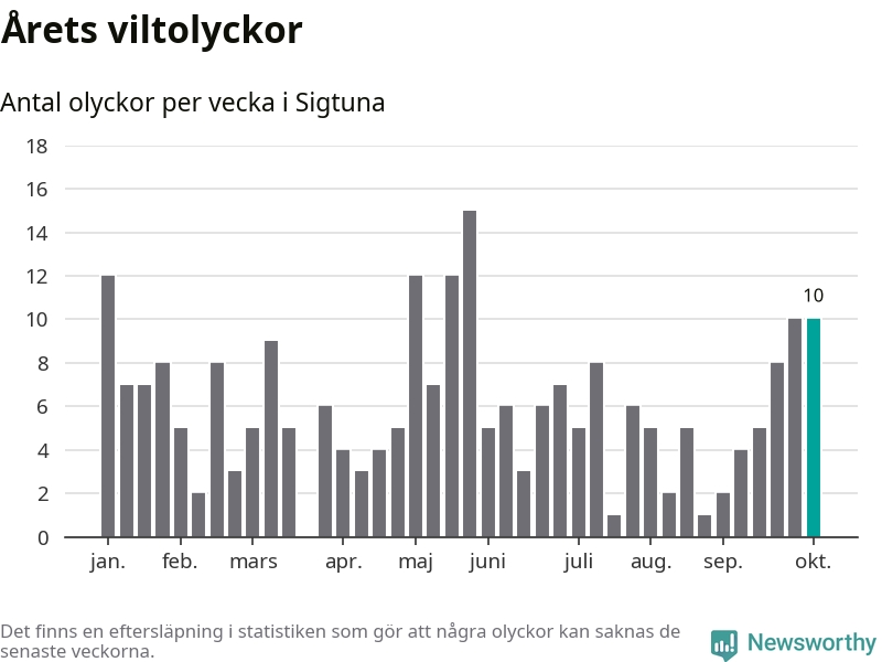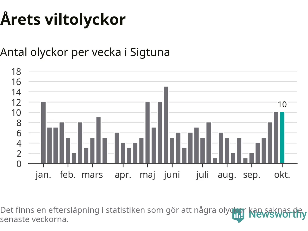 Hittills har tio viltolyckor rapporterats in i Sigtuna kommun från vecka 41. Se listan här.