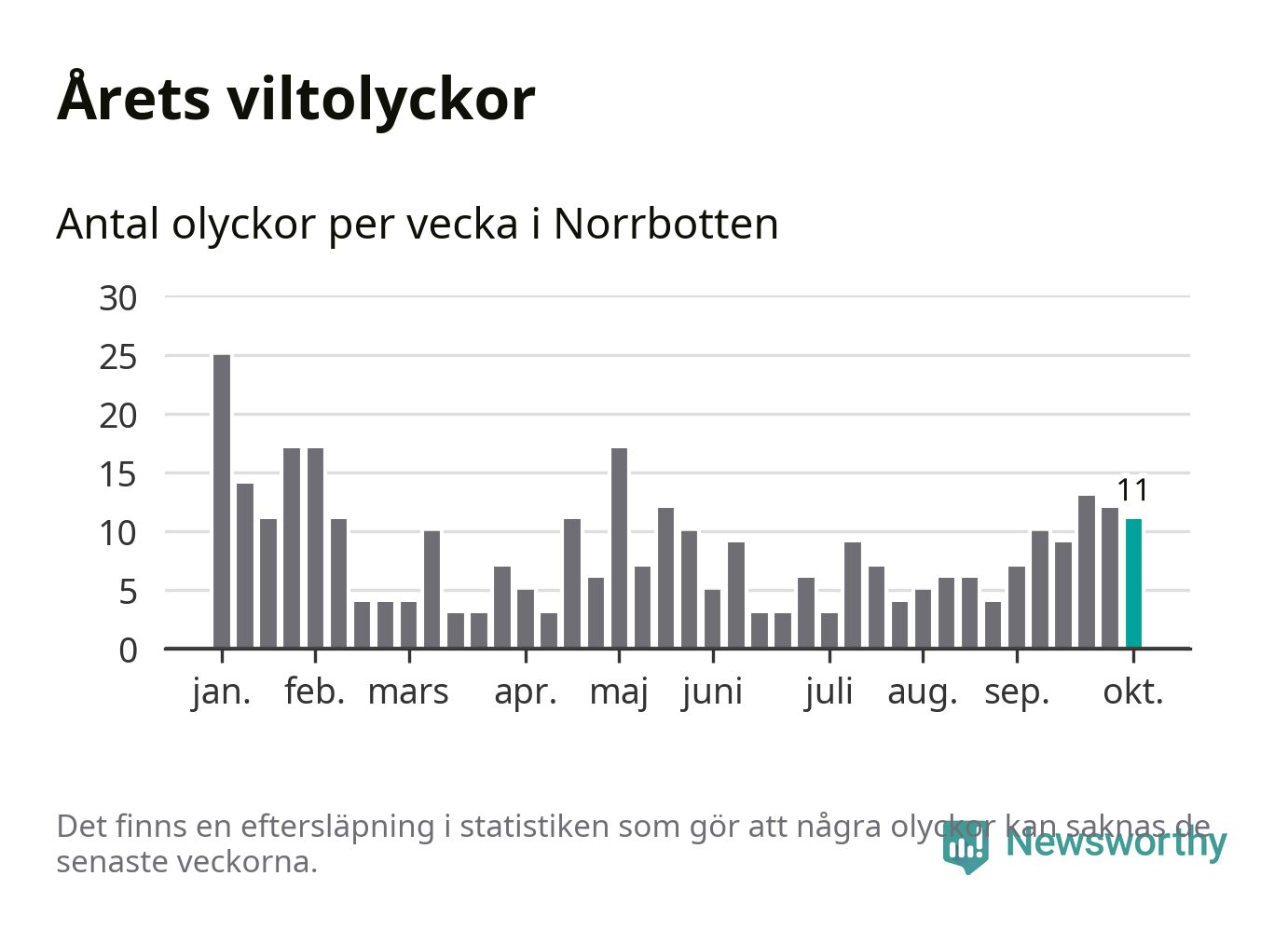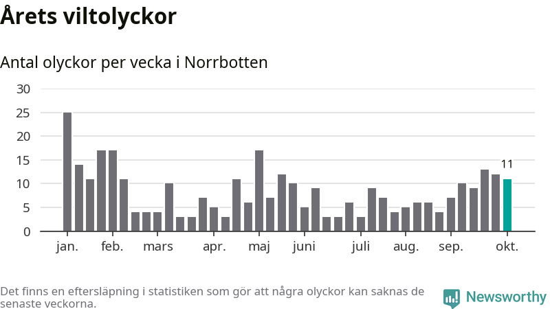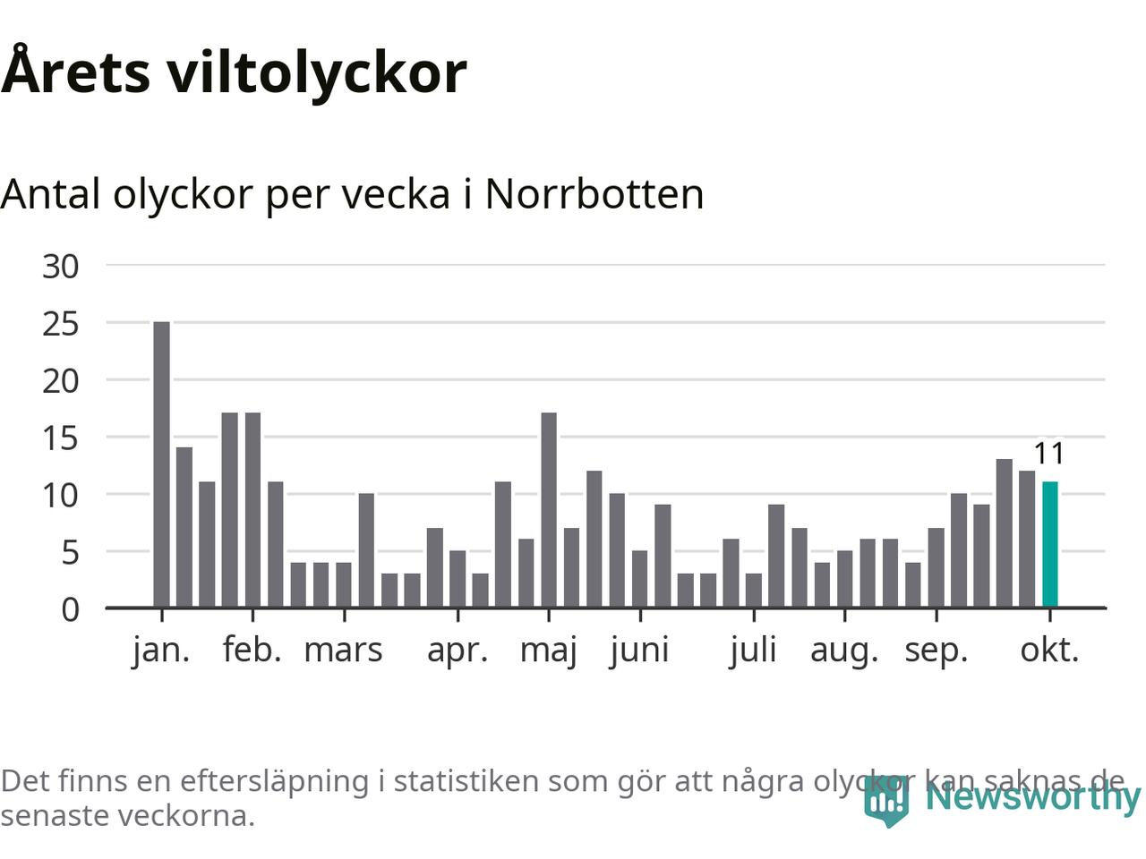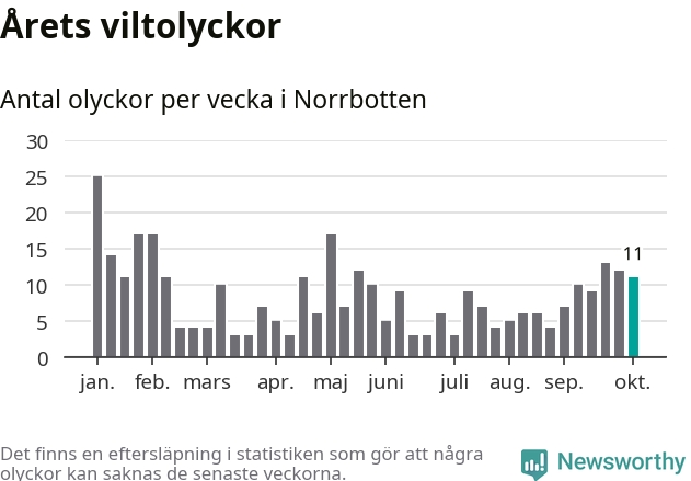 sett till de senaste tio årens statistik. I statistiken ingår inte olyckor med ren, som här räknas som tamdjur.