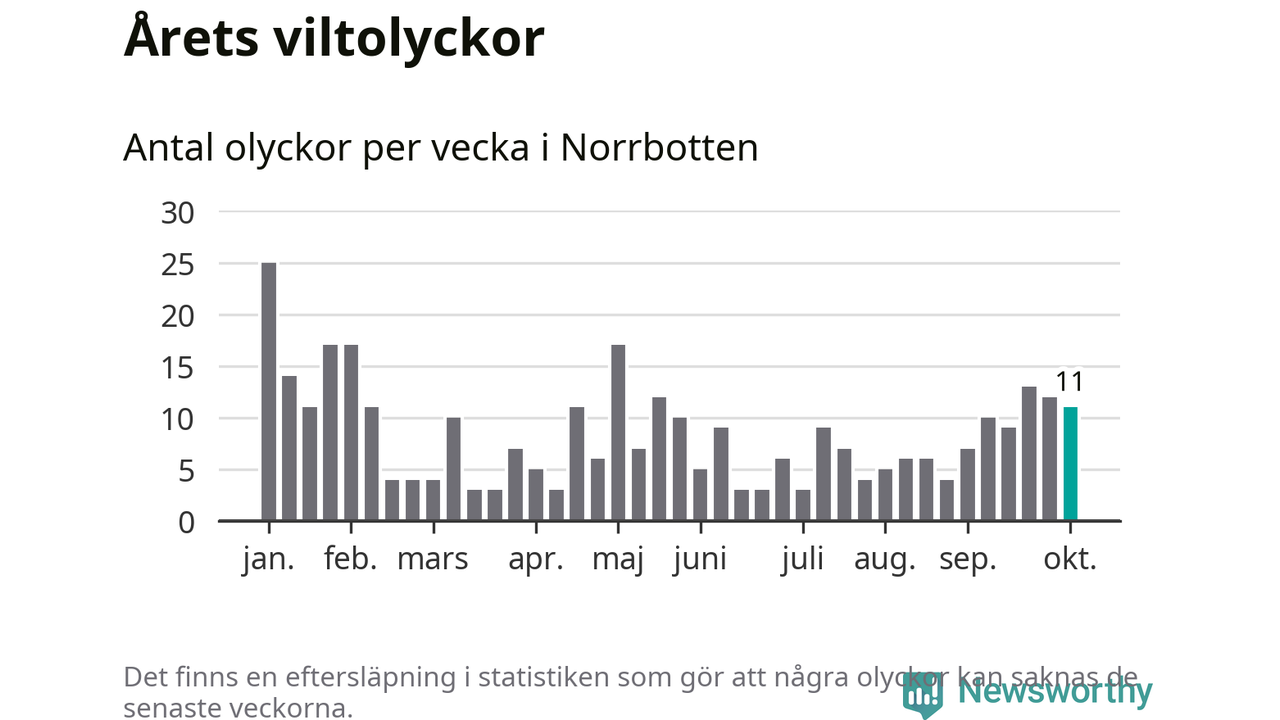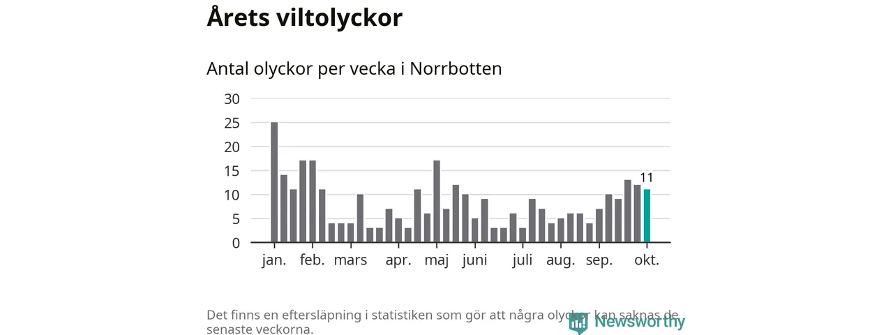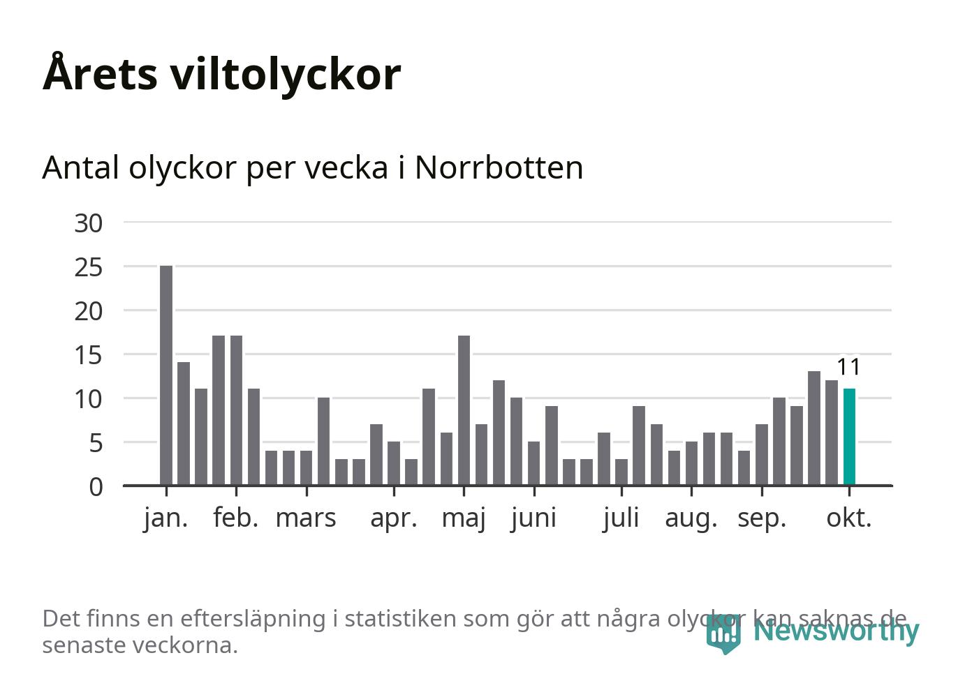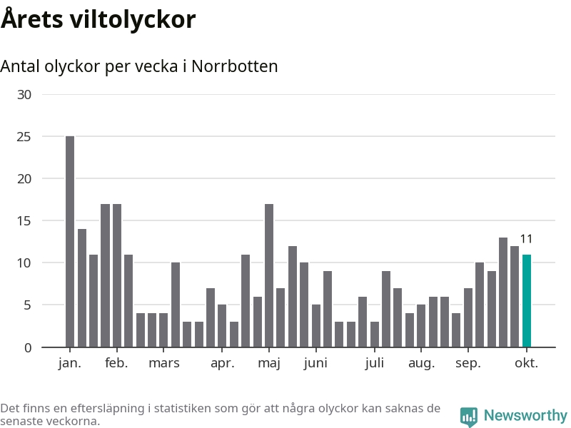 sett till de senaste tio årens statistik. I statistiken ingår inte olyckor med ren, som här räknas som tamdjur.