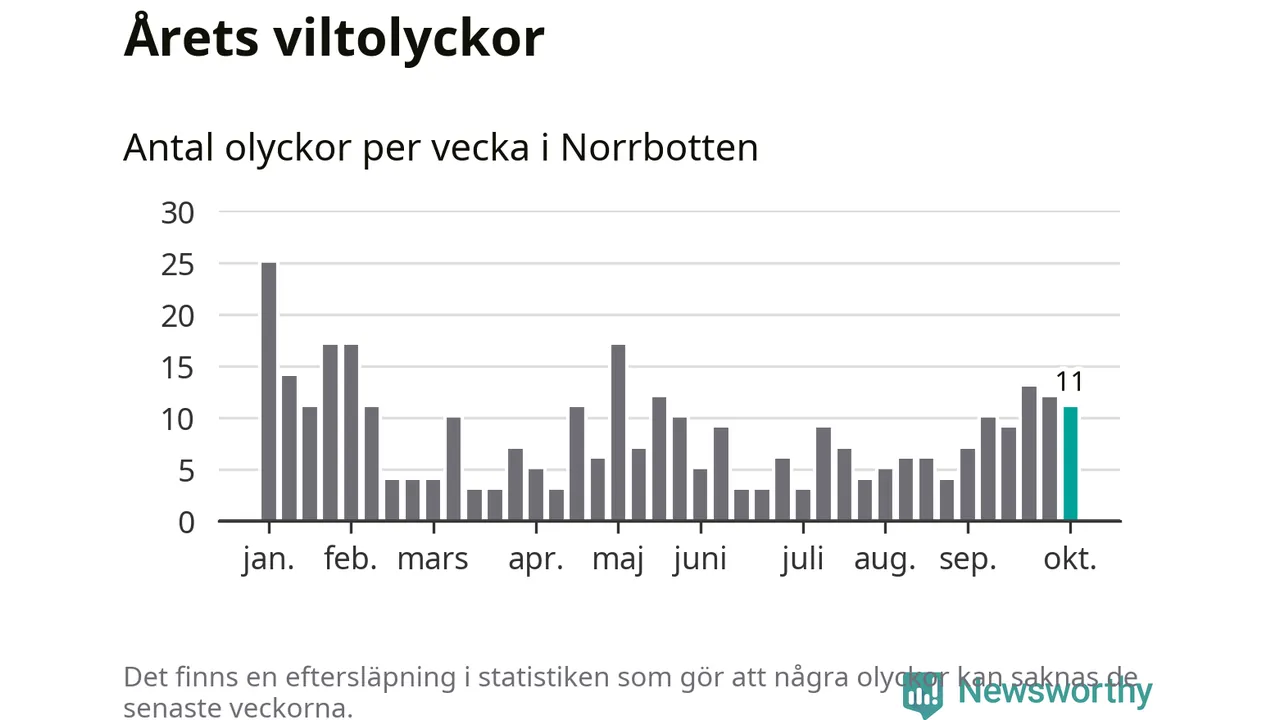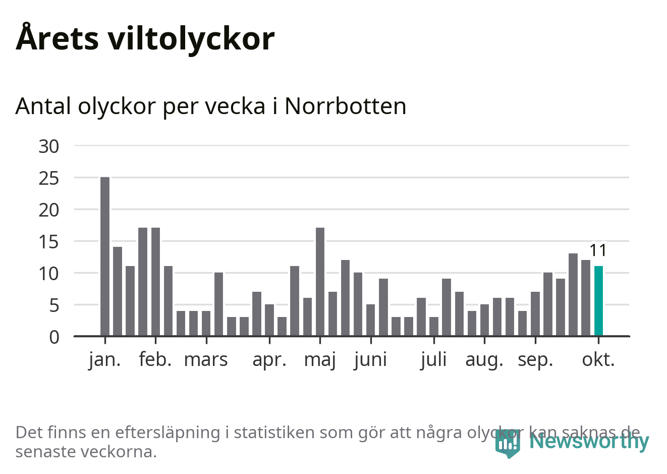 343 viltolyckor i länet. Det är en normal nivå i förhållande till hur det har sett ut under de senaste tio åren – genomsnittet för motsvarande period är 350.