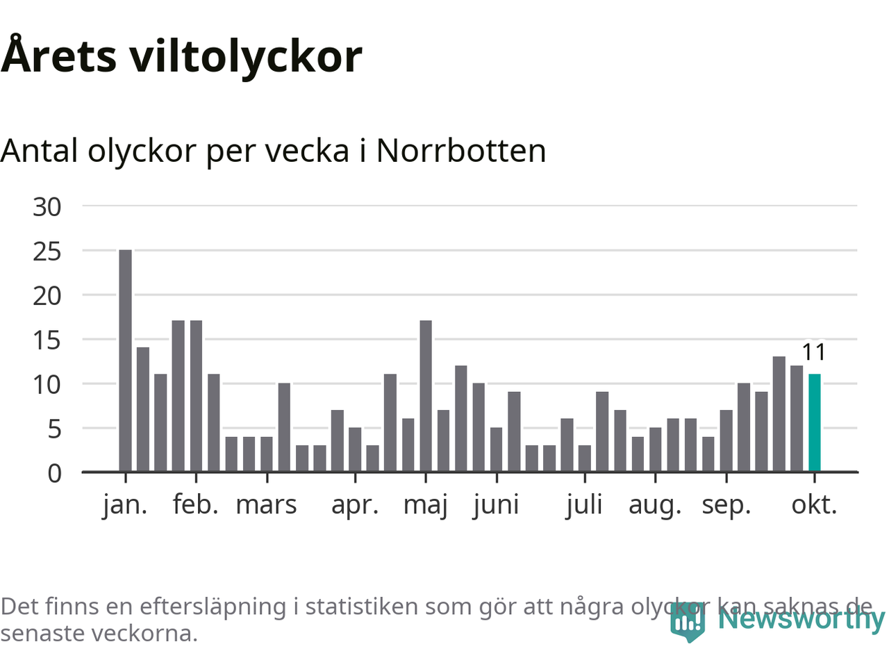 Till påkört vilt räknas även djur som inte kunnat återfinnas. Här visas de olyckor som rapporterats in hitills. Det förekommer felrapporteringar, och det dröjer också ibland innan en olycka rapporteras.