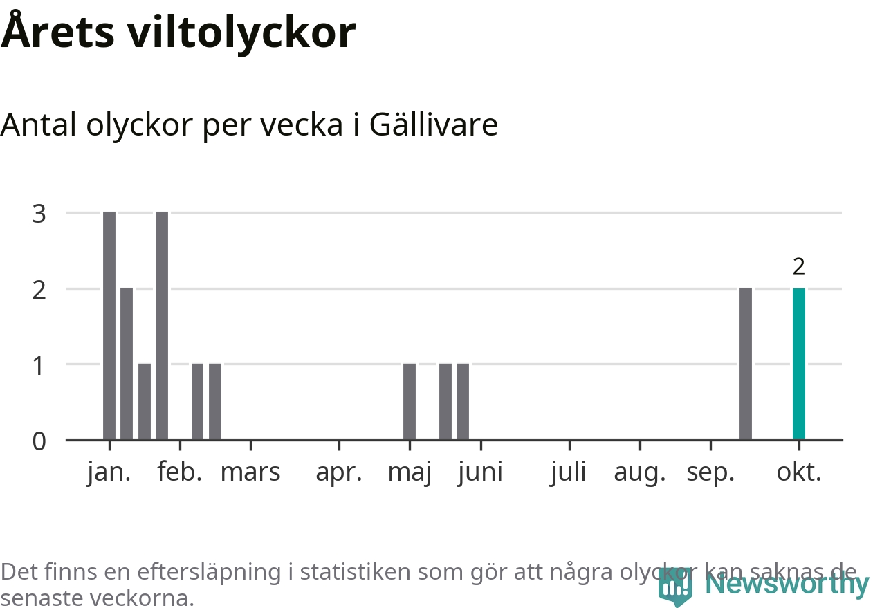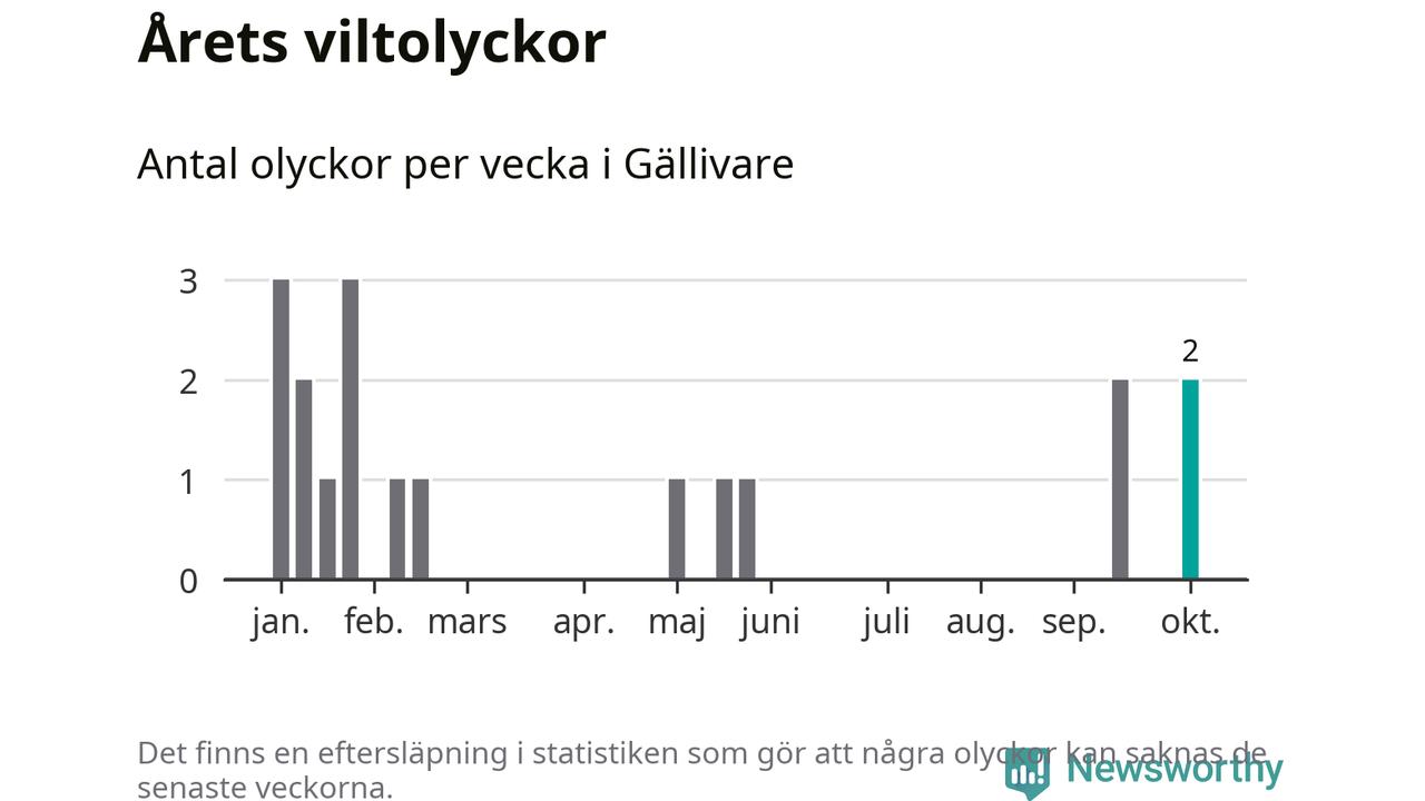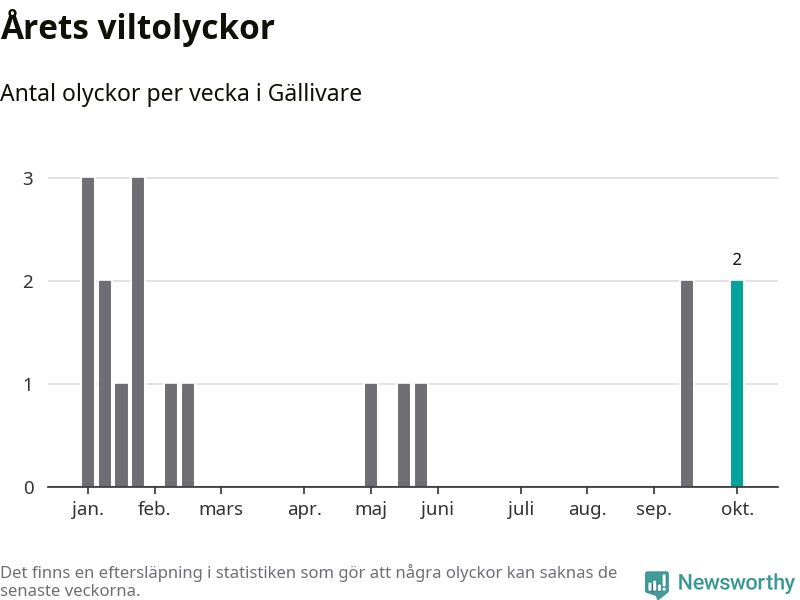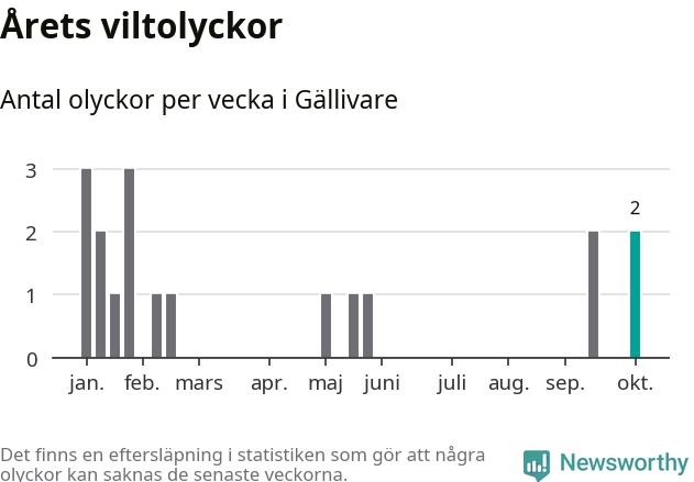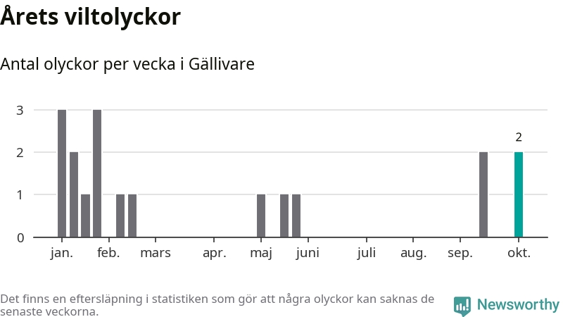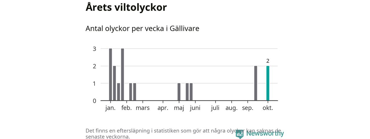 Hittills har två viltolyckor rapporterats in i Gällivare kommun från vecka 41. Se listan här.