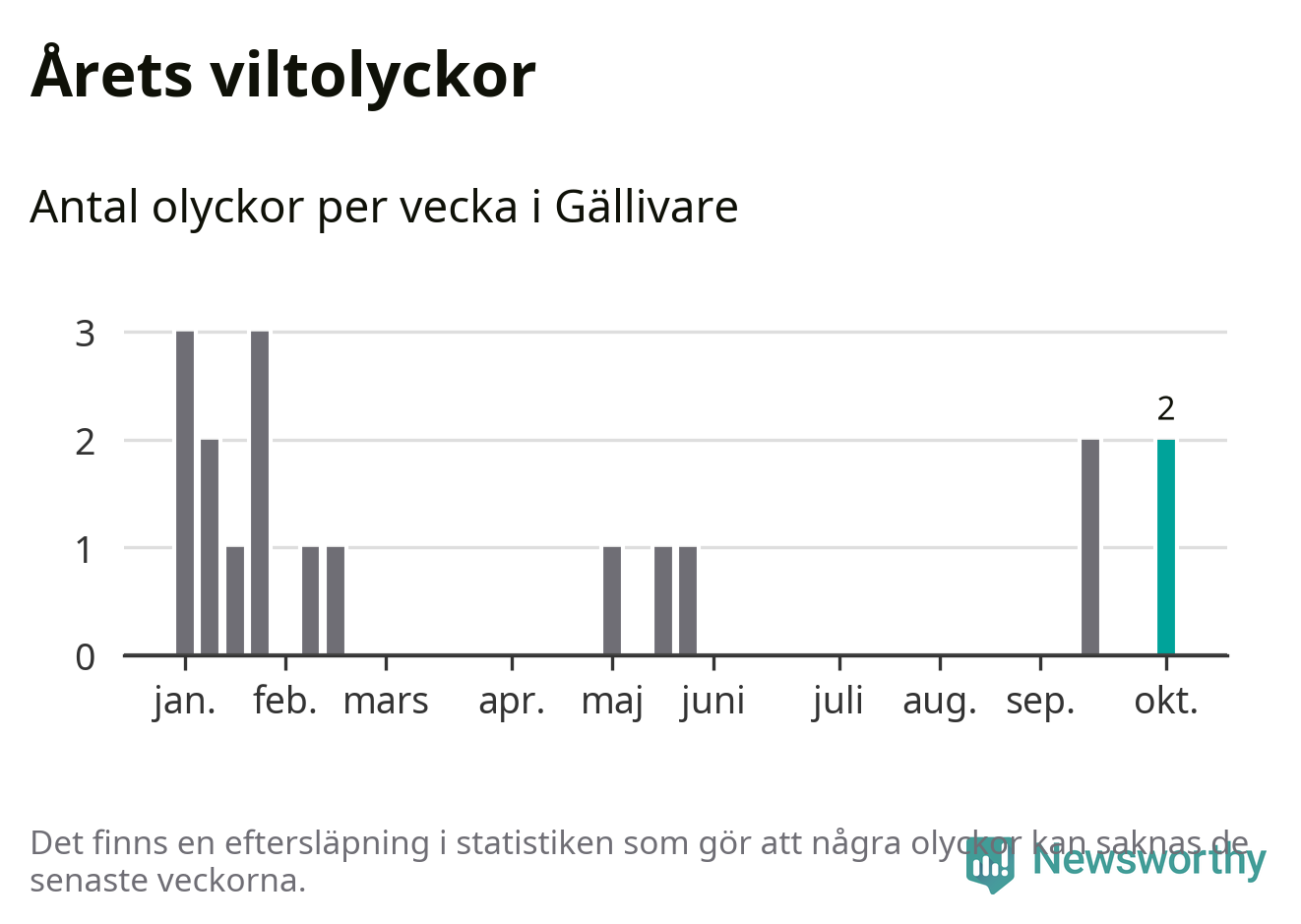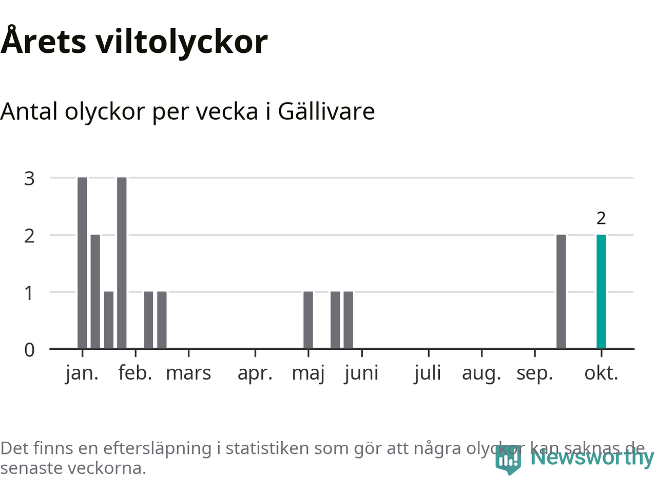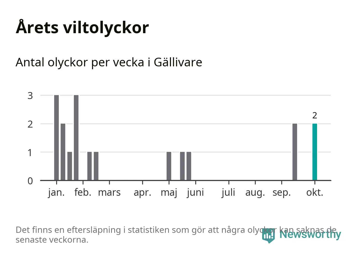 Hittills har två viltolyckor rapporterats in i Gällivare kommun från vecka 41. Se listan här.
