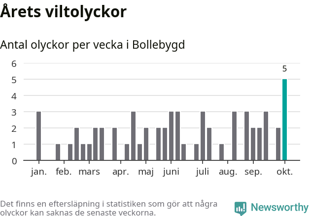 Hittills har fem viltolyckor rapporterats in i Bollebygds kommun från vecka 41. Se listan här.