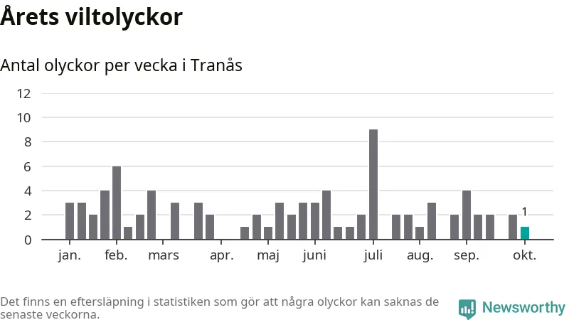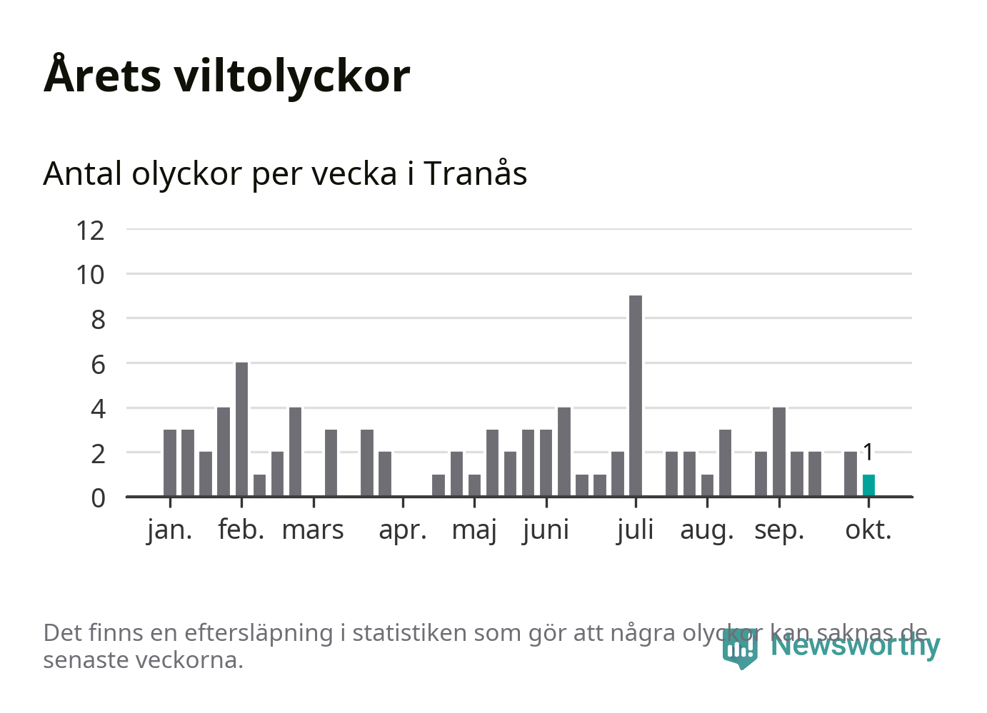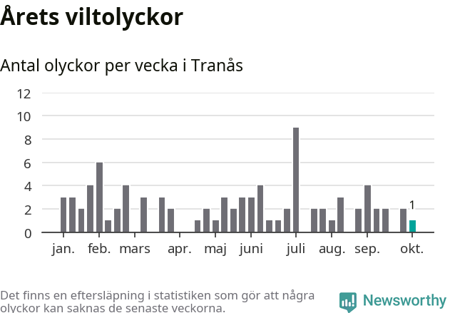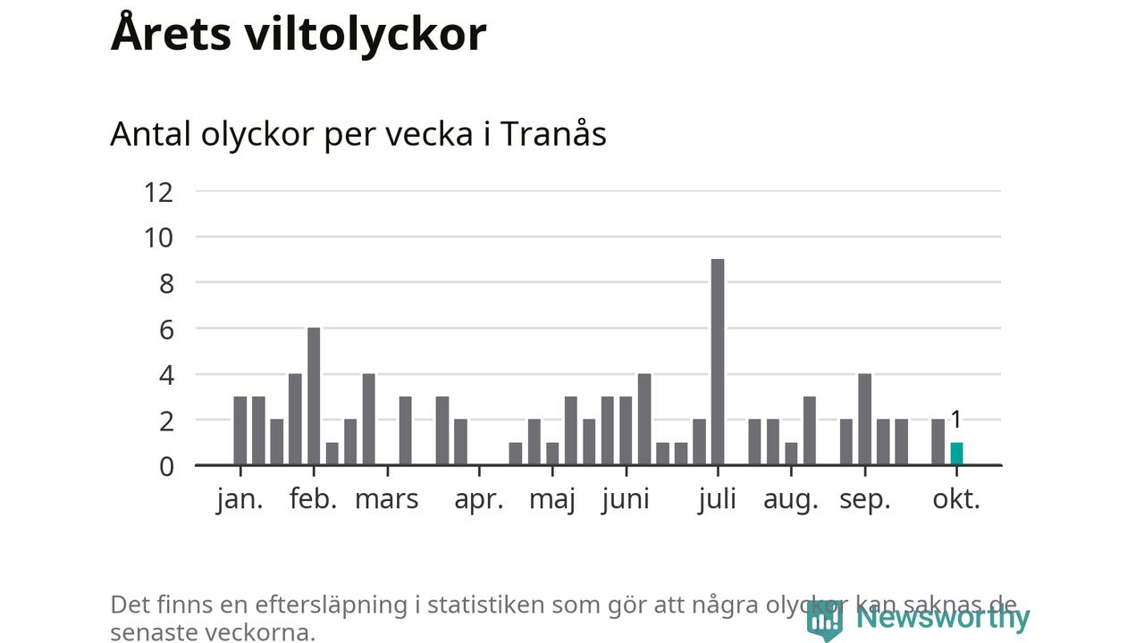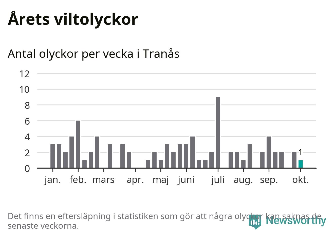 Från förra veckan (vecka 41) har hittills en viltolycka rapporterats in i Tranås kommun.