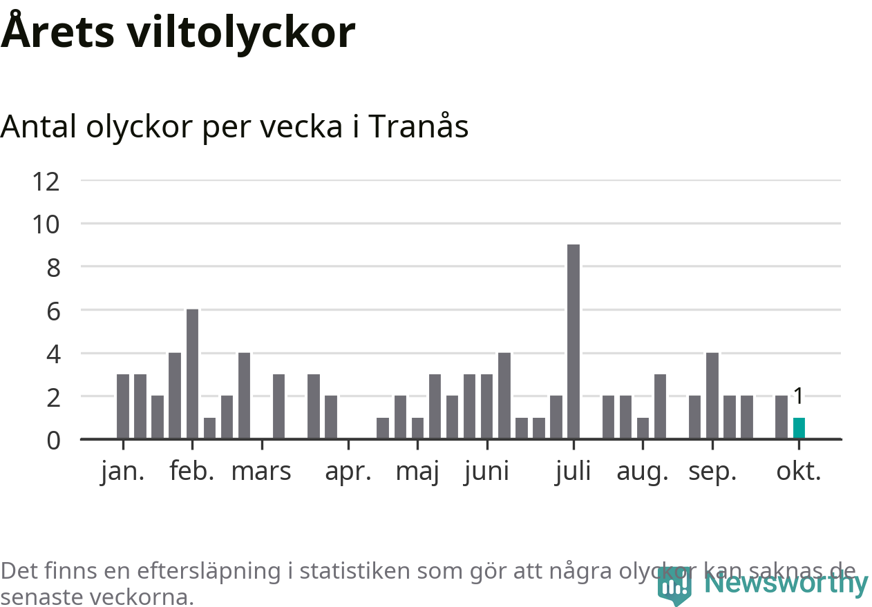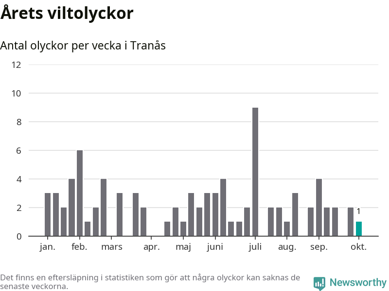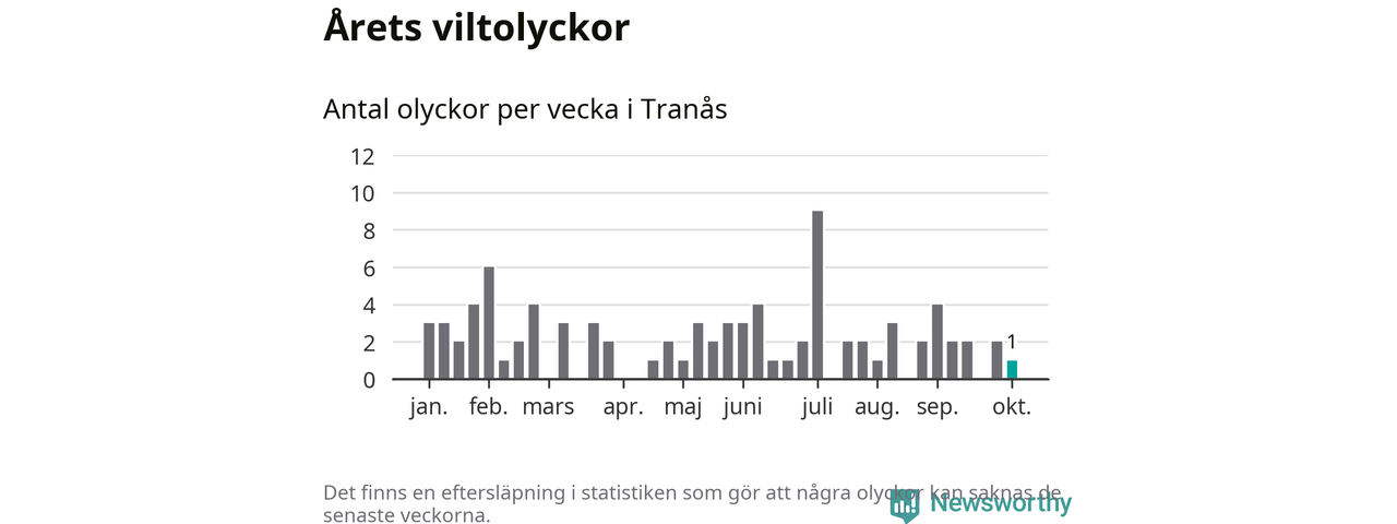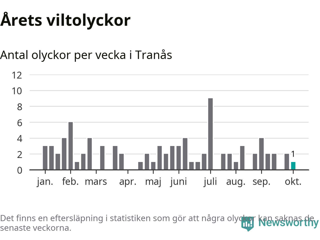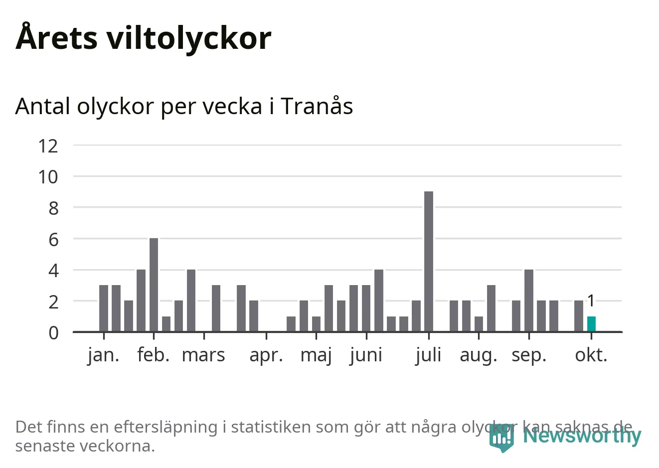 Från förra veckan (vecka 41) har hittills en viltolycka rapporterats in i Tranås kommun.