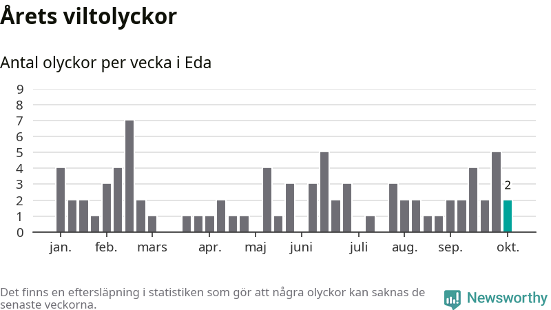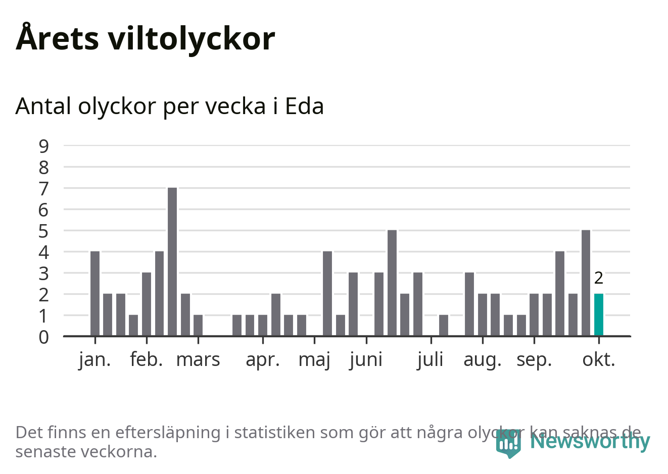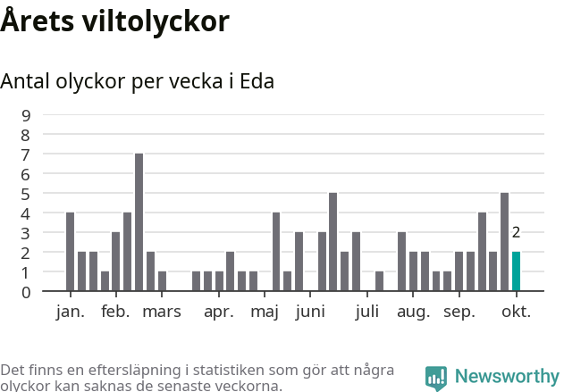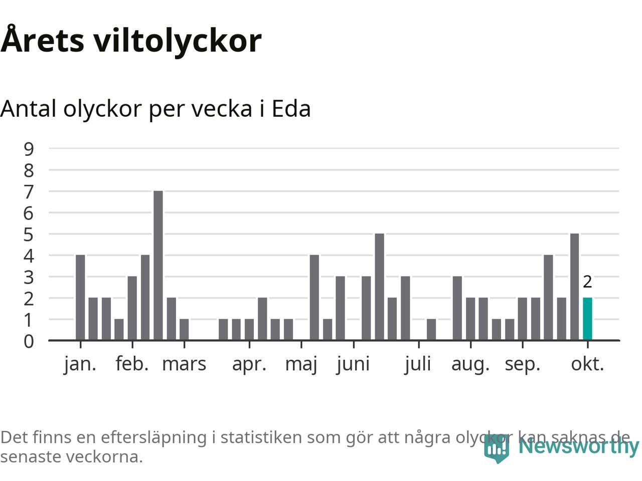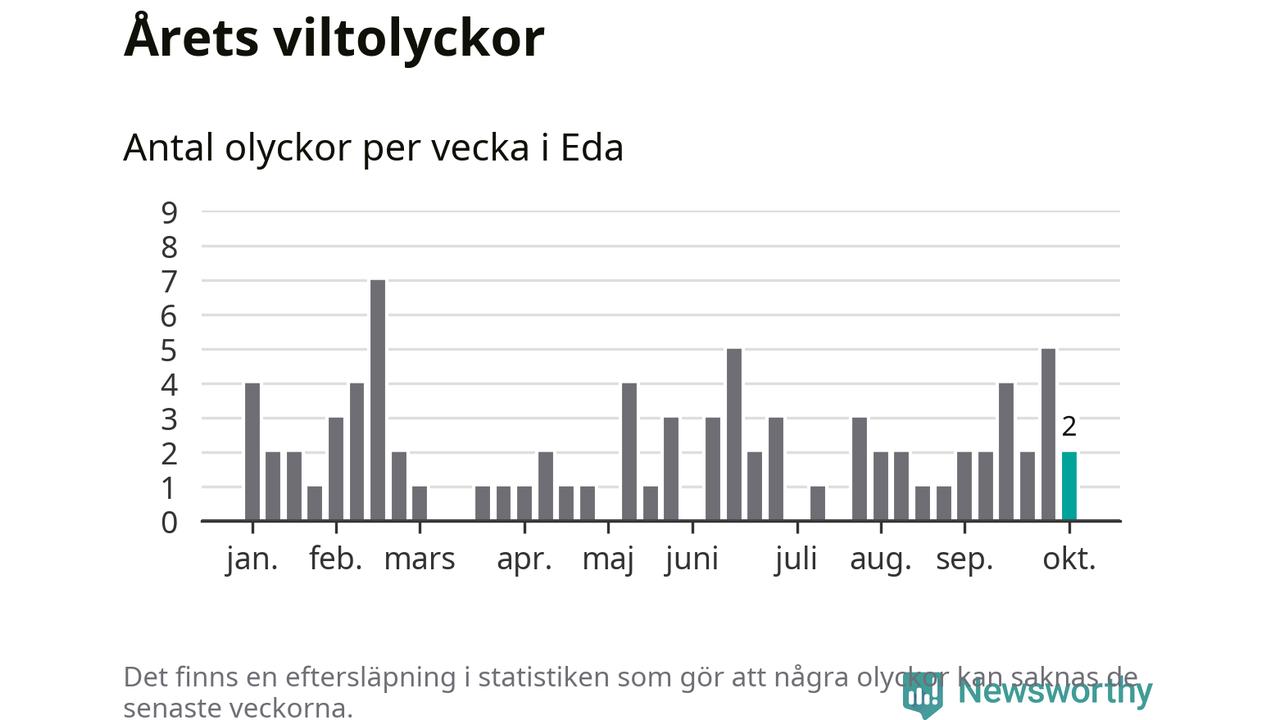 Hittills har två viltolyckor rapporterats in i Eda kommun från vecka 41. Se listan här.