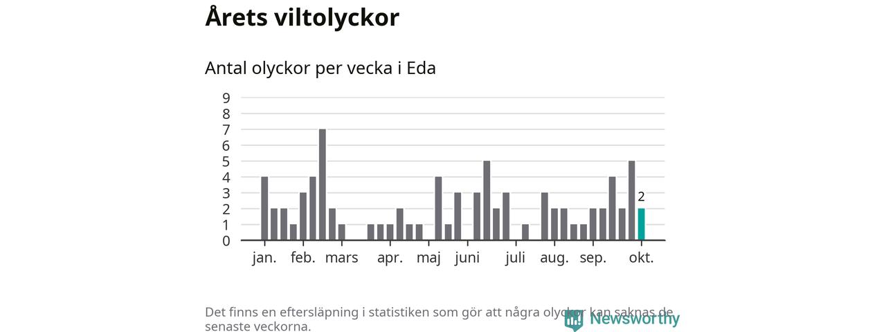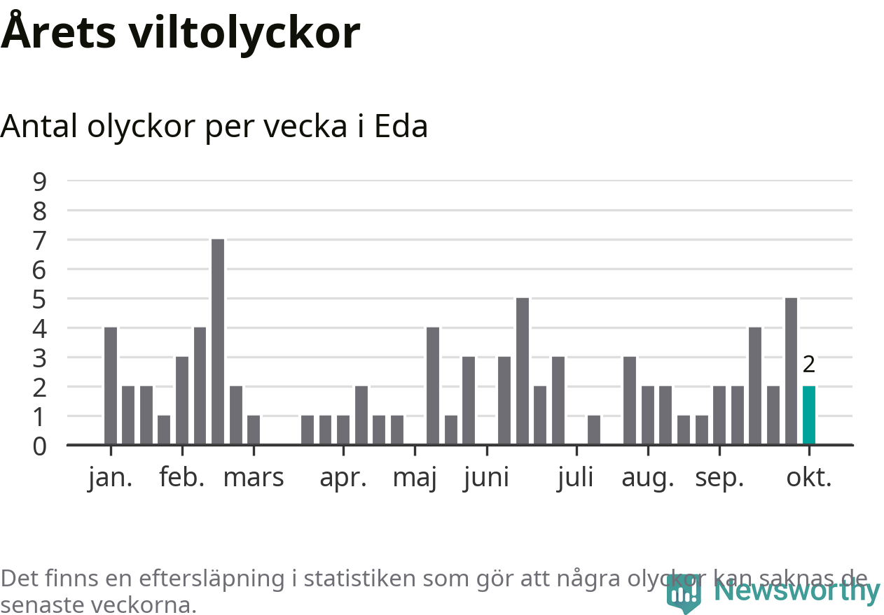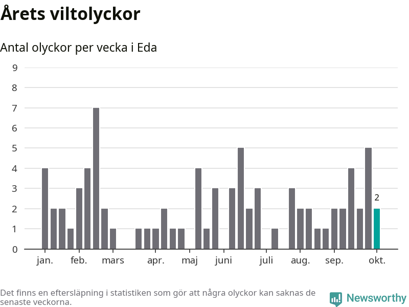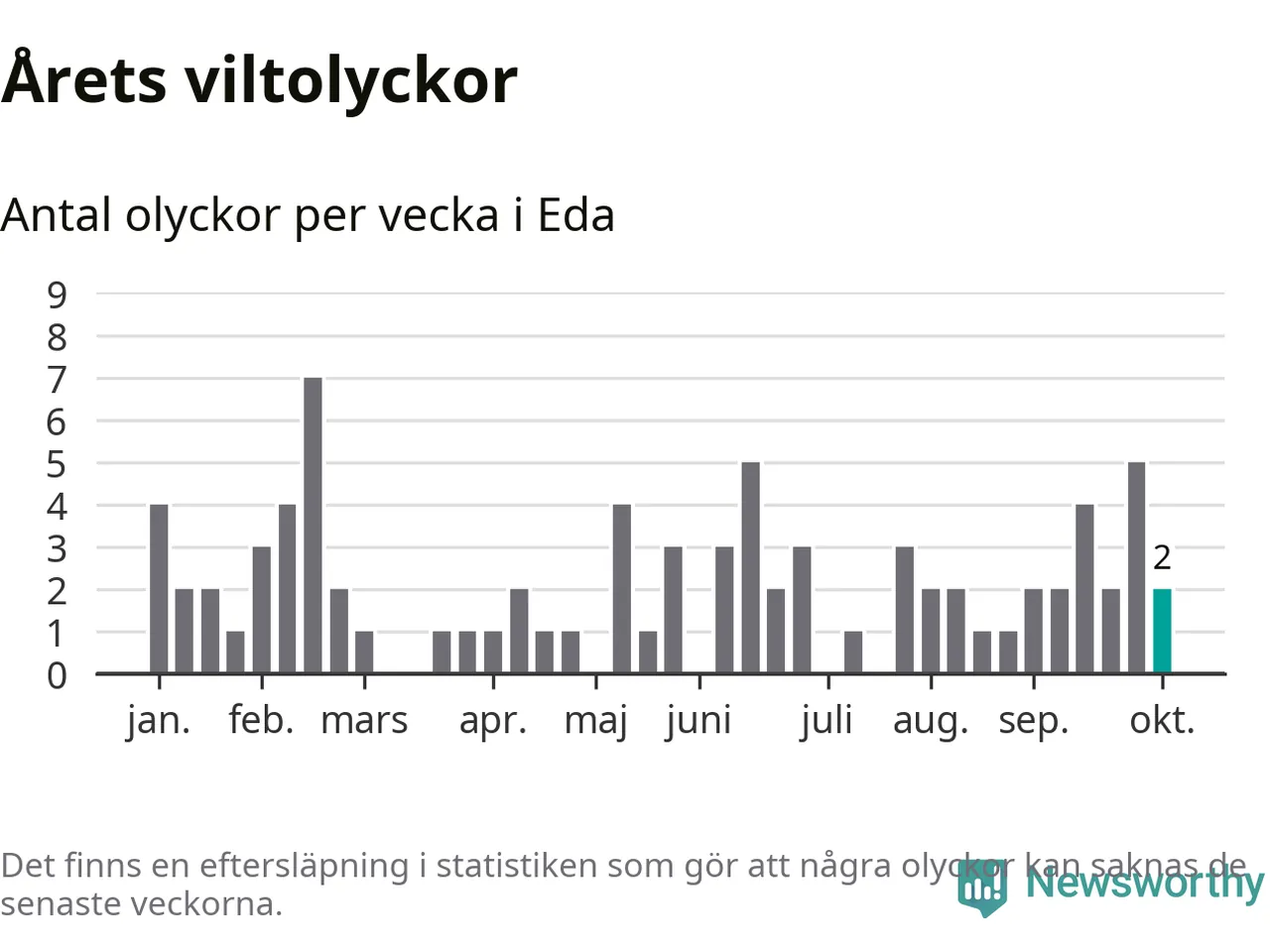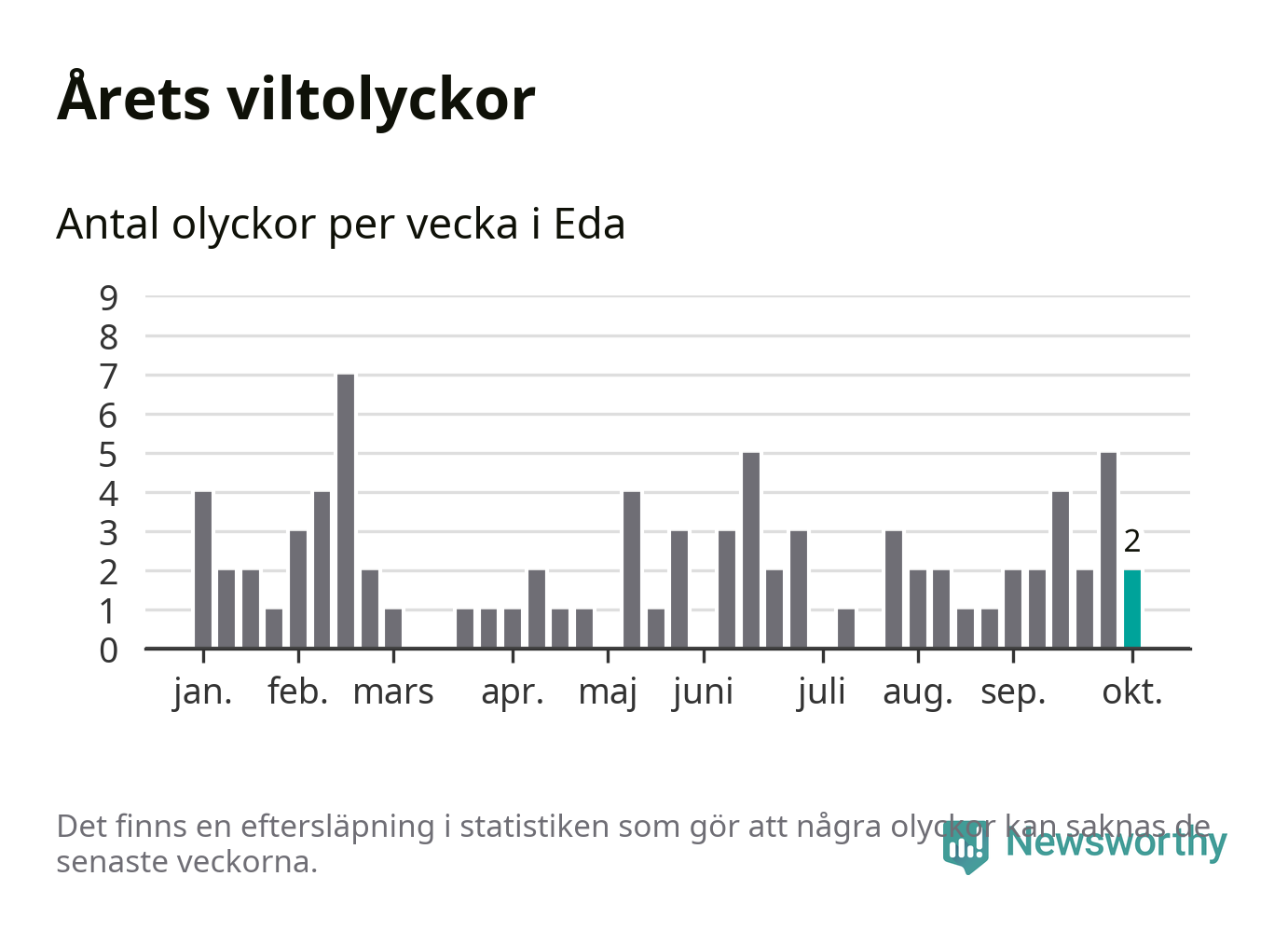 Hittills har två viltolyckor rapporterats in i Eda kommun från vecka 41. Se listan här.