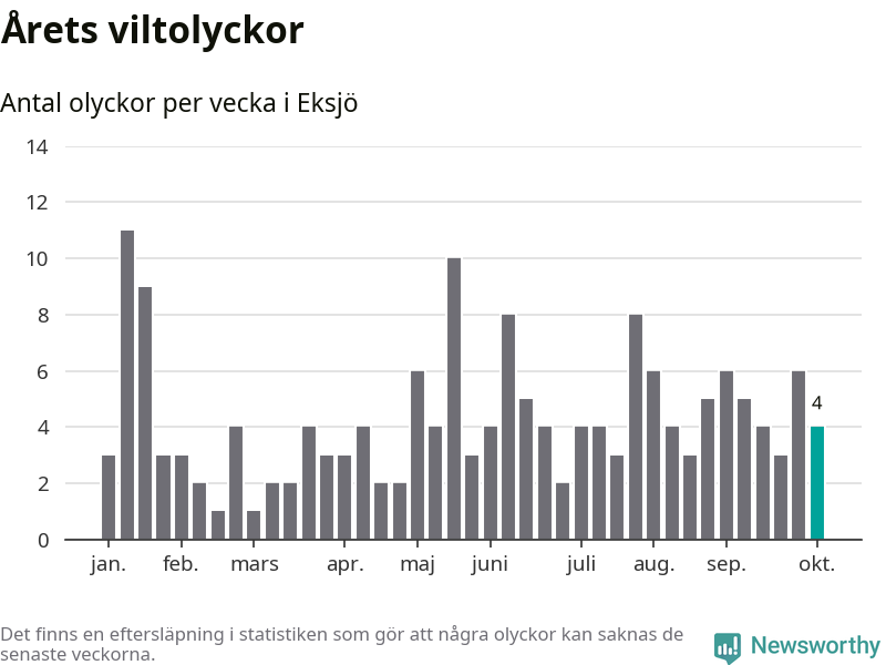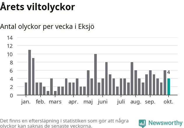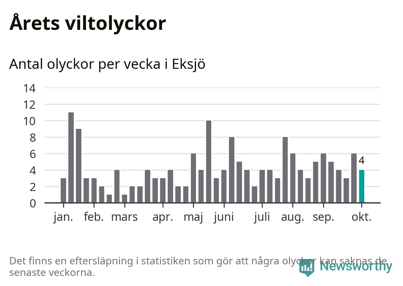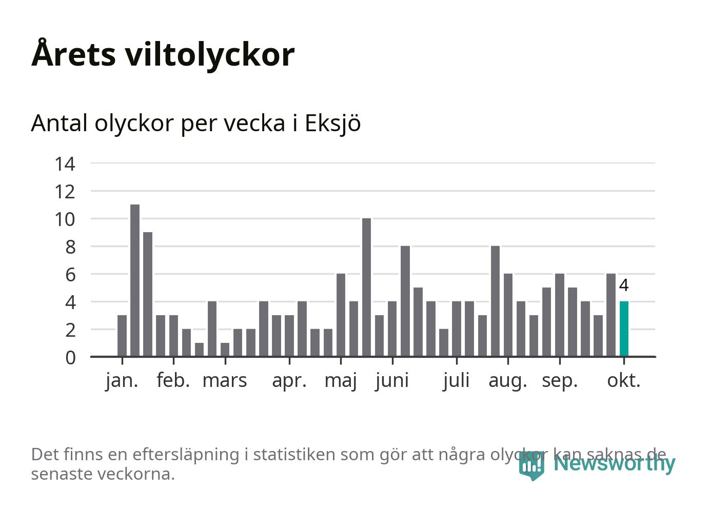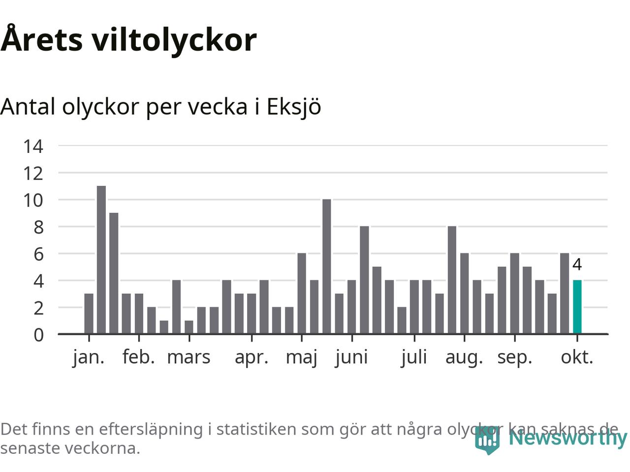 Hittills har fyra viltolyckor rapporterats in i Eksjö kommun från vecka 41. Se listan här.