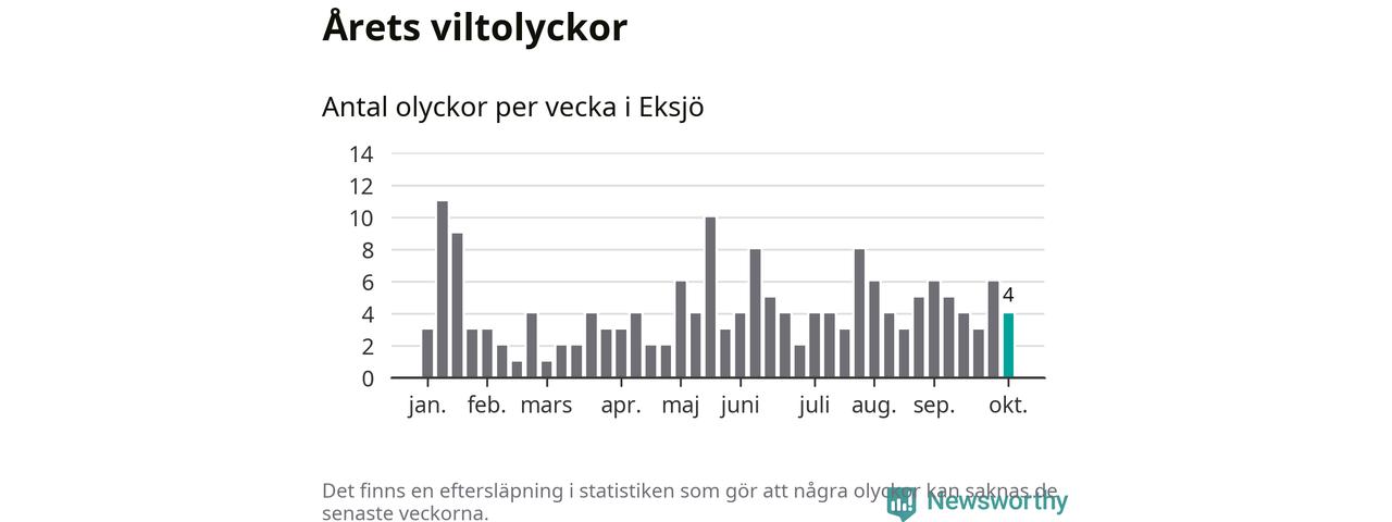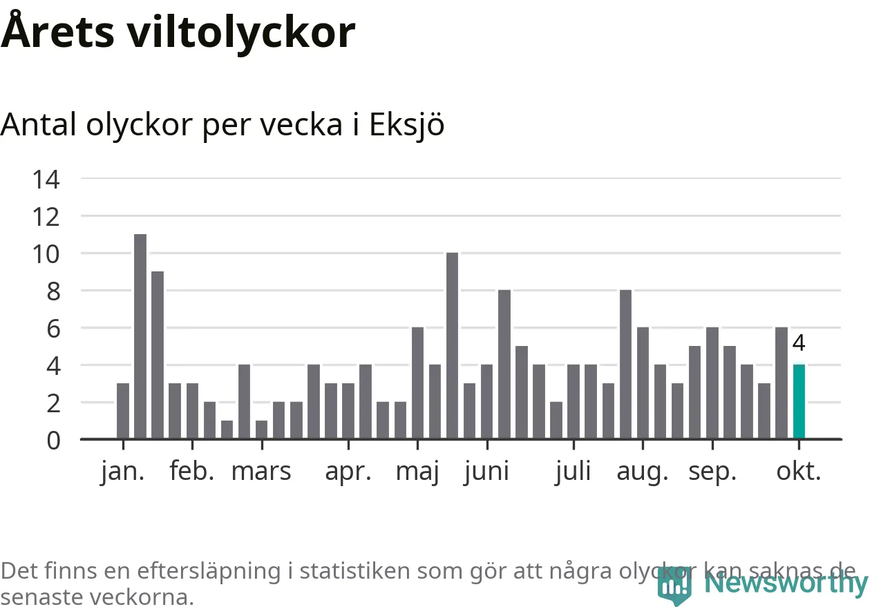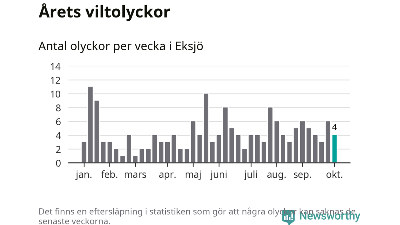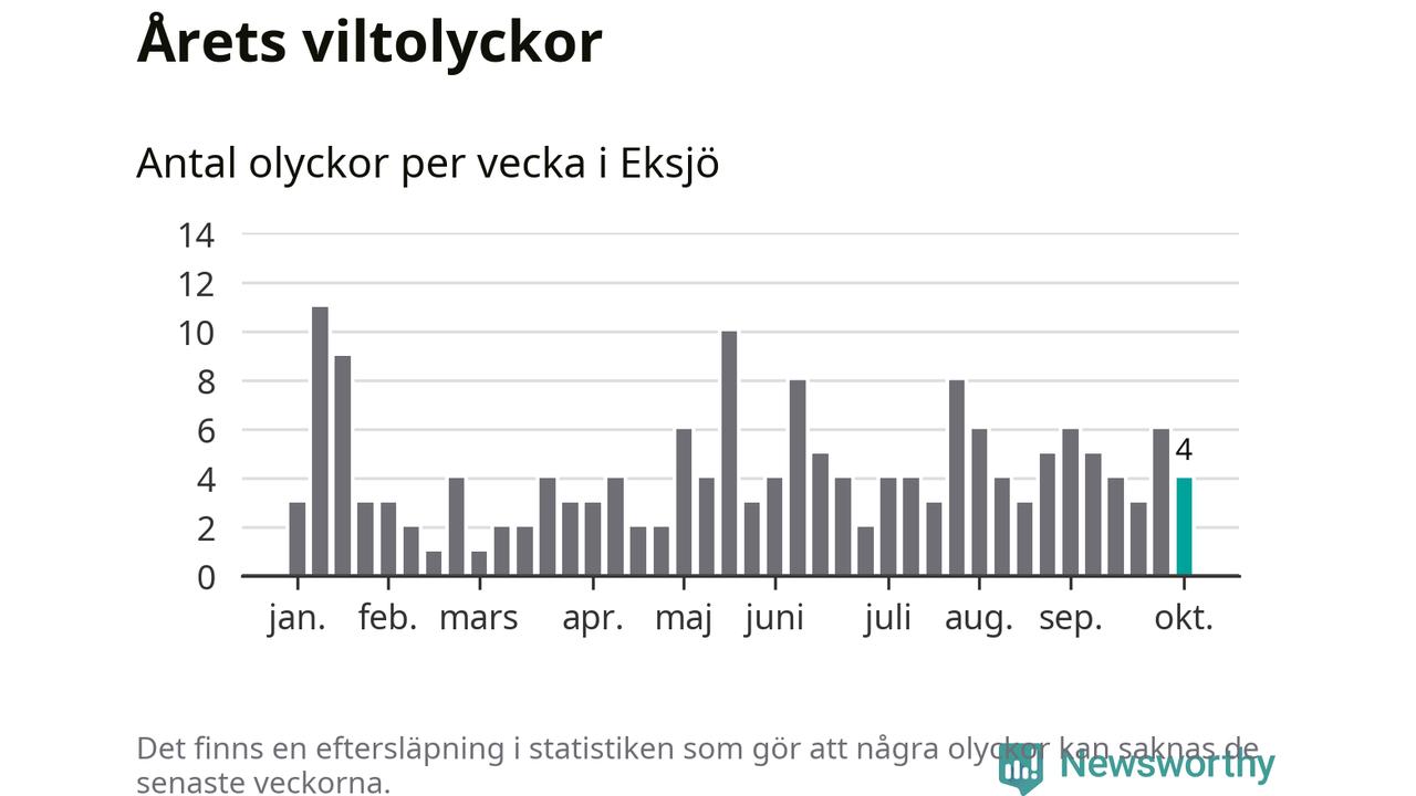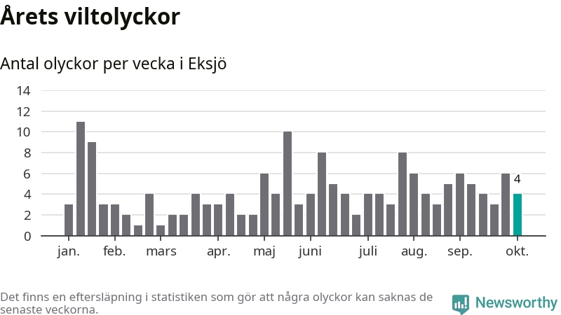 Hittills har fyra viltolyckor rapporterats in i Eksjö kommun från vecka 41. Se listan här.