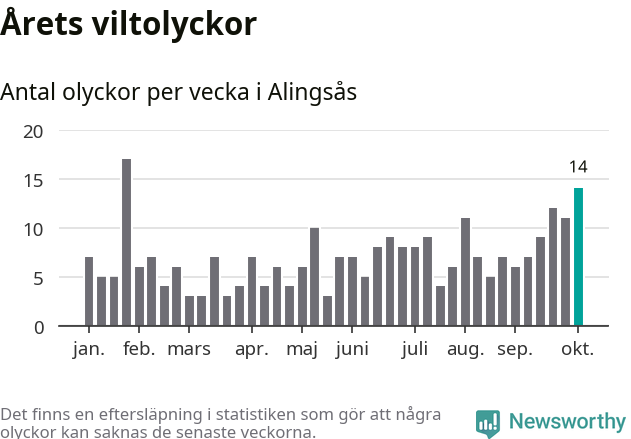 Hittills har 14 viltolyckor rapporterats in i Alingsås kommun från vecka 41. Se listan här.