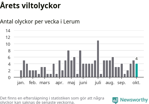 Hittills har fyra viltolyckor rapporterats in i Lerums kommun från vecka 41. Se listan här.