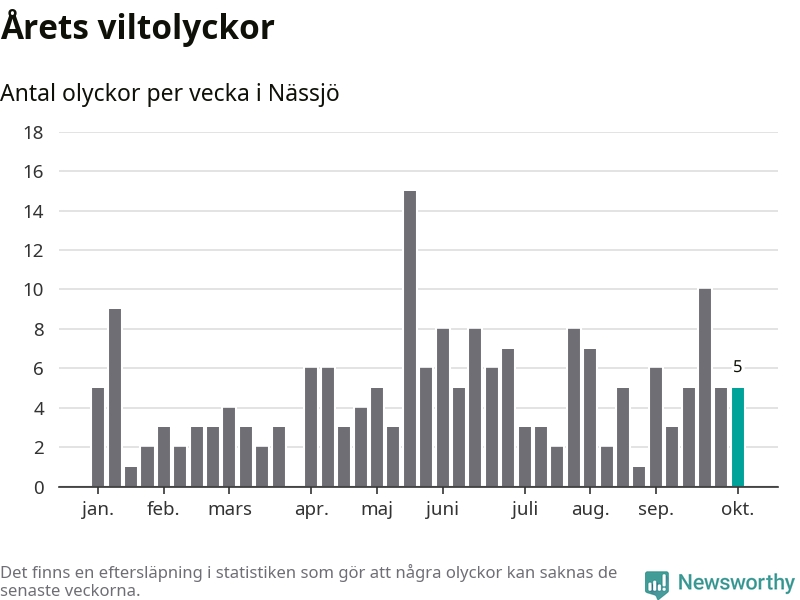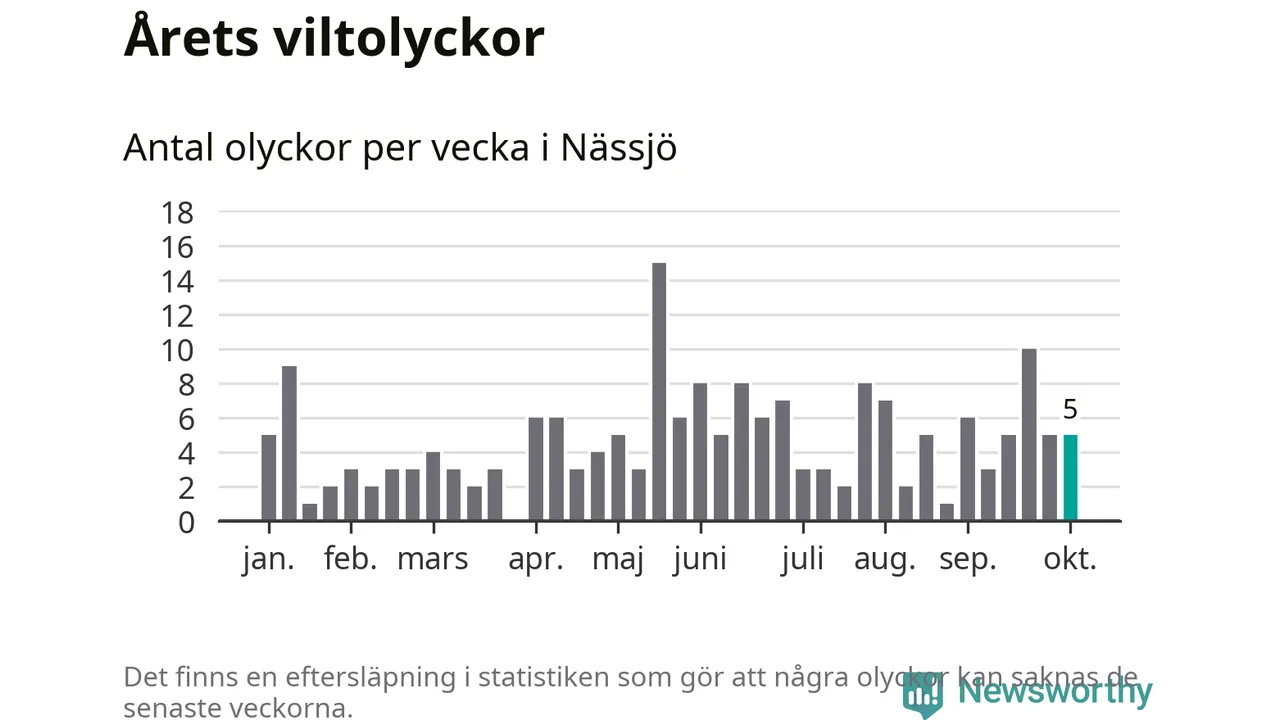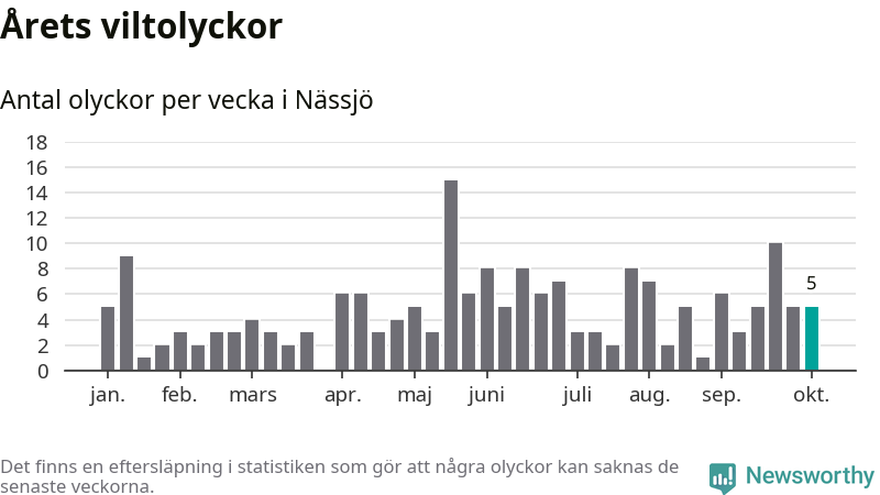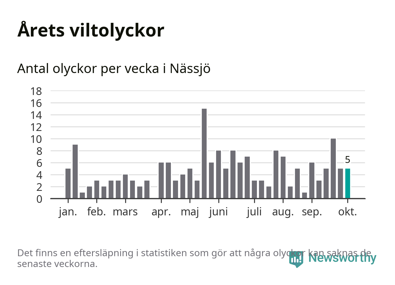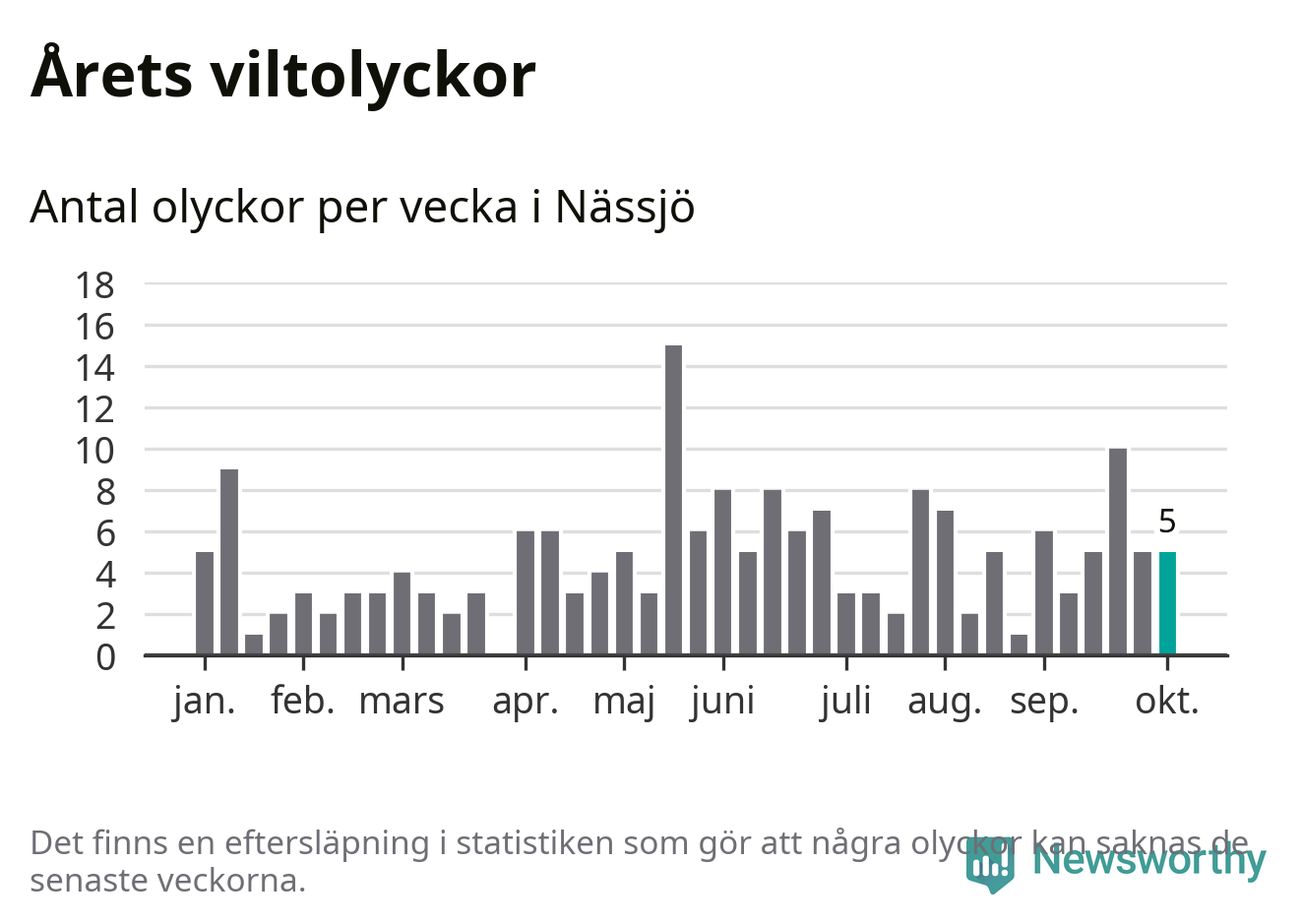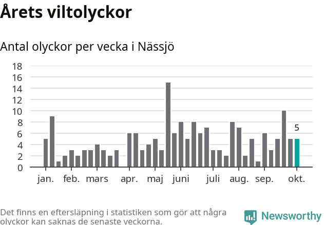 Hittills har fem viltolyckor rapporterats in i Nässjö kommun från vecka 41. Se listan här.